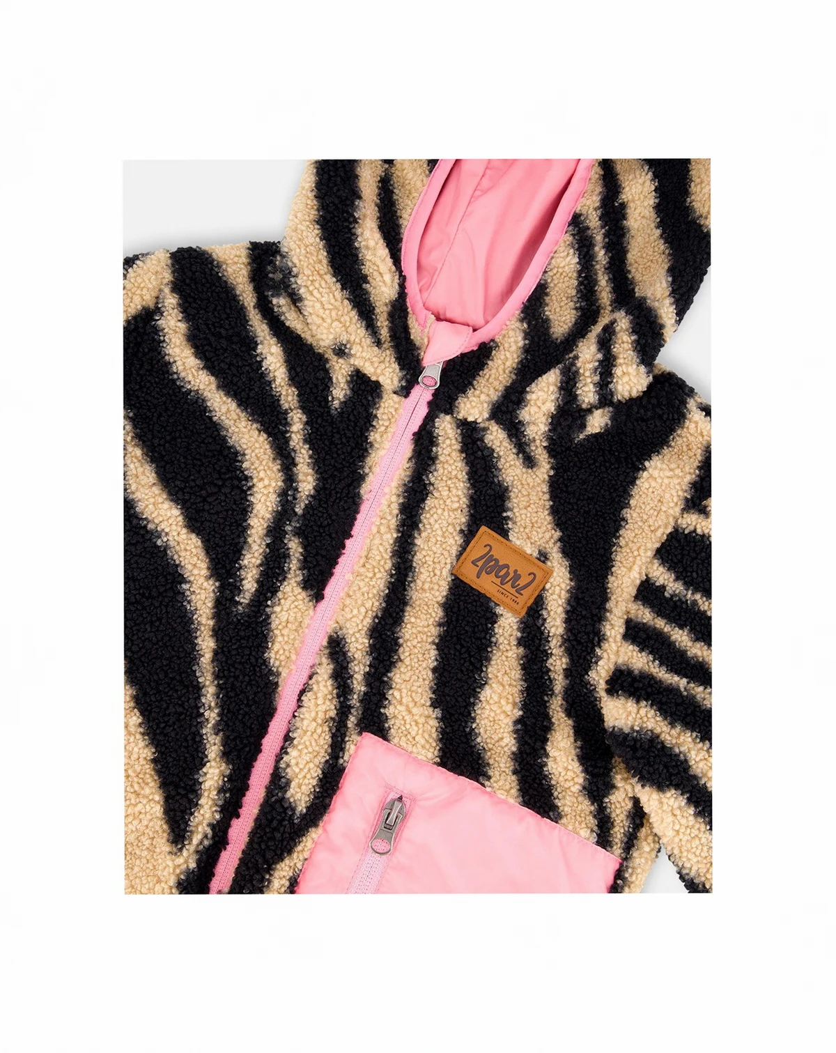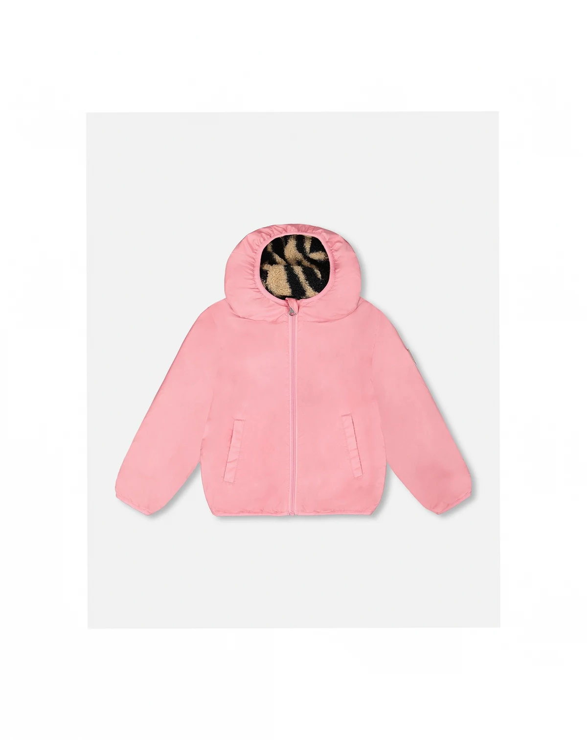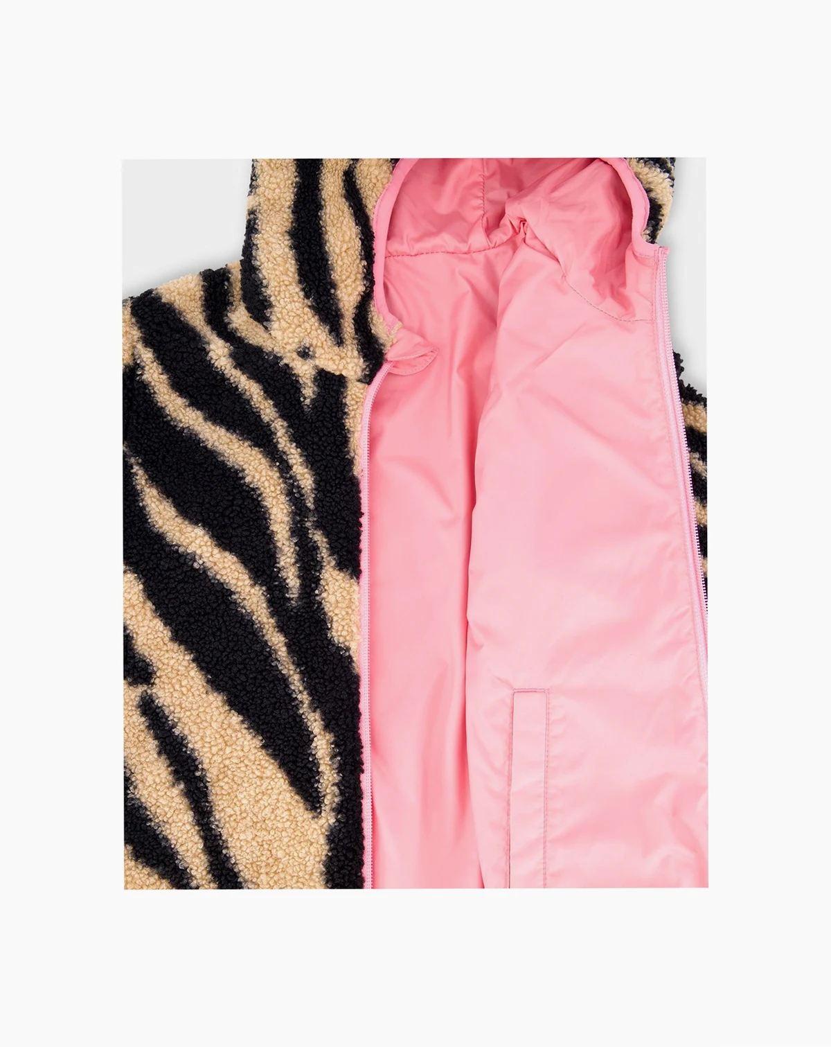 Reversing from polyurethane-coated oxford to animal print sherpa fabric, this mid-season outerwear offers a double dose of versatility. Detailed with a zip front closure, pockets on both sides, and an attached hood, the solid side of this reversible jacket is dirt-repellent and waterproof, making it perfect for wearing on chilly, wet days.