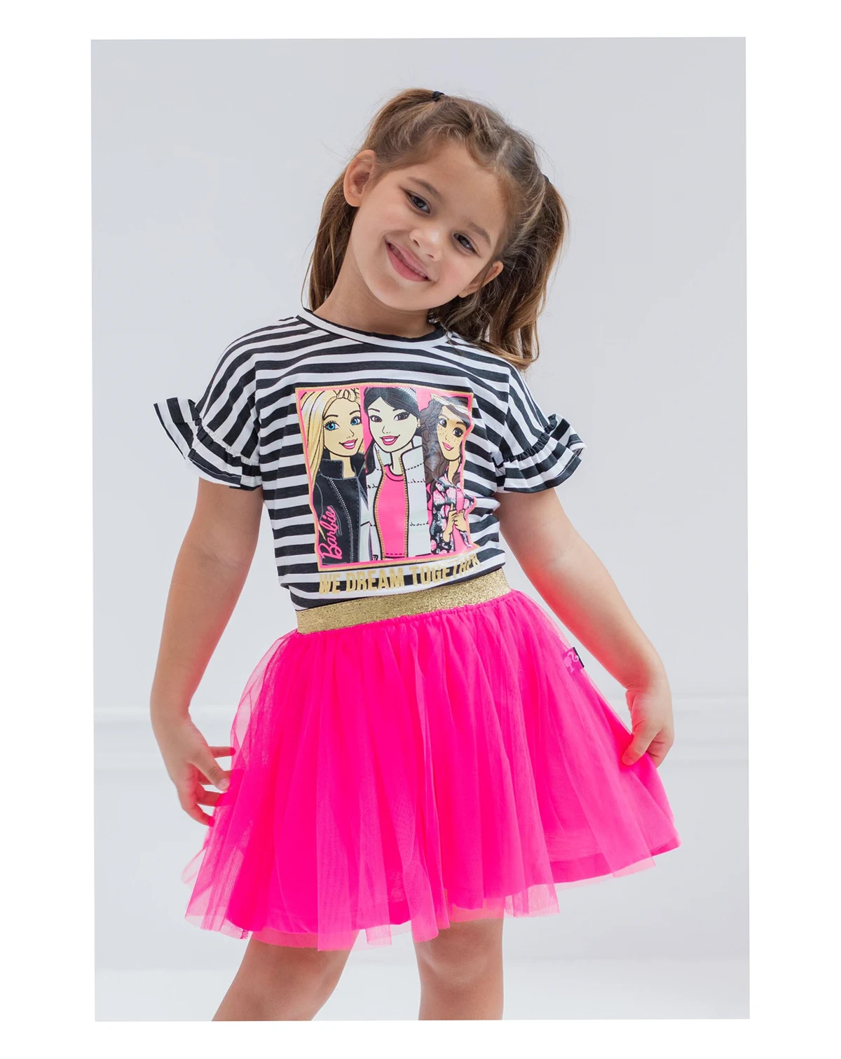 Embrace Barbie's style with this cute Short Sleeve T-Shirt and Tutu Skirt set, inspiring unique looks. Barbie's confidence and happy attitude come to life in this fashionista's dream wear. Officially licensed by Mattel.