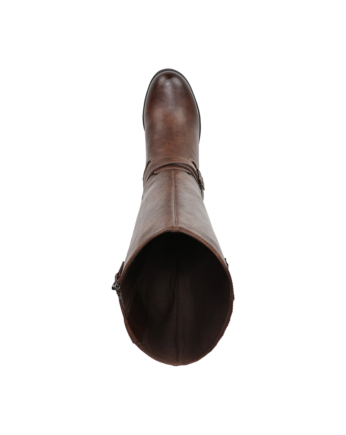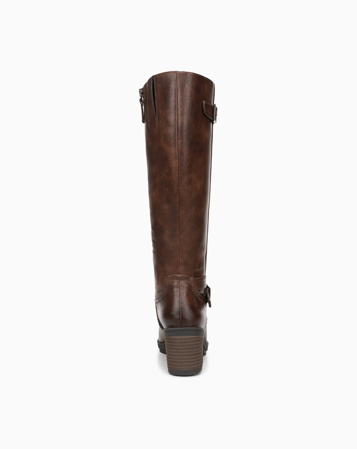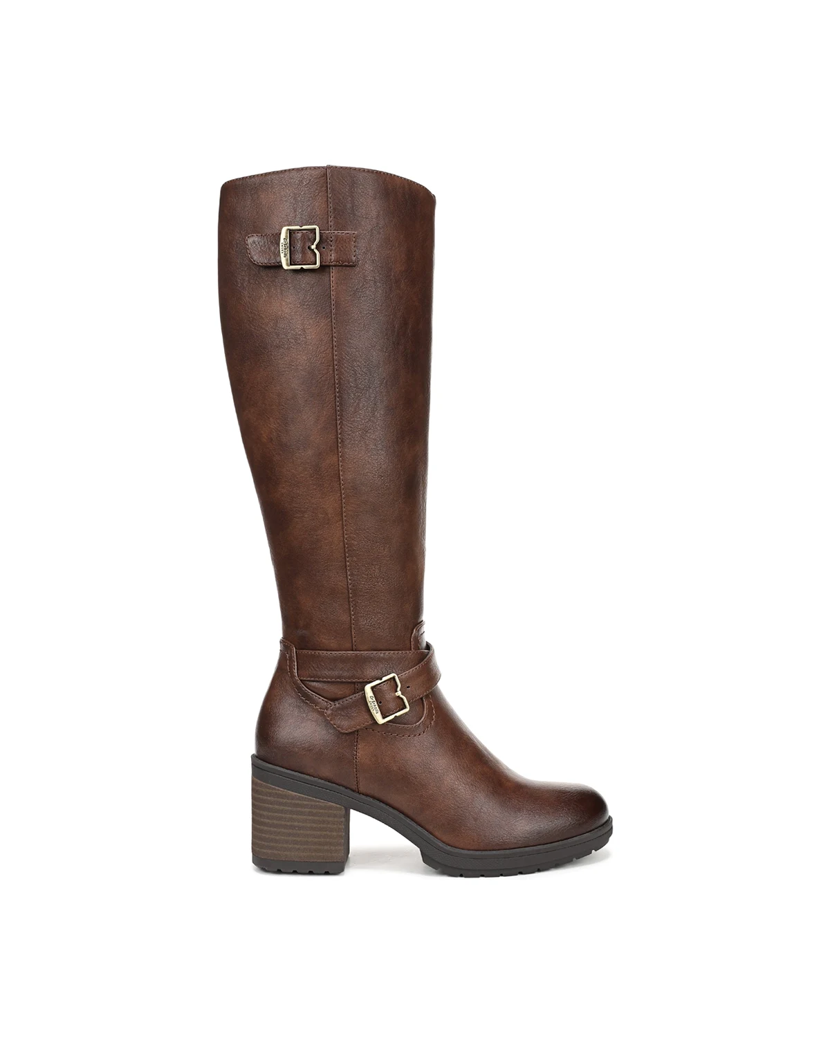 Classic women's knee high boots with a block heel and lug sole to elevate any look. MATERIALS: Faux leather with stretch fabric back panel. FIT: Side zipper for easy on-off and stretch back panel for extra flexibility. COMFORT: Anti-odor Insole Technology with cushioning, comfort, and support. Insoles crafted with cushy, algae-infused BLOOM® foam for cleaner air and water. MOVEMENT: Lightweight, flexible construction moves with you. STYLE: Women's knee high boots with strap and buckle details, 2.75-inch stacked heel, and lug outsole. Feel good boots with flair. Chic detailing and reliable comfort takes these tall women's boots to 'best walking shoes' status.