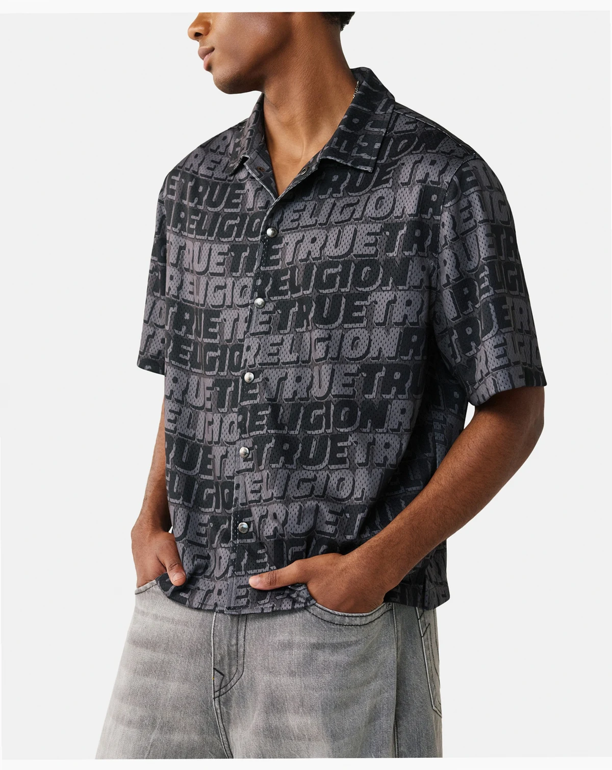 Featuring an all-over printed design, this True Religion shirt offers a classic collar and button-front closure. The breathable construction provides a casual, contemporary look.