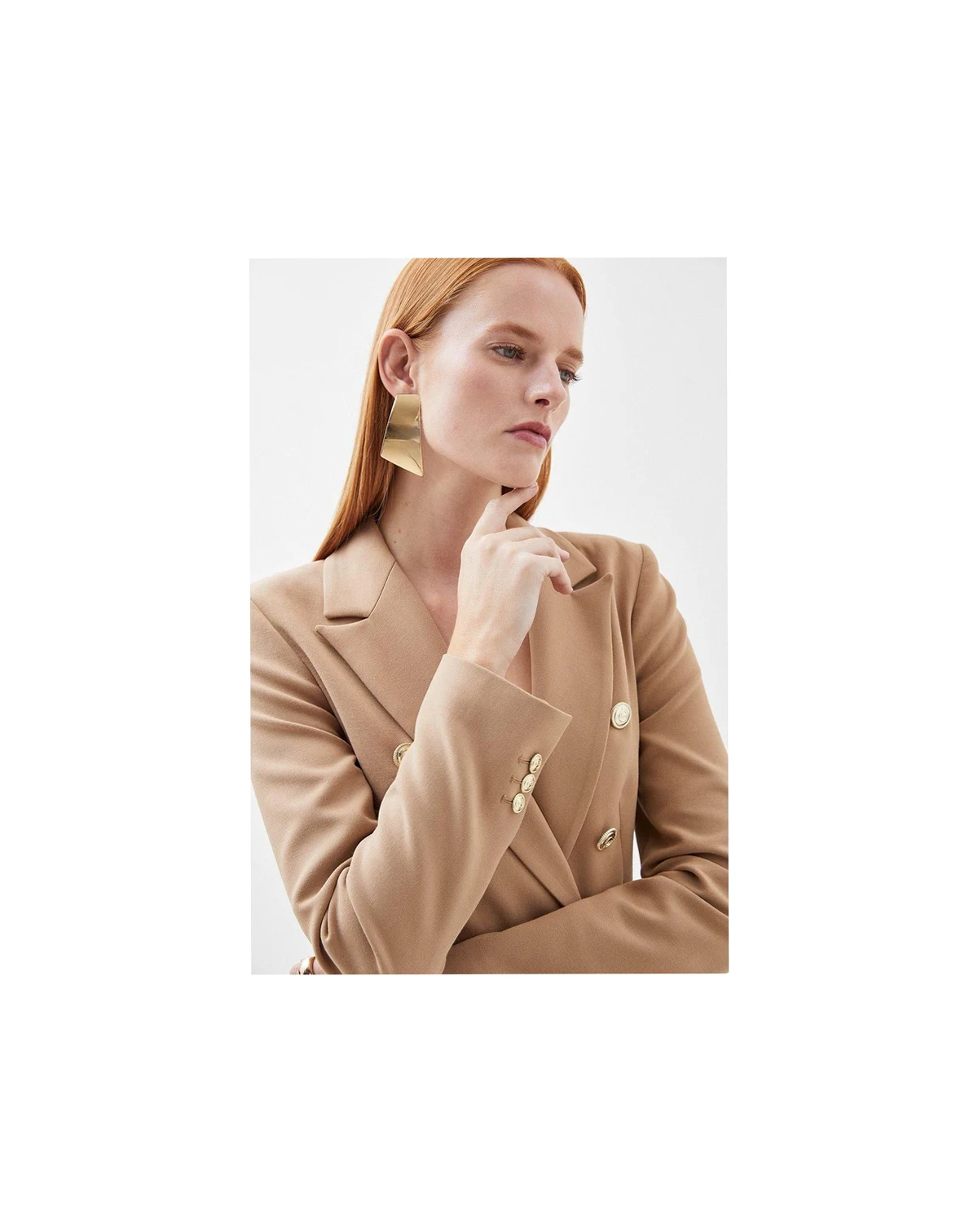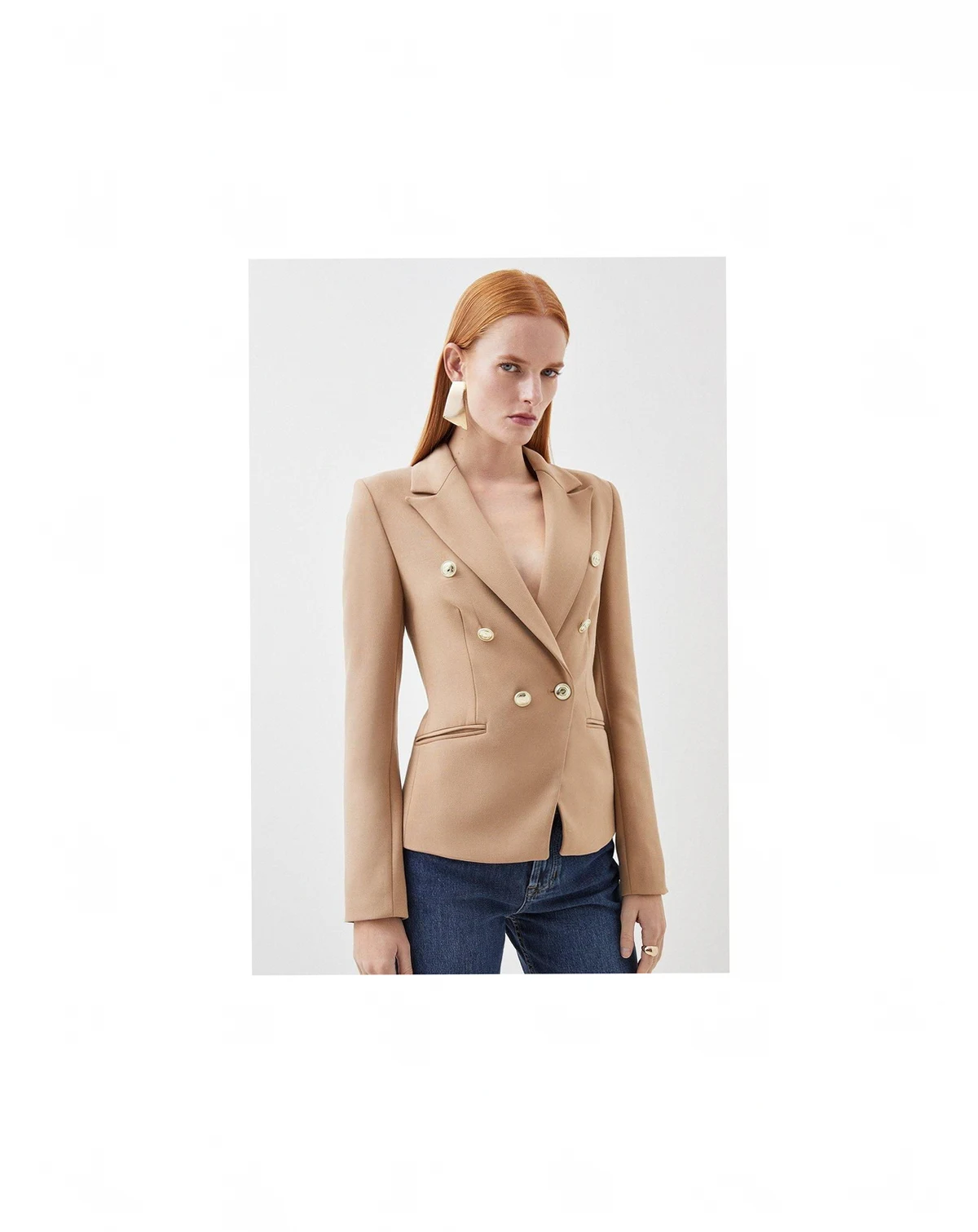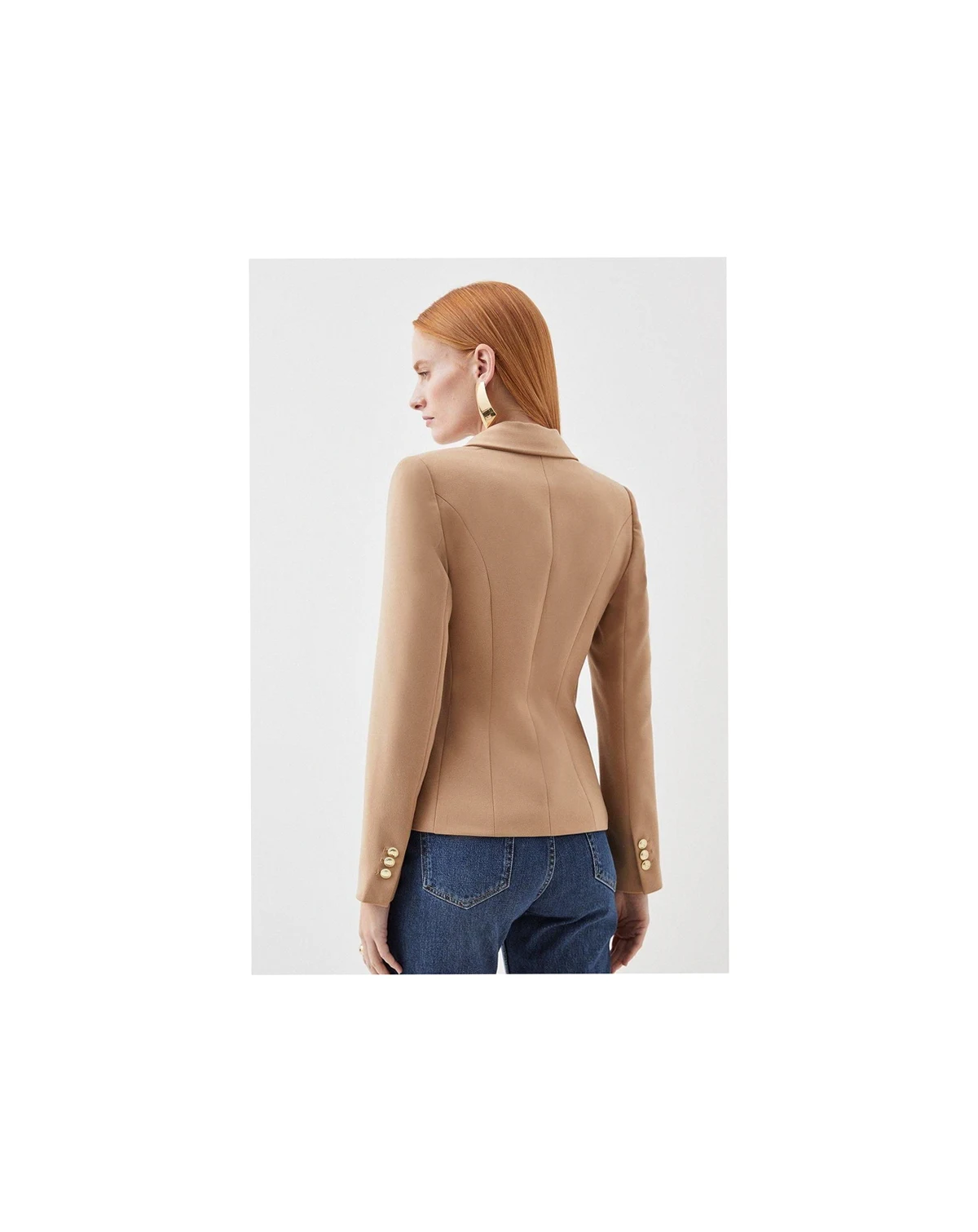 Striking double-breasted design with distinctive metallic-tone military buttons. Tailored silhouette with structured shoulders for a commanding presence. Notched lapel collar adding classic sophistication to the military-inspired aesthetic. Woven fabric with slight stretch for comfortable all-day wear. Versatile 59cm length perfect for pairing with both trousers and skirts. Command attention in this Karen Millen tailored button military blazer, a contemporary take on a timeless classic.