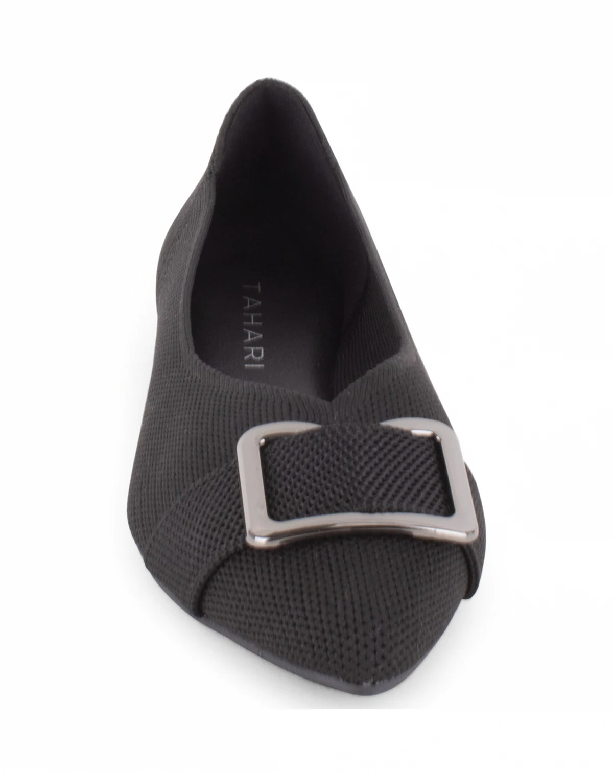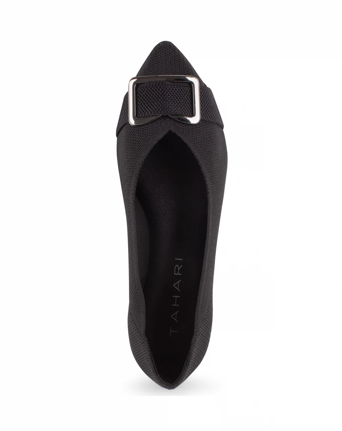 Tahari Women's Lucerne slip on ballet flat with breathable knit upper and buckle detail. Sophisticated and stylish design for all day wear and support.