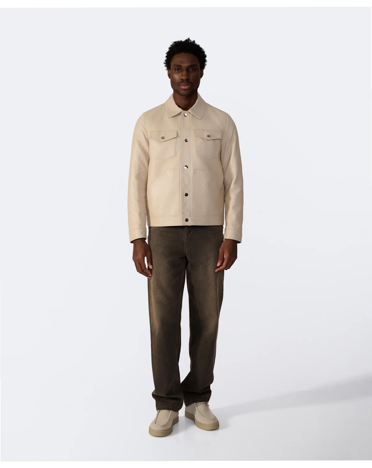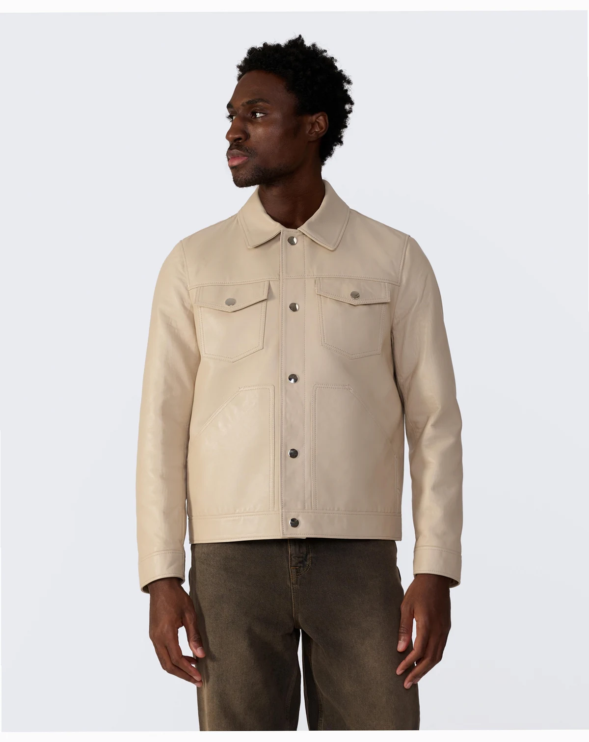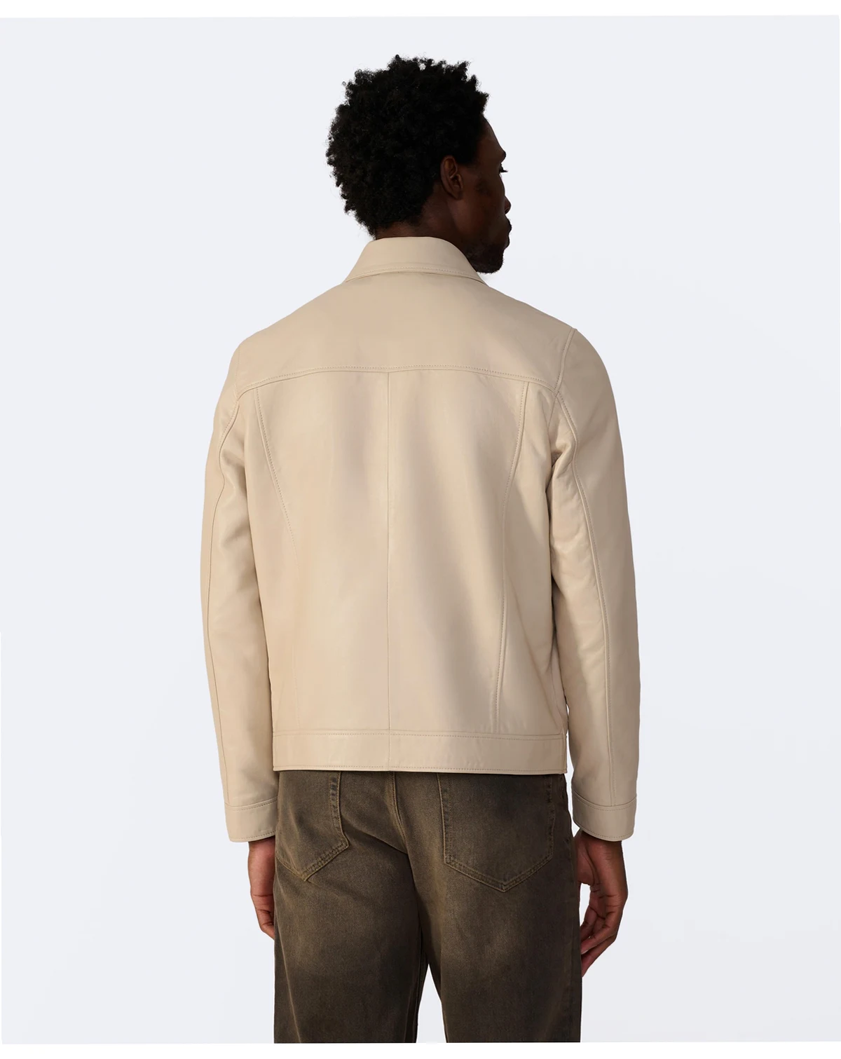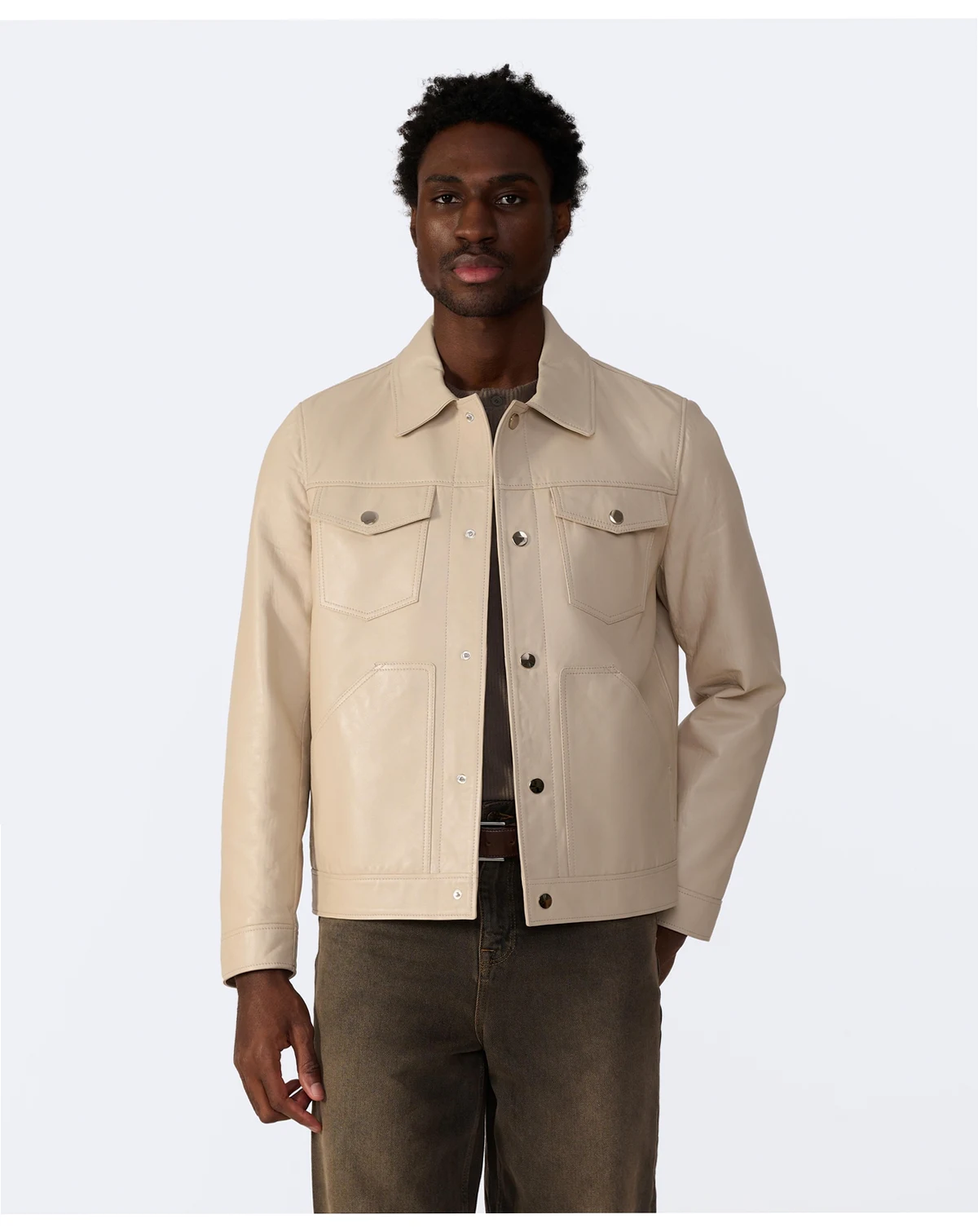 Model Height: 6 2” | Chest: 36” | Waist: 32” | Wearing Size: L Bring freshness to your spring layering with this clean-cut beige leather jacket—an elevated take on the classic trucker silhouette. Crafted from premium British leather, it s lightweight, structured, and designed for easy everyday polish.