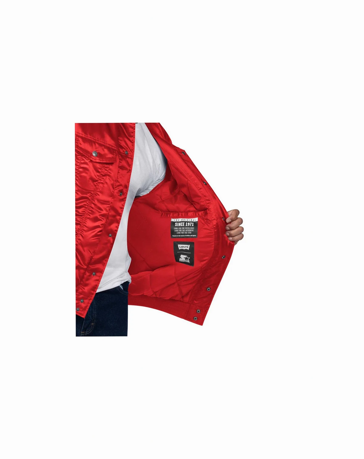 Two giants of the outerwear game, Starter and Levi's, have teamed up to knock it out of the park for Boston Red Sox fans with this Silver Tab Satin Full-Snap Trucker Jacket. It is a winning combination of iconic elements from Levi's Truckers and Starter satin jackets, including striped ribbed cuffs and hem and branded metal hardware. Soft satin and quilted lining check off the comfort factor while you root for the Boston Red Sox.