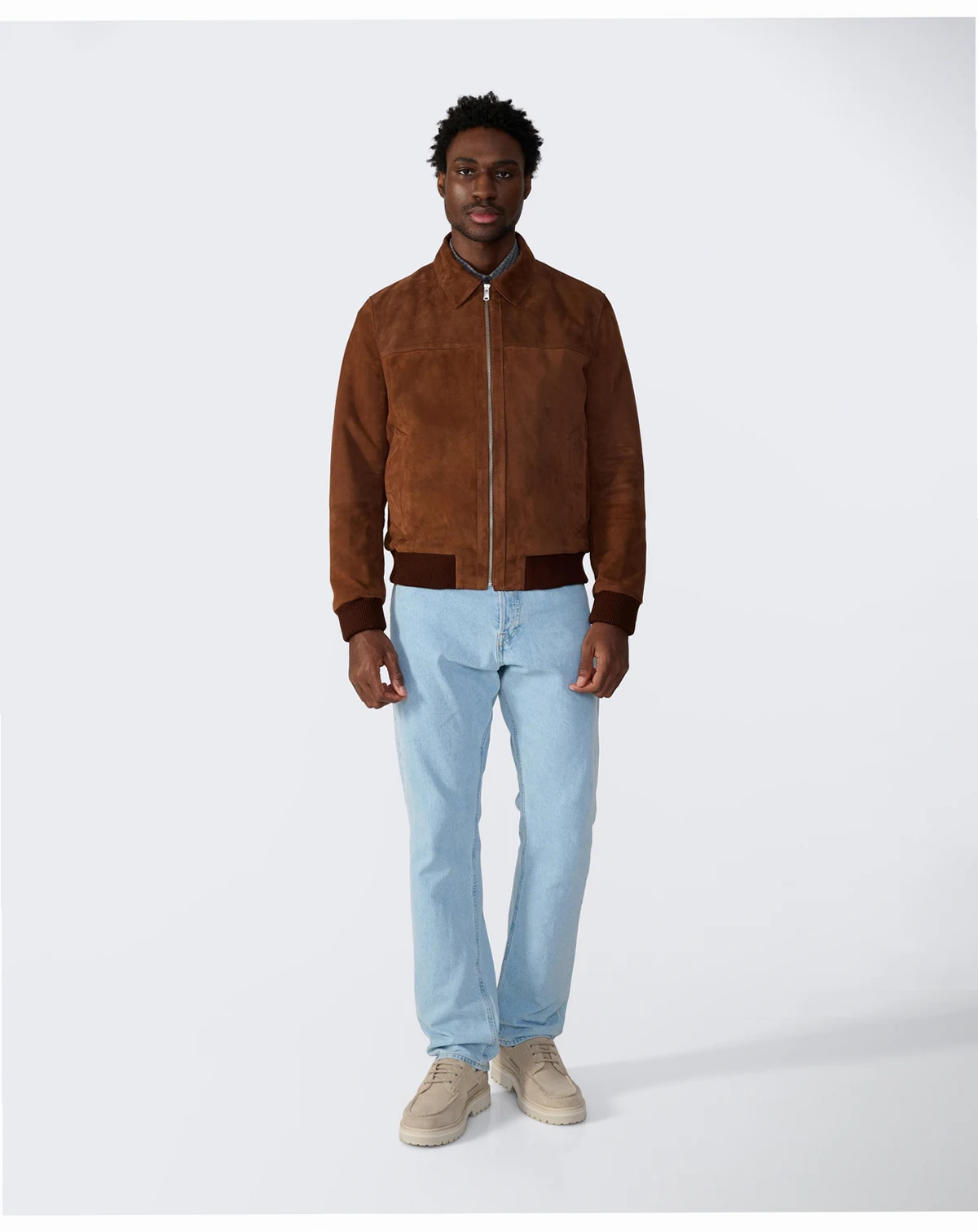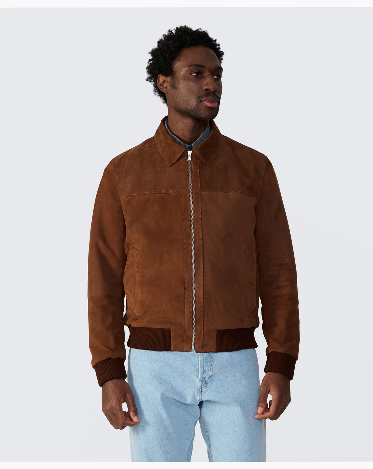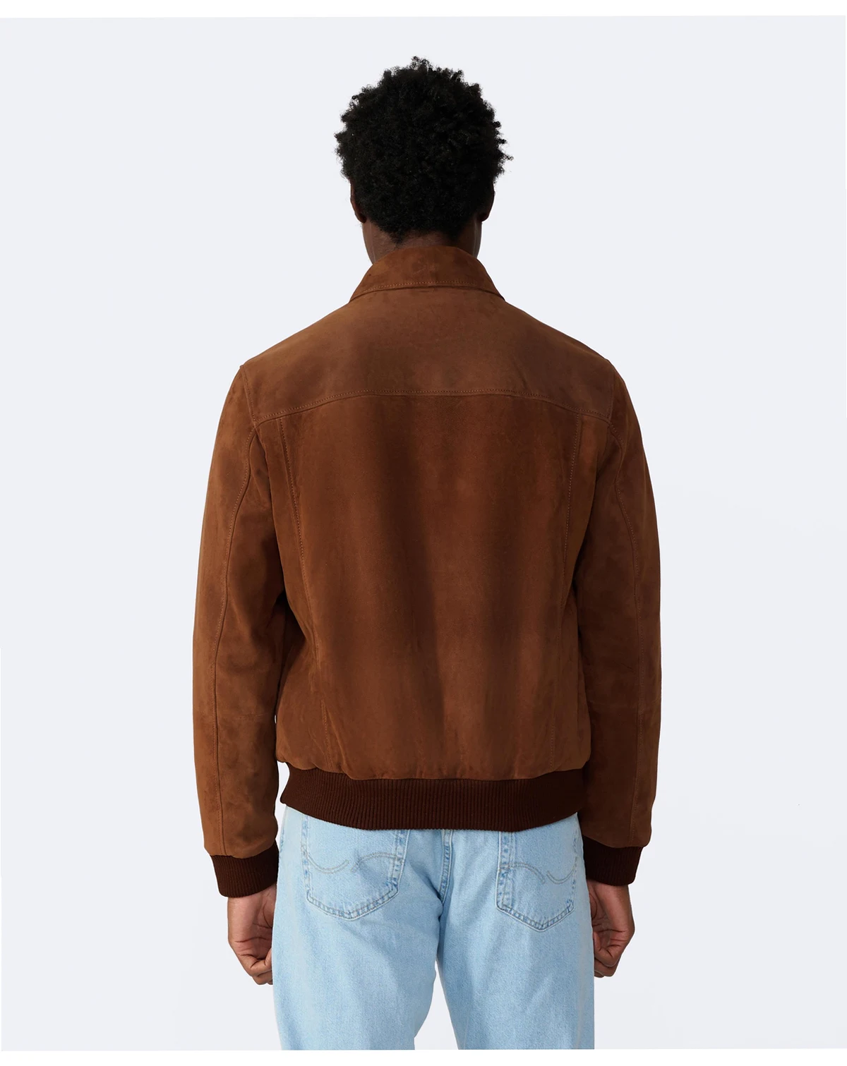 Model Height: 6 2” | Chest: 36” | Waist: 32” | Wearing Size: L Designed for crisp spring mornings and cool evenings, this suede bomber jacket blends classic craftsmanship with a fresh, easygoing feel. The earthy brown suede is rich in tone and texture, while the ribbed hem and cuffs add that essential bomber edge.