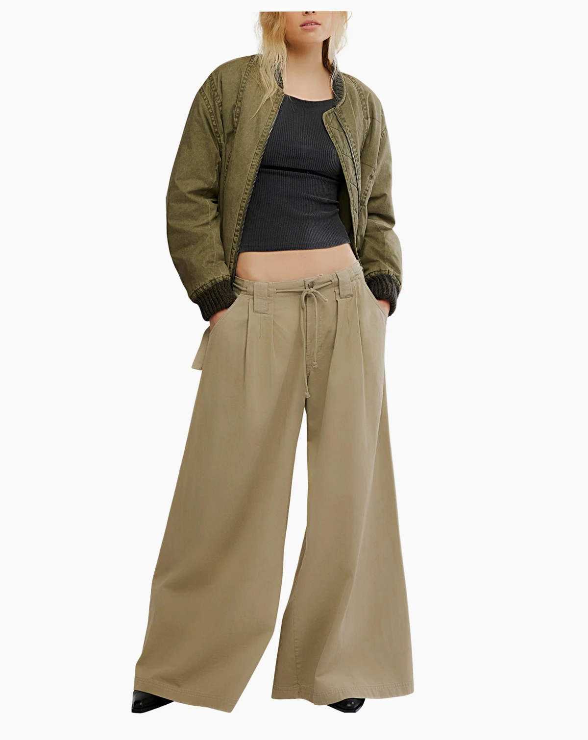 Make a bold statement with these wide-leg chino trousers from Free People, featuring a billowy silhouette and a pull-on design. The drawstring detail and pleating at the top create a versatile pair offering endless styling options. ABOUT THE BRAND: If you love the laid-back charm of boho-chic apparel, you'll find a beautiful selection from Free People at Macy's that suits your style. From ultra-feminine dresses to cute tops, browse the collection of casual, hip designs.