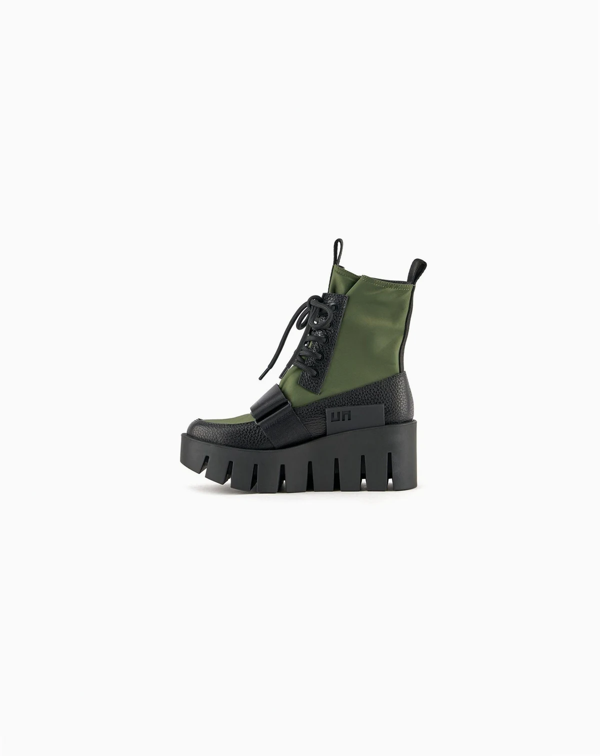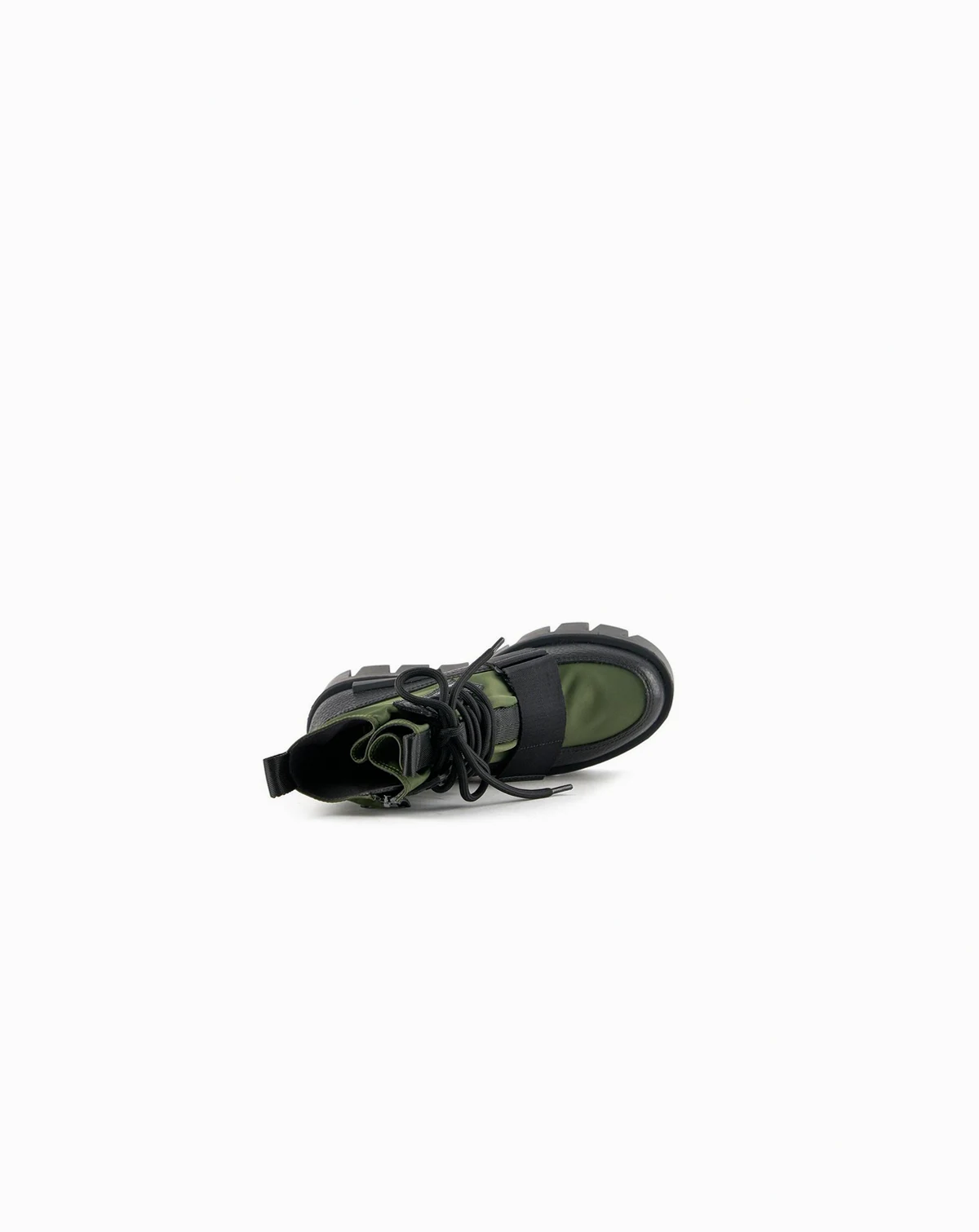 The Grip Combat is a reinterpretation of the classic combat boot with a platform lift, a statement logo block, and a defining log sole. The upper features a mix of durable materials, including tumbled leather, sporty nylon fabric, and nylon webbing, and is equipped with a functional exterior pocket. A lace-up closure, side zipper, and velcro top strap provide a secure fit and effortless on/off wear, while the chunky, cleated platform sole adds significant height and a distinctive, grip-like tread.