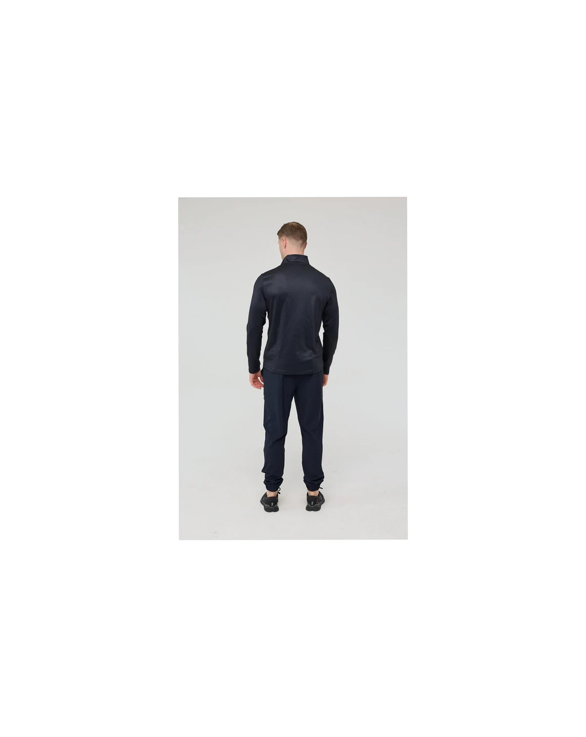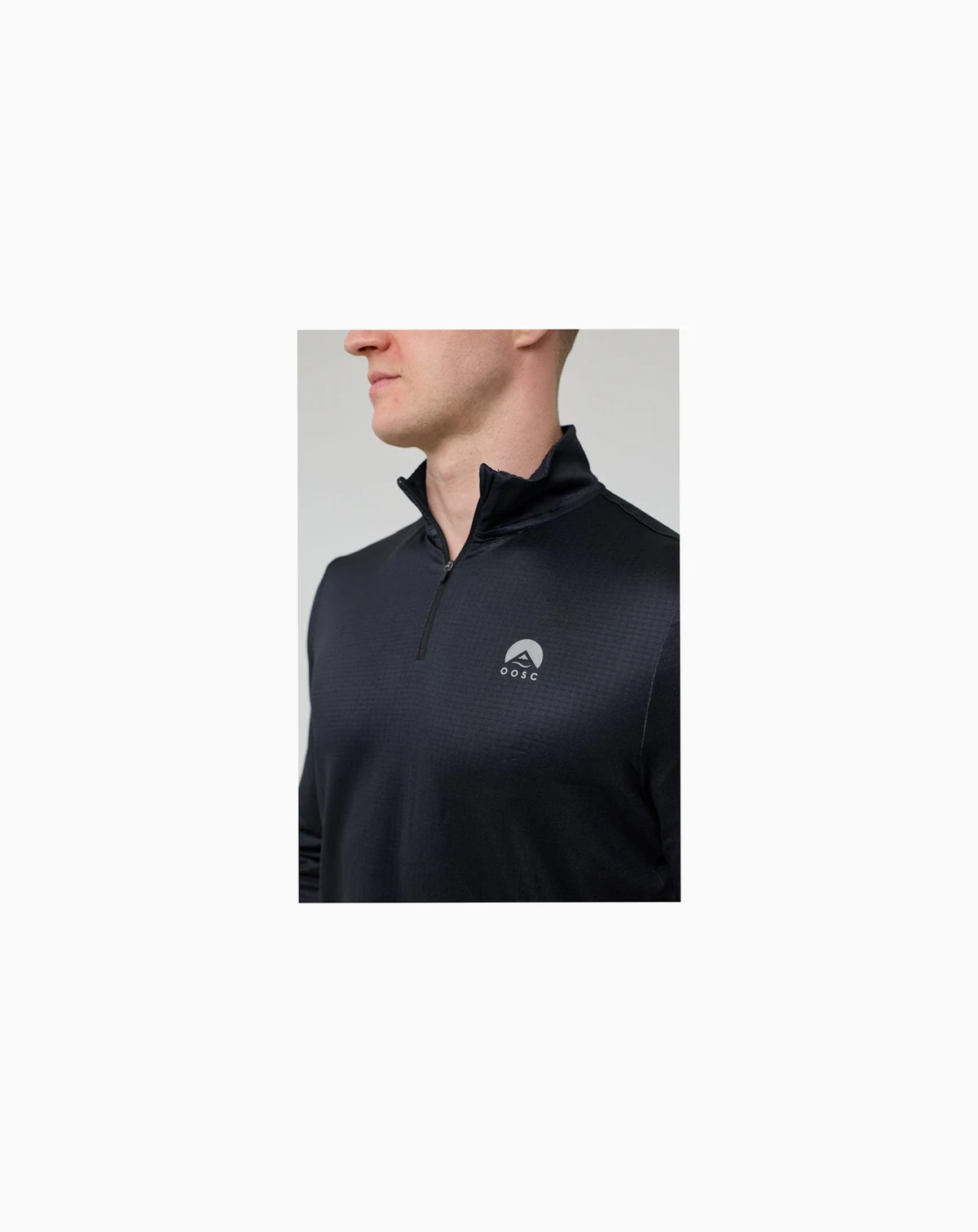 OOSC Elite men's 1/4 zip top offers breathability, flexibility, and sweat-wicking comfort. Waffle-lined with high collar, quick-drying soft-feel fabric, and reflective logo for safety. Wear solo or layered. Made from 94% polyester and 6% spandex.