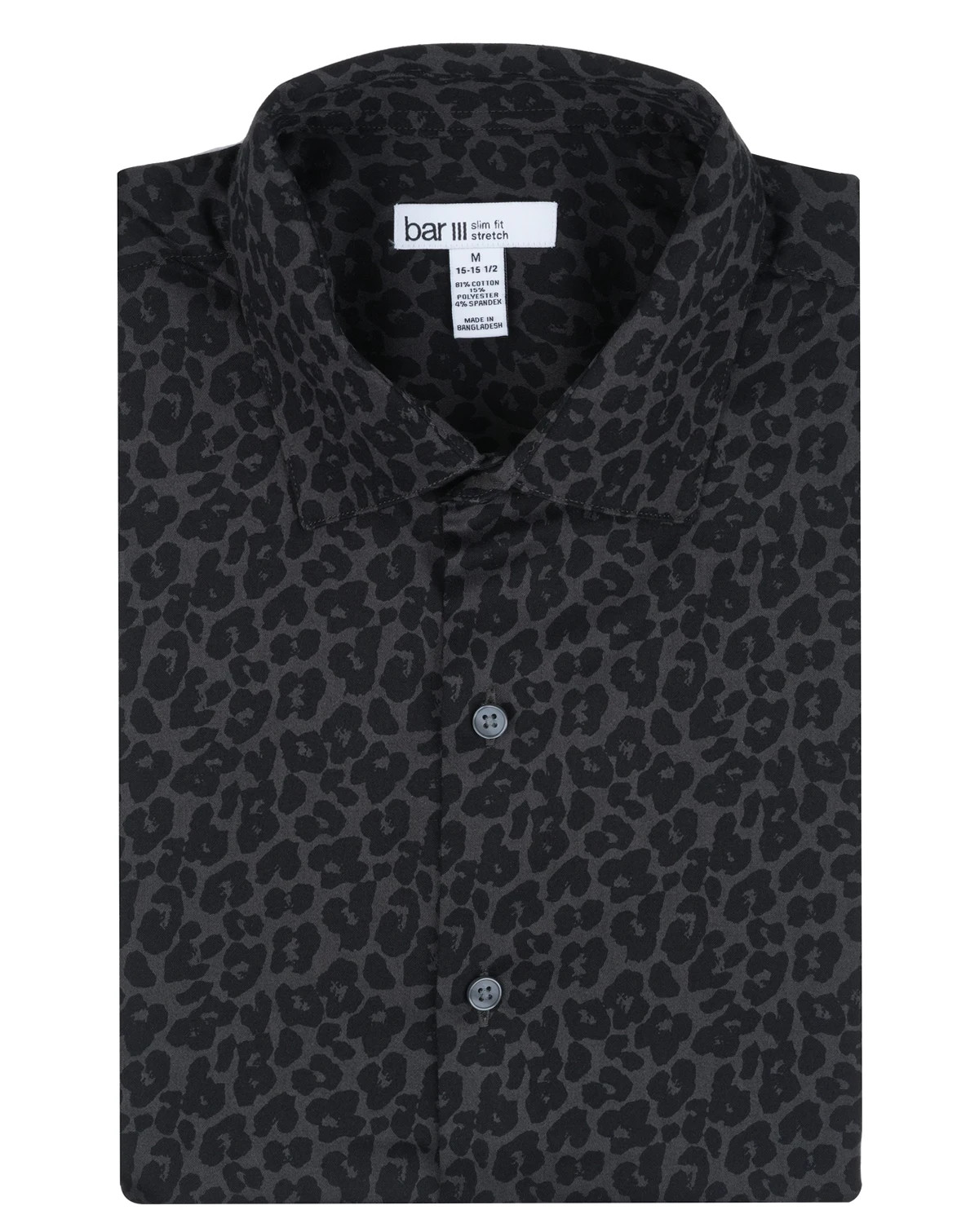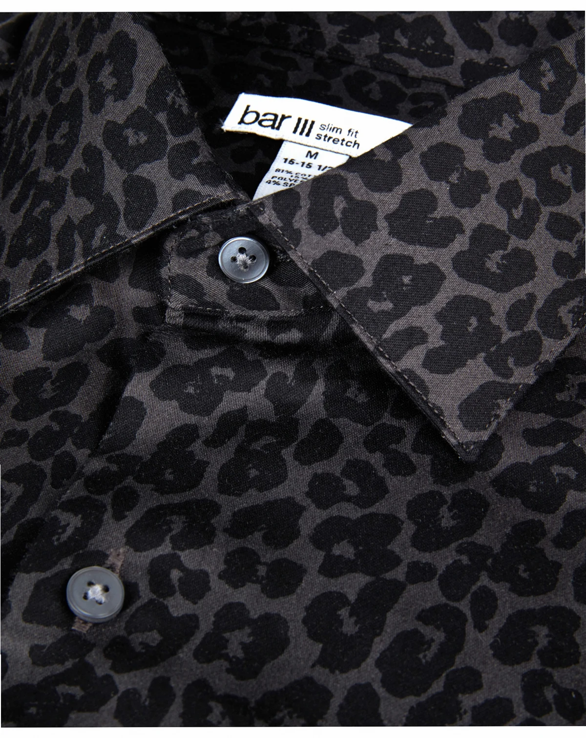 Making a wild statement with a leopard print, this dress shirt from Bar III is tailored in a sleek slim-fit. The spread collar and rounded cuffs offer a bold and fashionable touch to any outfit.