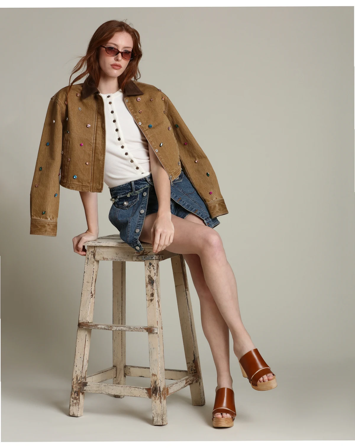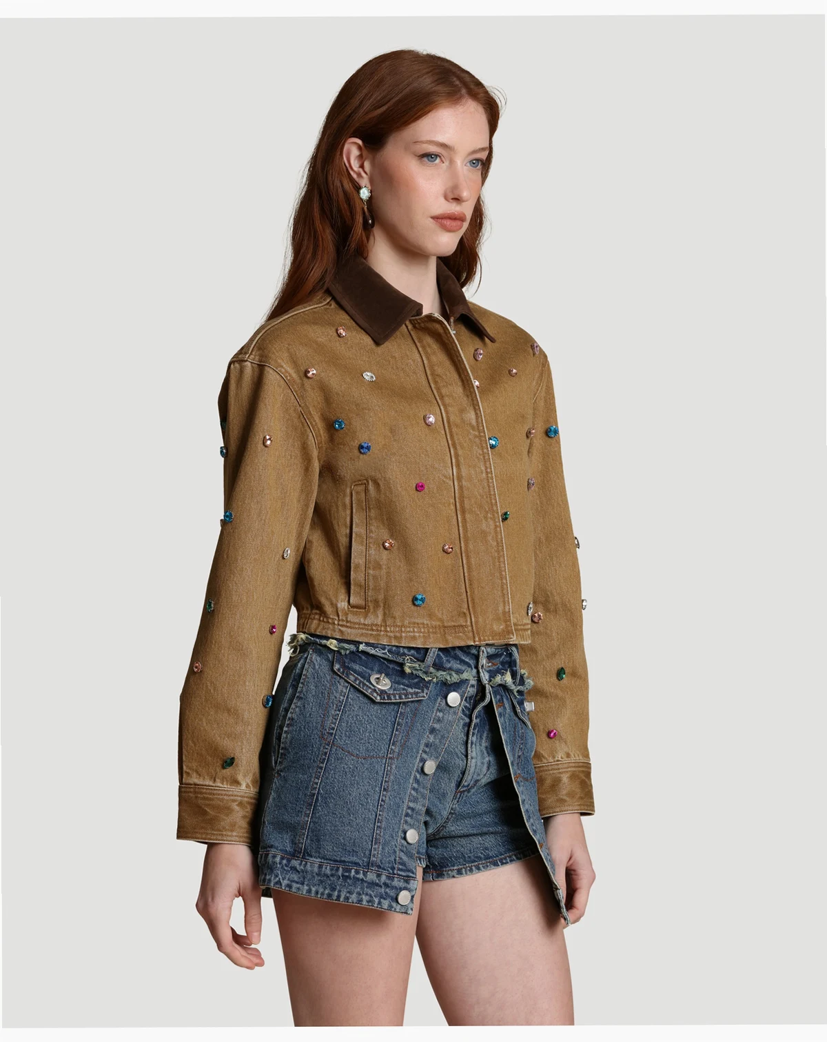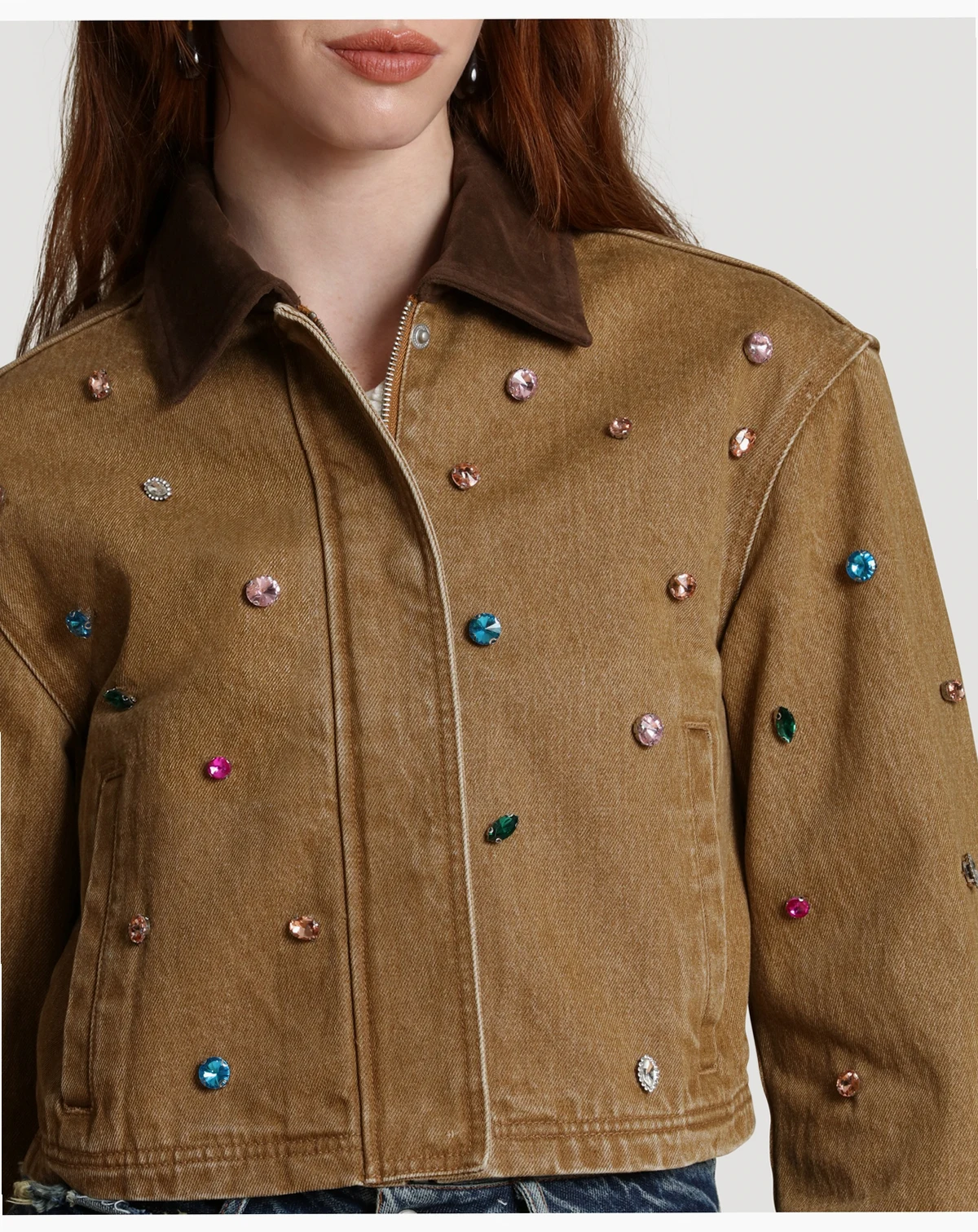 Adorned with embellishments, this chore jacket from Avec Les Filles shows a spread collar and long sleeves. A zipper closure and side pockets complete the utilitarian look.