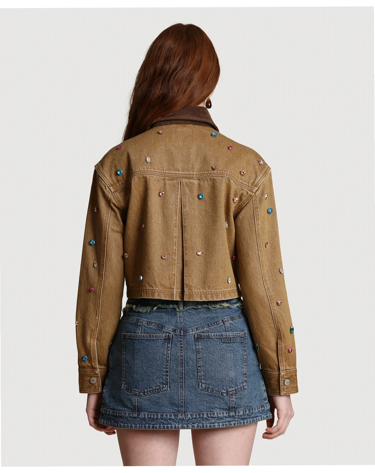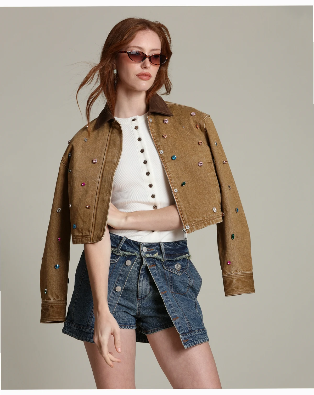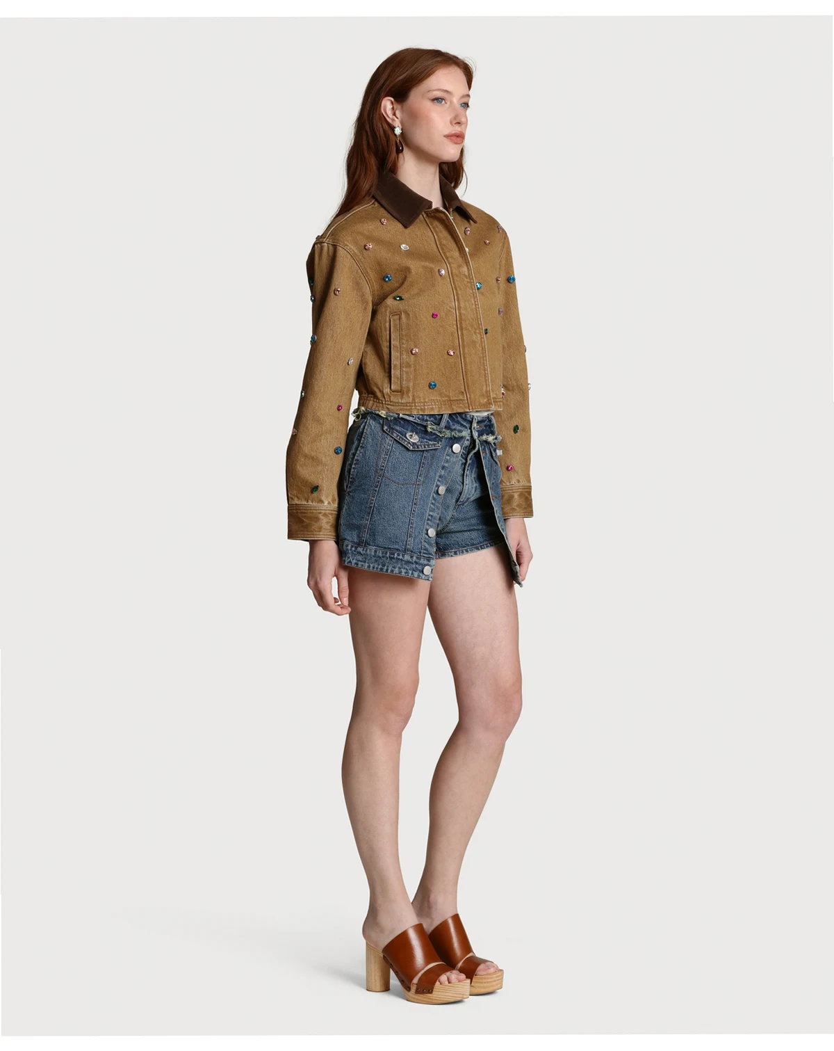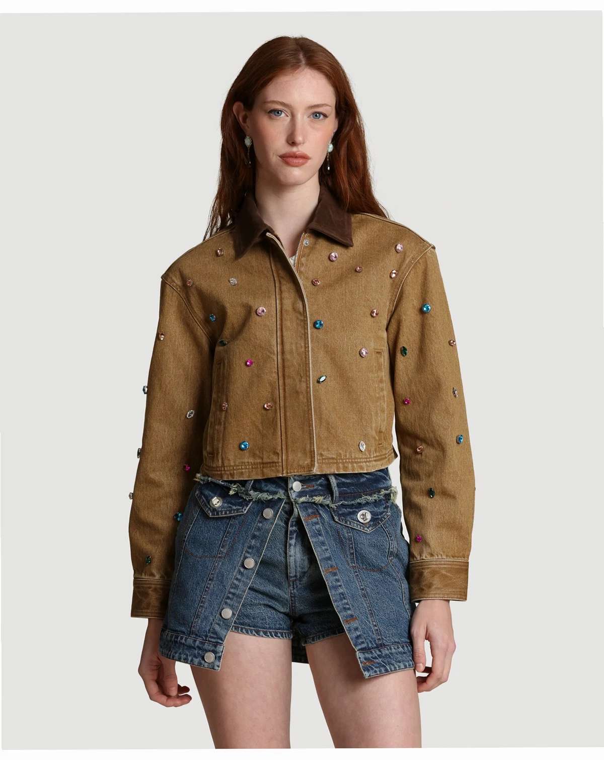 Adorned with embellishments, this chore jacket from Avec Les Filles shows a spread collar and long sleeves. A zipper closure and side pockets complete the utilitarian look.