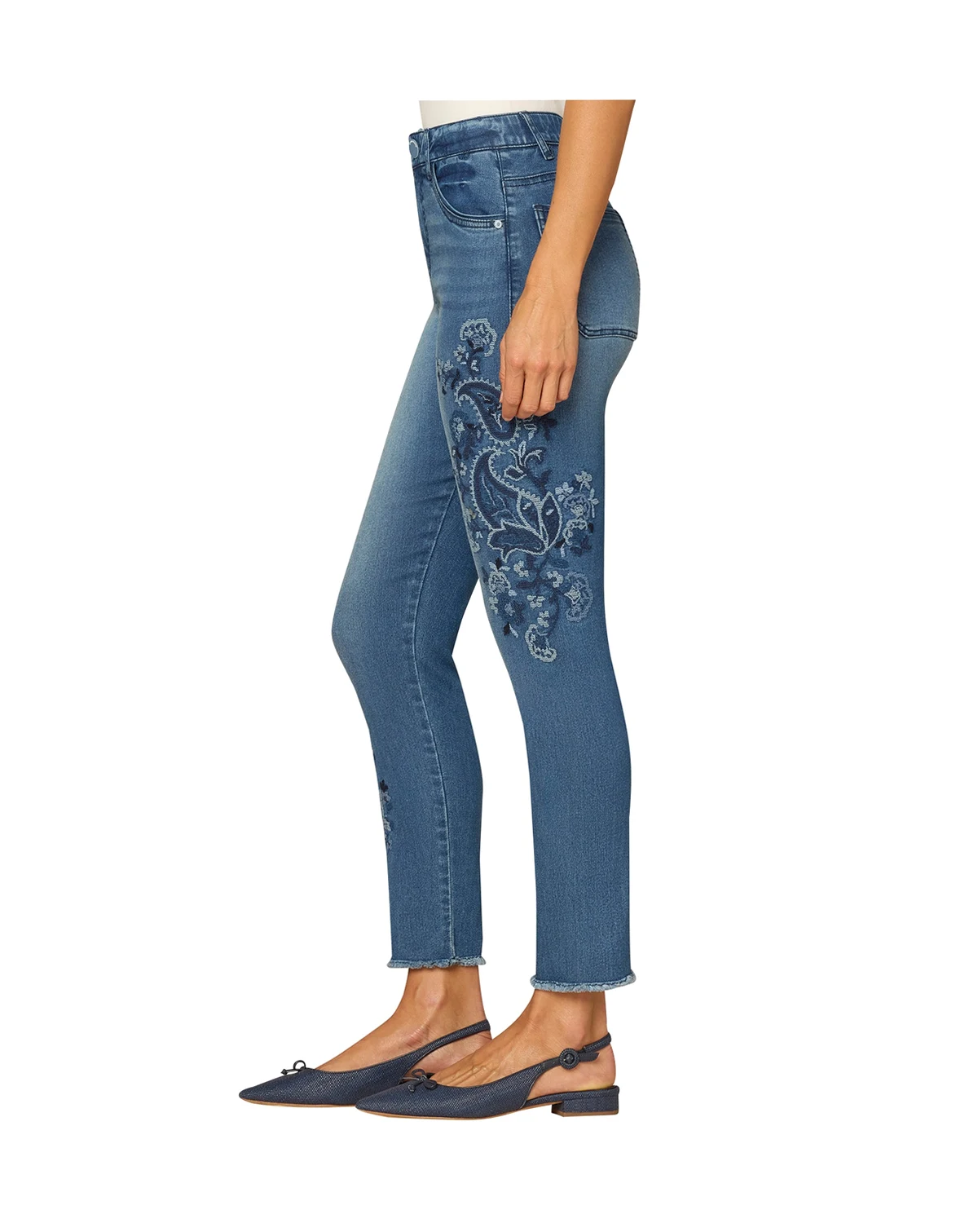 Contemporary and sleek, these Democracy jeans feature a seamless ankle skimmer silhouette adorned with paisley embroidery and a fray hem. "Ab"Solution technology incorporates an elastic waistband, mesh panels, and strategically placed style lines, while four pockets provide practical functionality.