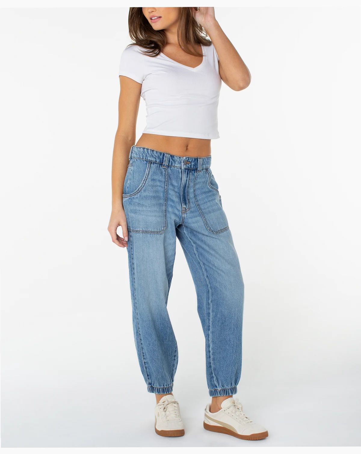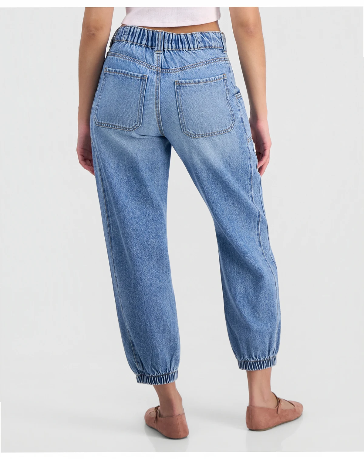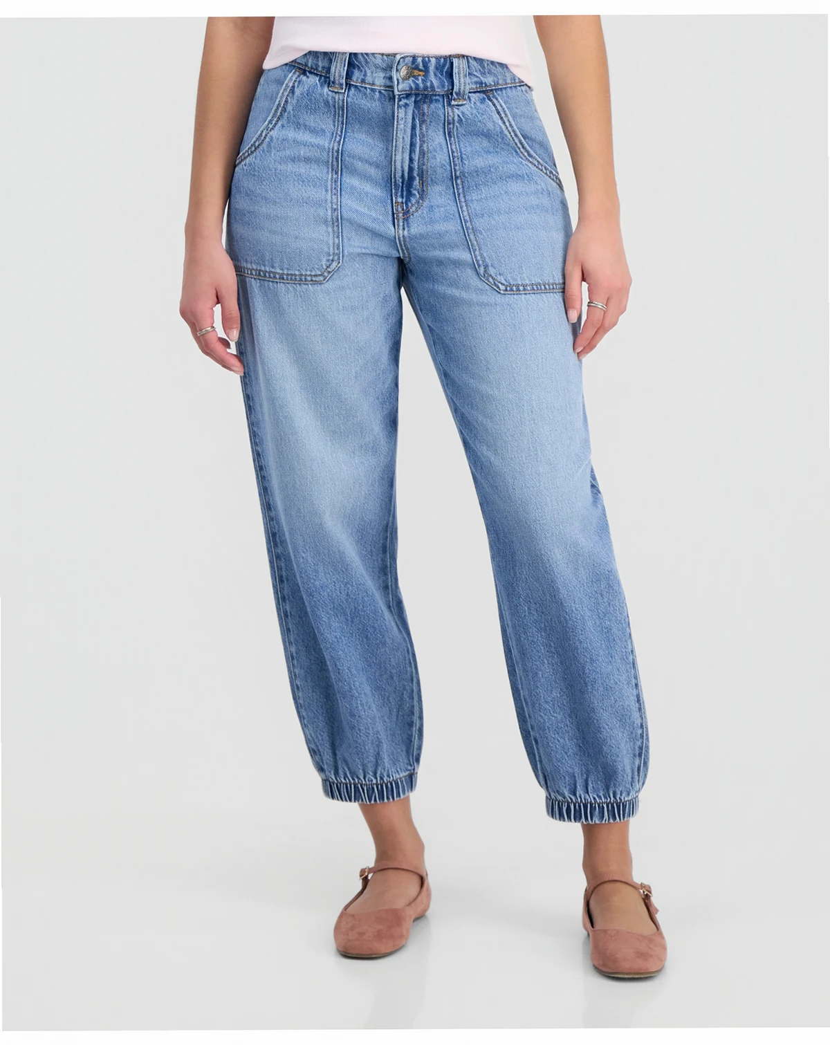 A sporty jogger silhouette pairs with utilitarian front pockets in a cool denim wash to deliver the eclectic look of these ankle jeans from Celebrity Pink.