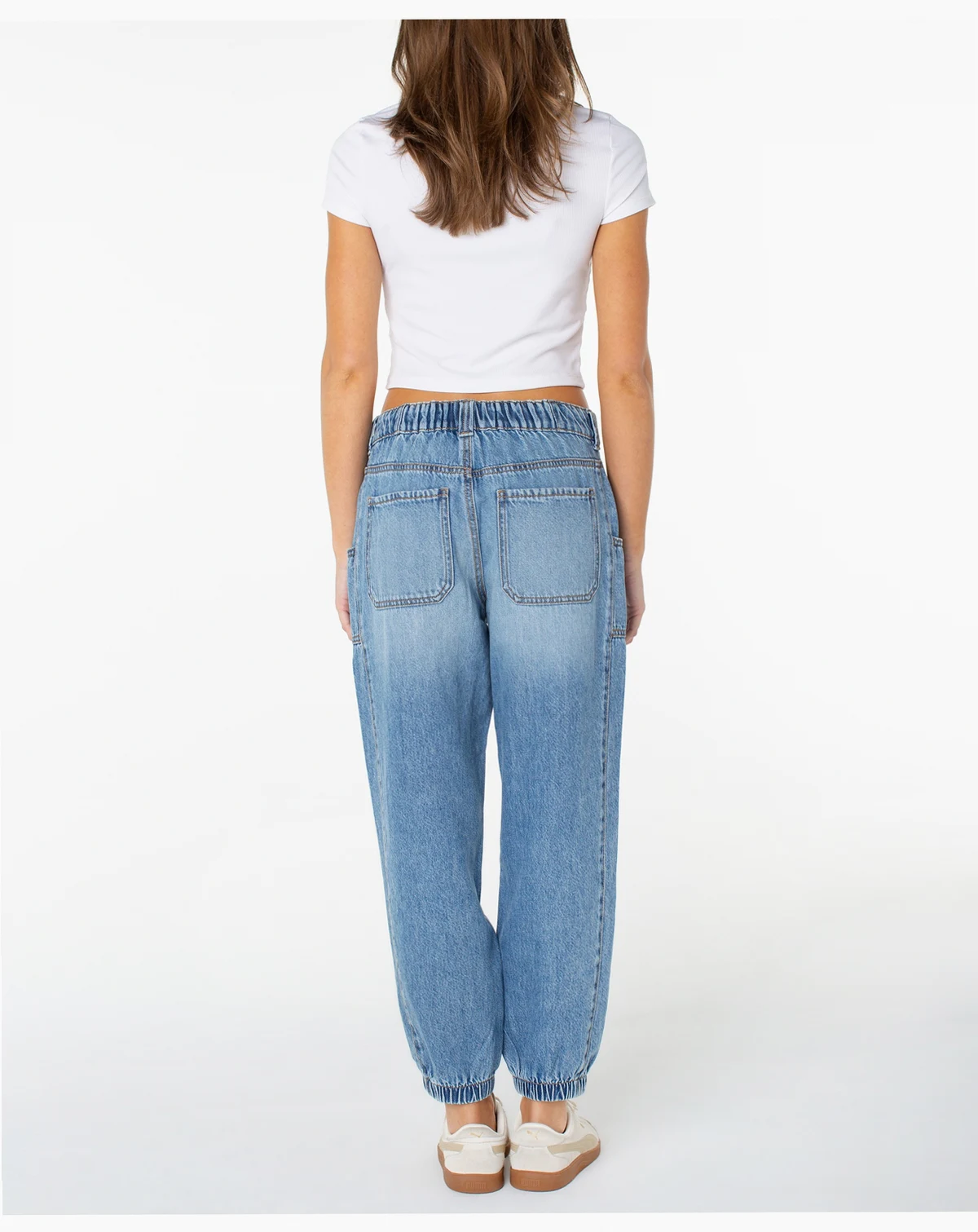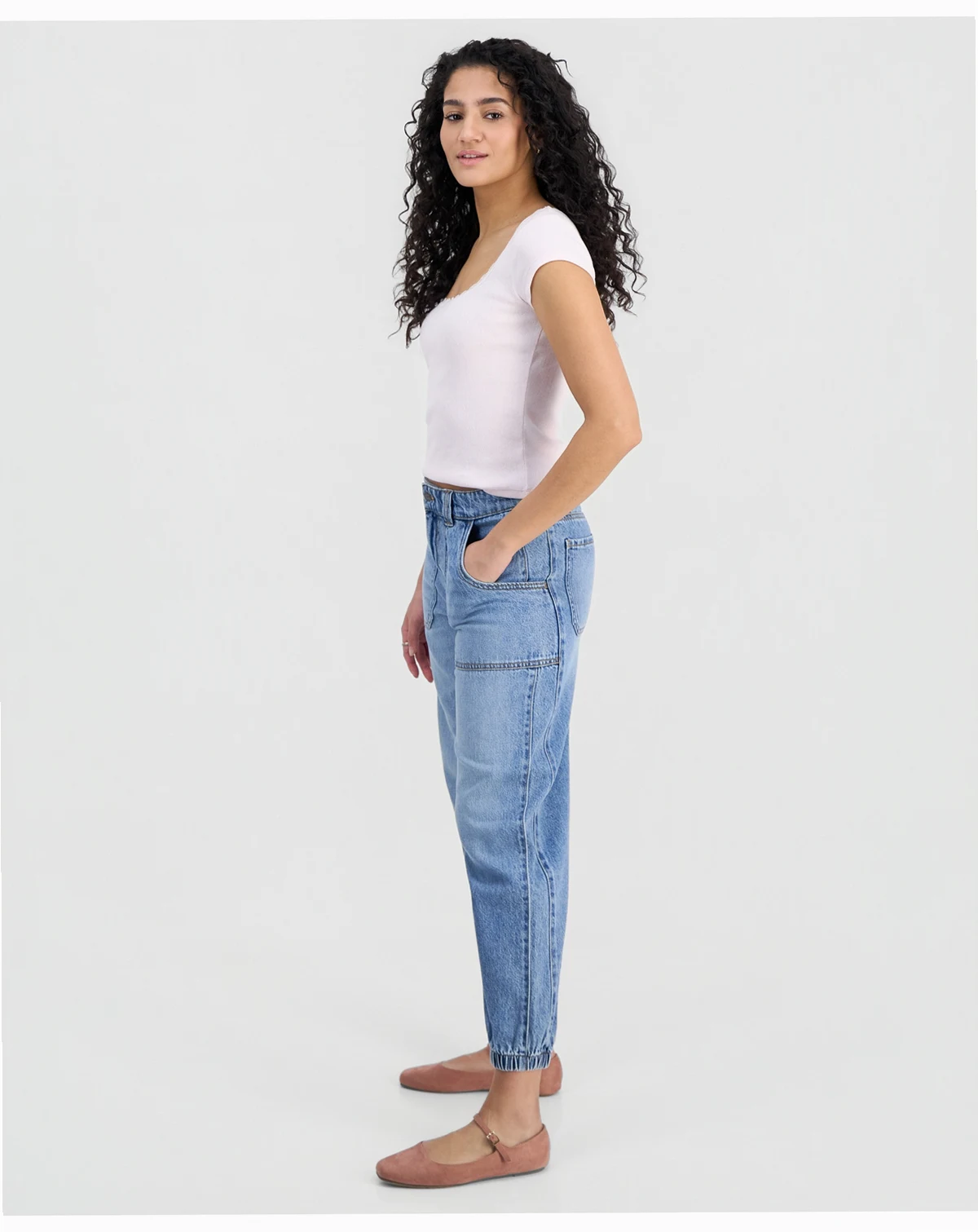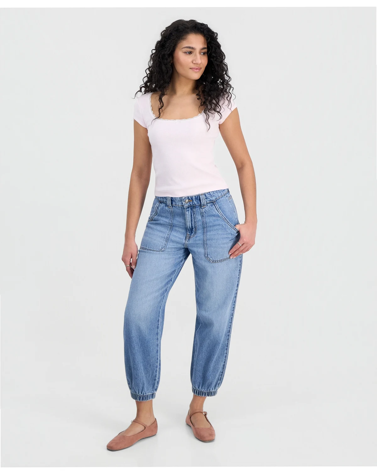 A sporty jogger silhouette pairs with utilitarian front pockets in a cool denim wash to deliver the eclectic look of these ankle jeans from Celebrity Pink.