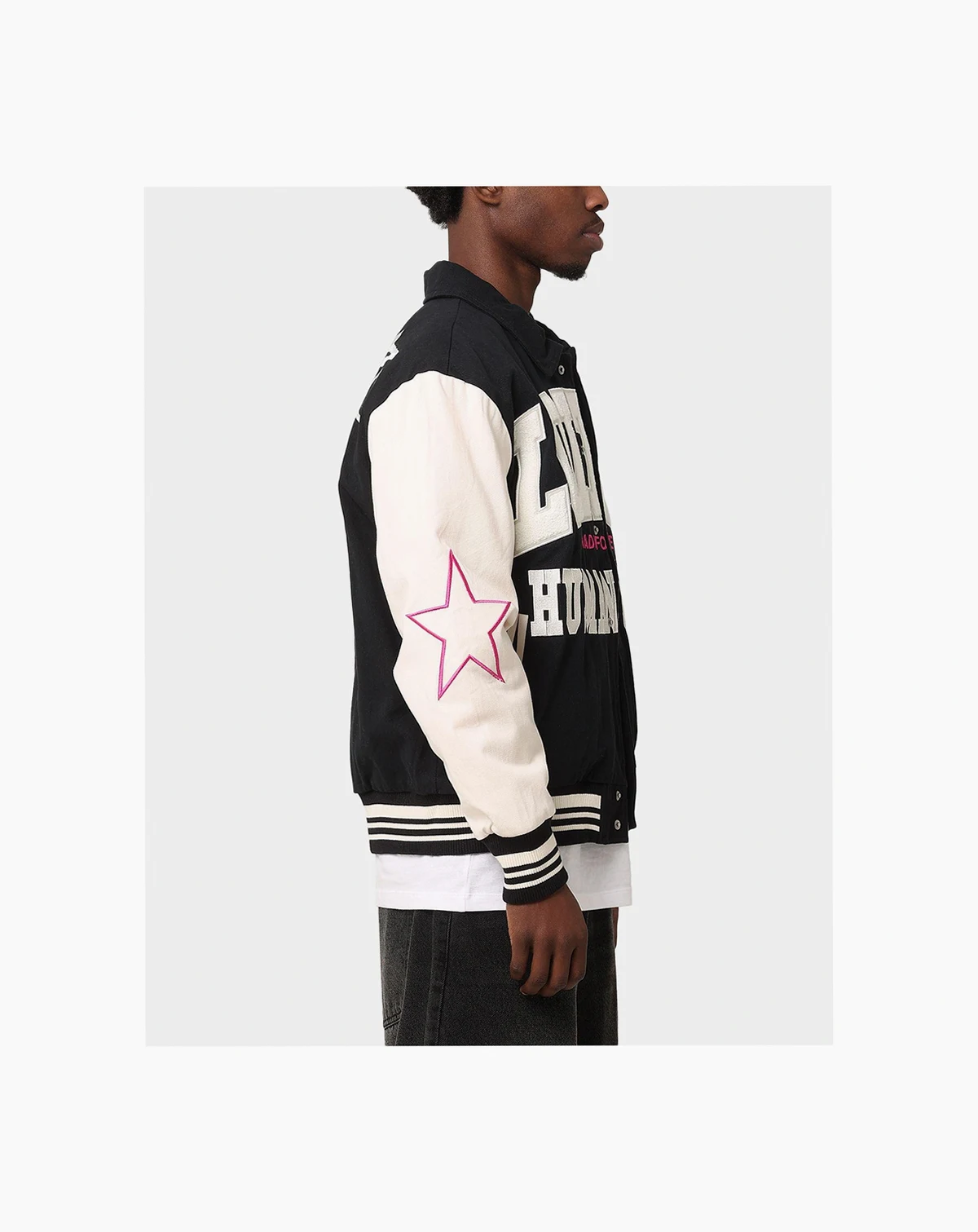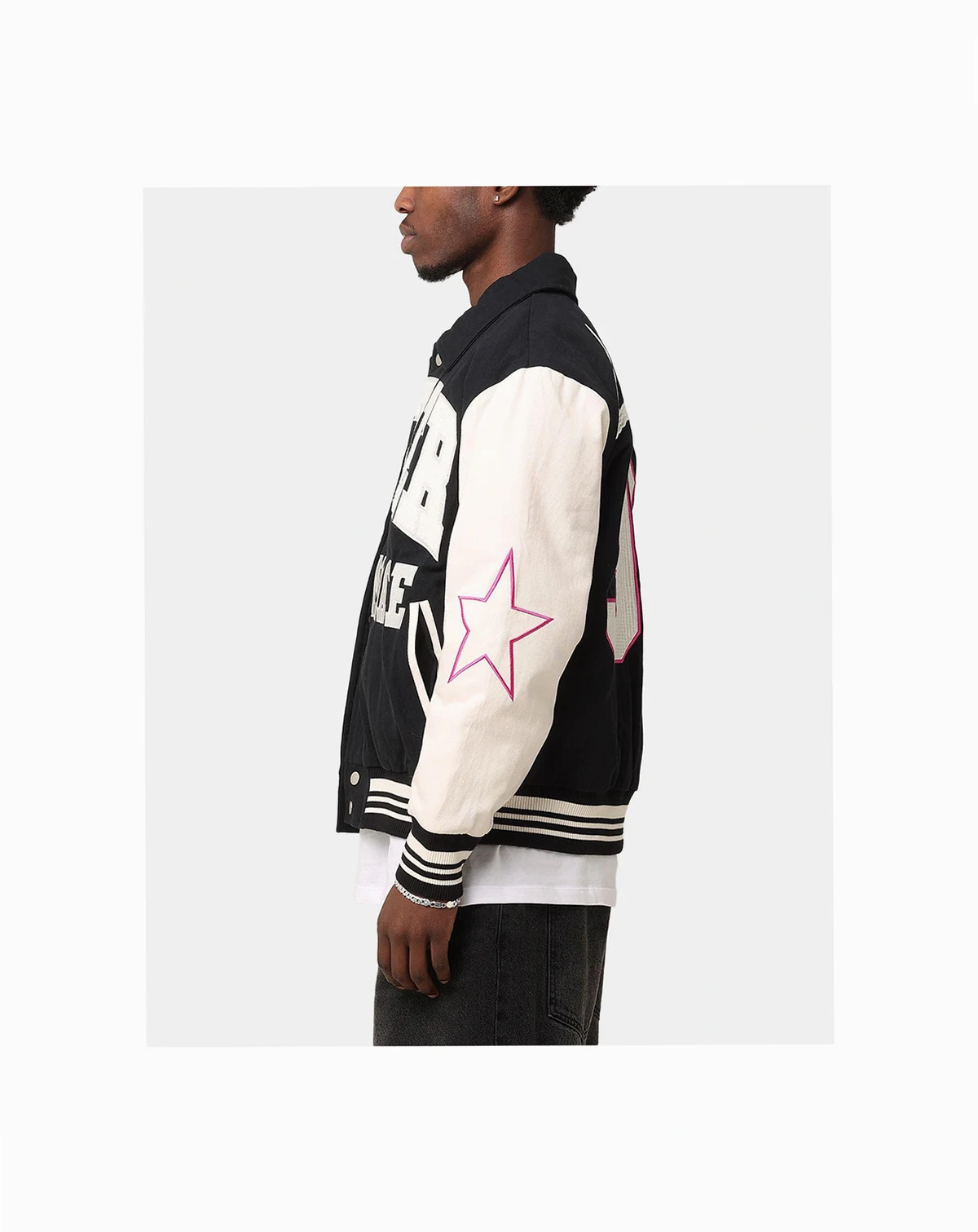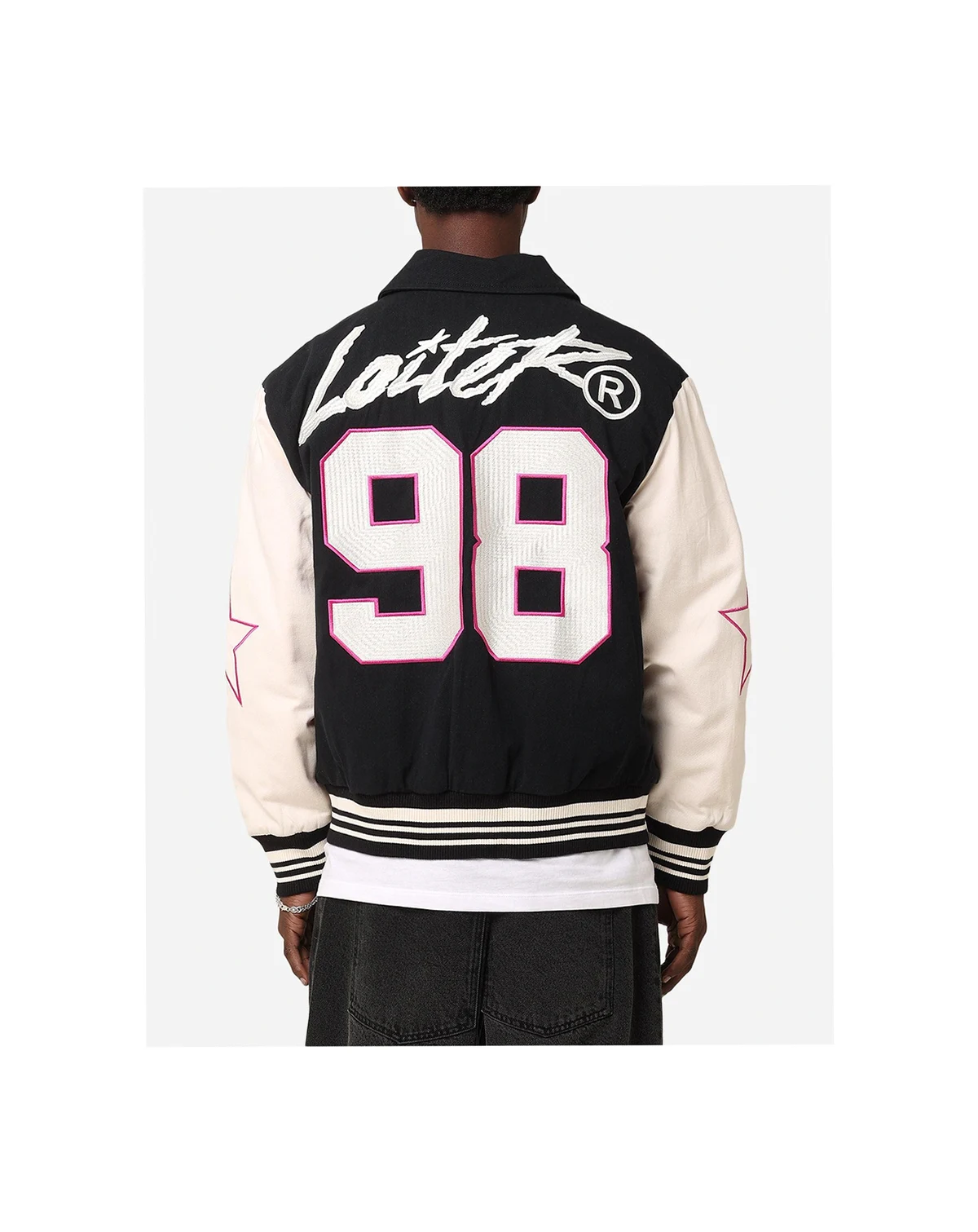 This jacket features a mix of embroidered graphics and chenille appliques that'll get you all the compliments, contrast cuffs and hems add a little something extra and the snap button closure finishes off the classic varsity jacket vibe.
