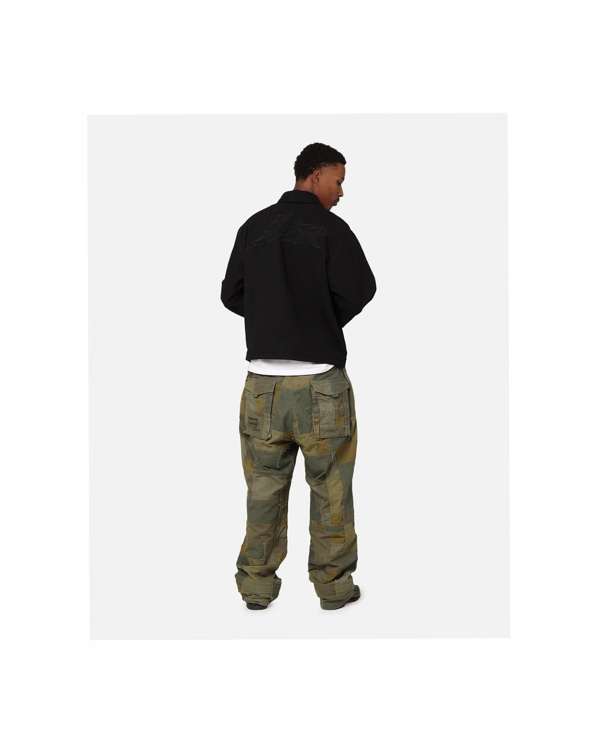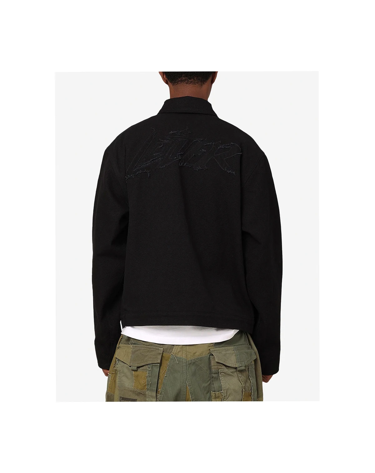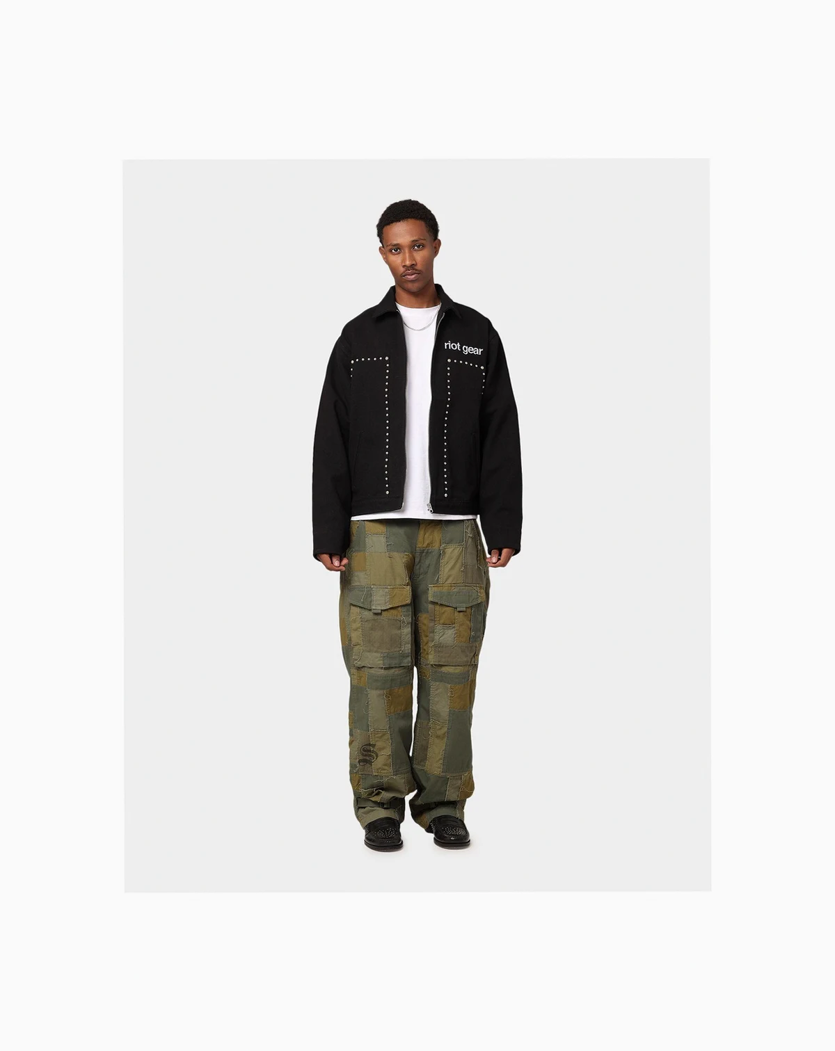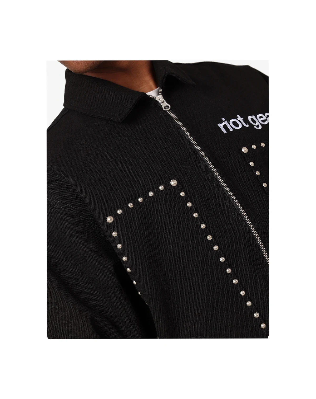 Introducing a fashion-forward masterpiece, Loiter Riot Defence jacket. Loiter's latest creation boasts embroidered branding and distressed stitched-down applique adds a bold statement, while the stud detailing adds an eye-catching detail to amplify your style. Dropped shoulders contribute to an effortlessly cool vibe, making this piece a must-have for those seeking a balance of comfort and style.