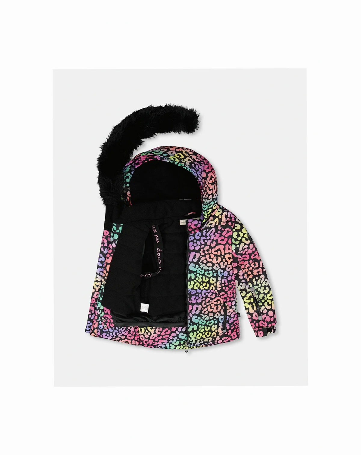Waterproof, breathable, and insulated for cold protection down to -30°C (-22°F), our two-piece PLAY ski suit in multicolor leopard print is designed for maximum comfort, warmth, and performance in the snow. This winter snowsuit features a fleece-lined jacket with a detachable and adjustable hood, articulated sleeves for improved range of motion, elastic cuffs, a snow skirt, expandable sleeves so you can adjust the length as the child grows, and a protective wind flap and chin guard. The pants are constructed with Cordura-reinforced panels for long-lasting durability, articulated knees, adjustable and removable suspender straps, ankle snow guards, and zippered pockets to hold ski passes and other essentials.
