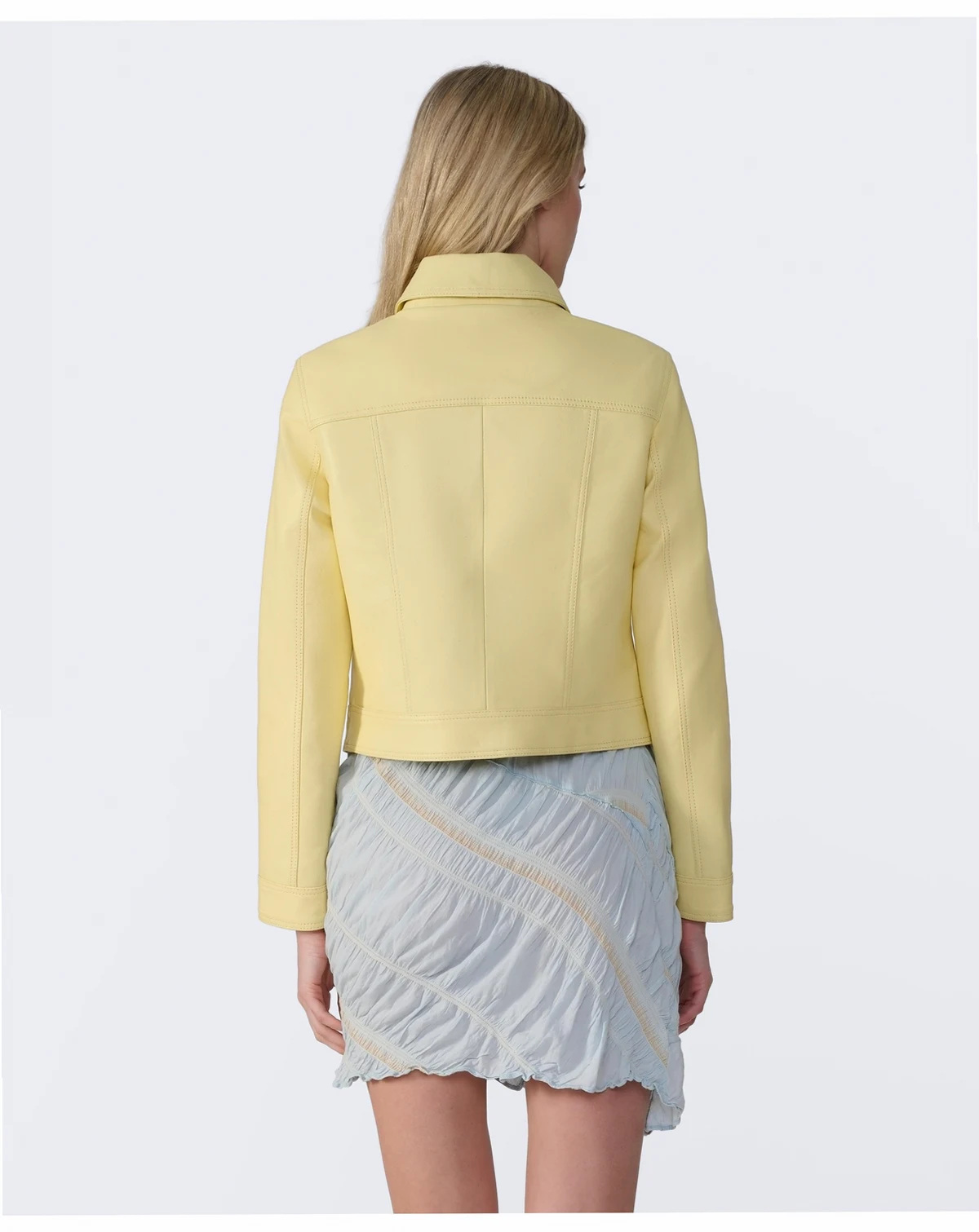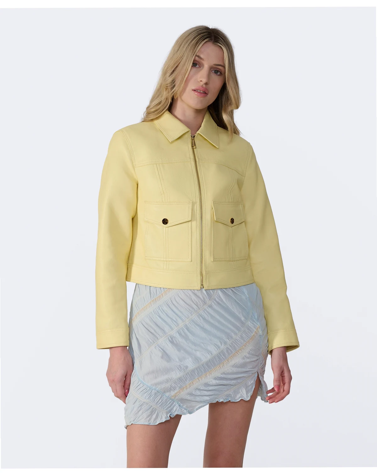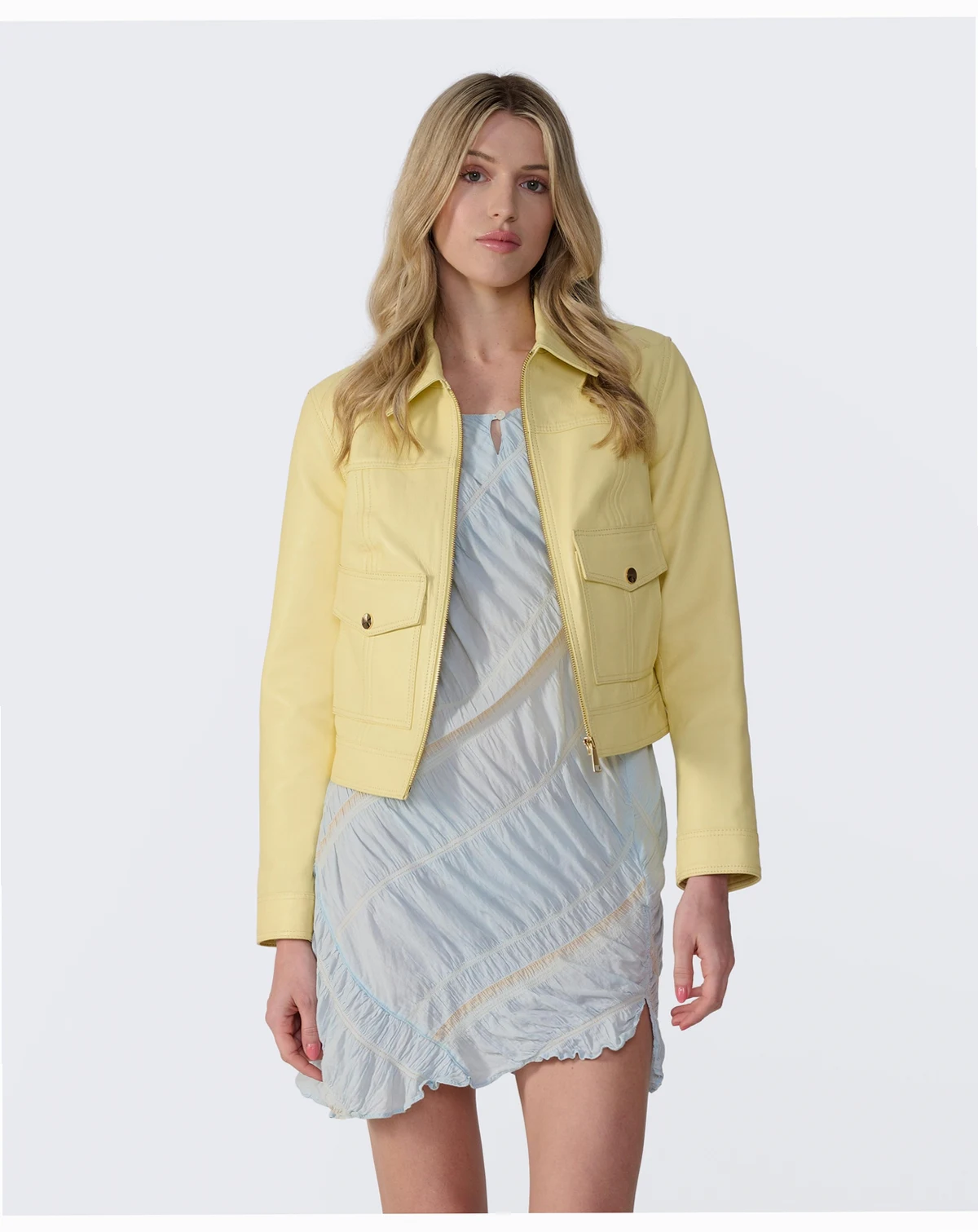 Model Height: 5 11” | Bust: 32” | Waist: 24” | Wearing Size: S Inject sunshine into your spring wardrobe with our Leather Utility Pocket Jacket in a cheerful Butter Cream yellow. Handcrafted from genuine British leather, this piece balances playful charm with polished edge for a look that s both lighthearted and luxe.