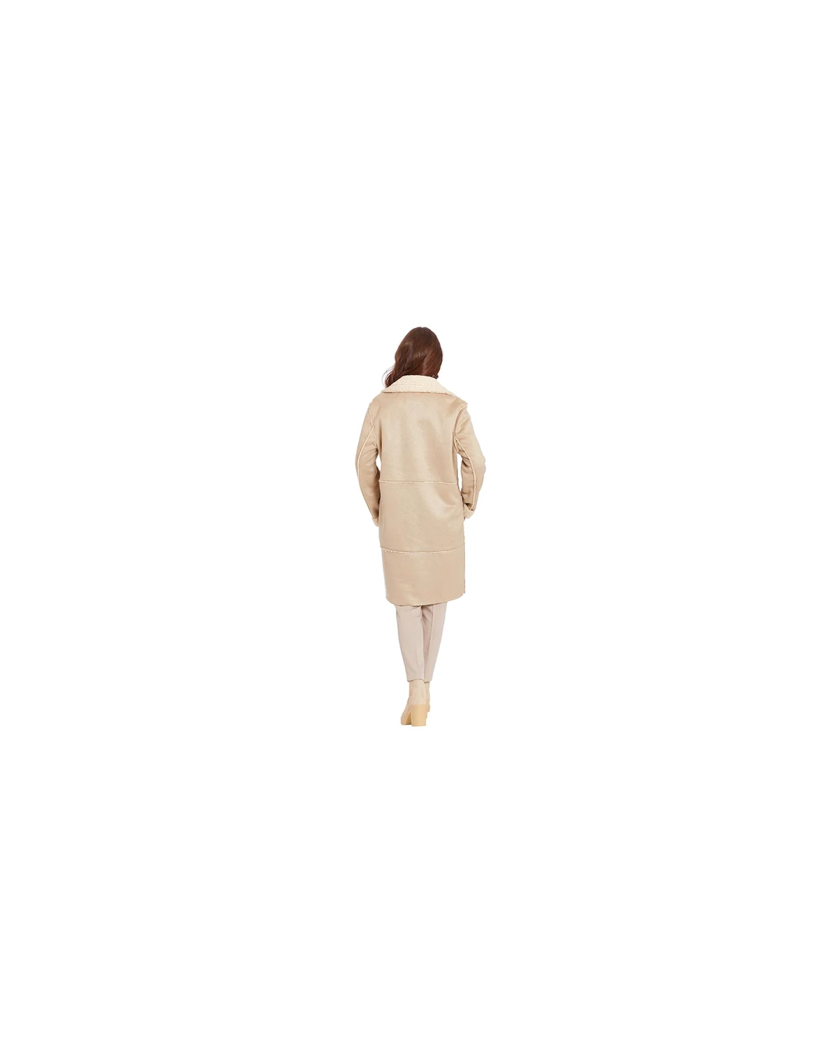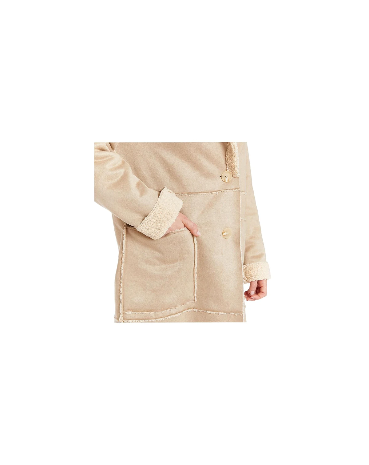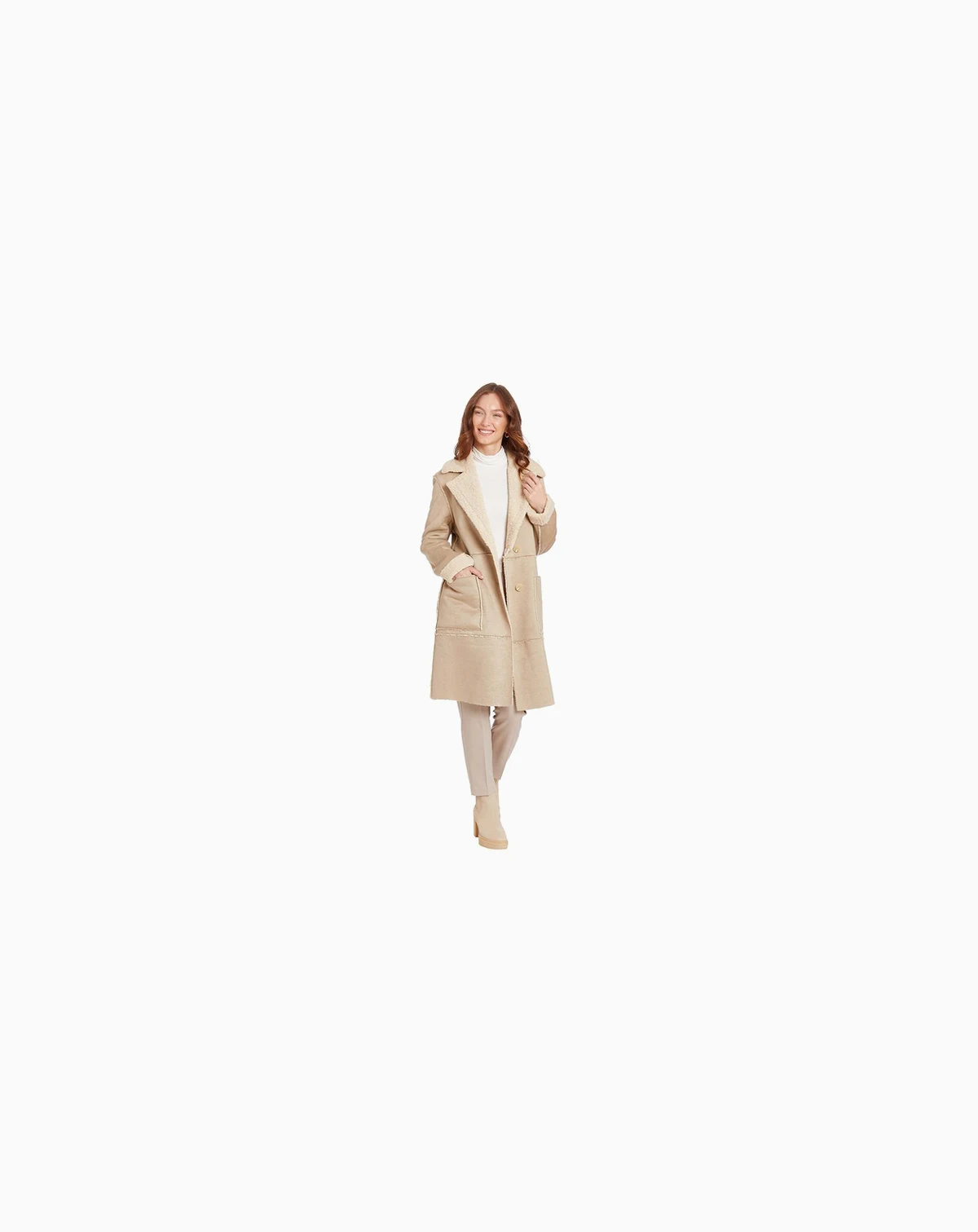 The perfect neutral for your fall wardrobe collection. Our medium weight FRYE faux shearling coat is knee length. The large notch collar on this single breasted button up coat combines fashion and functionality.