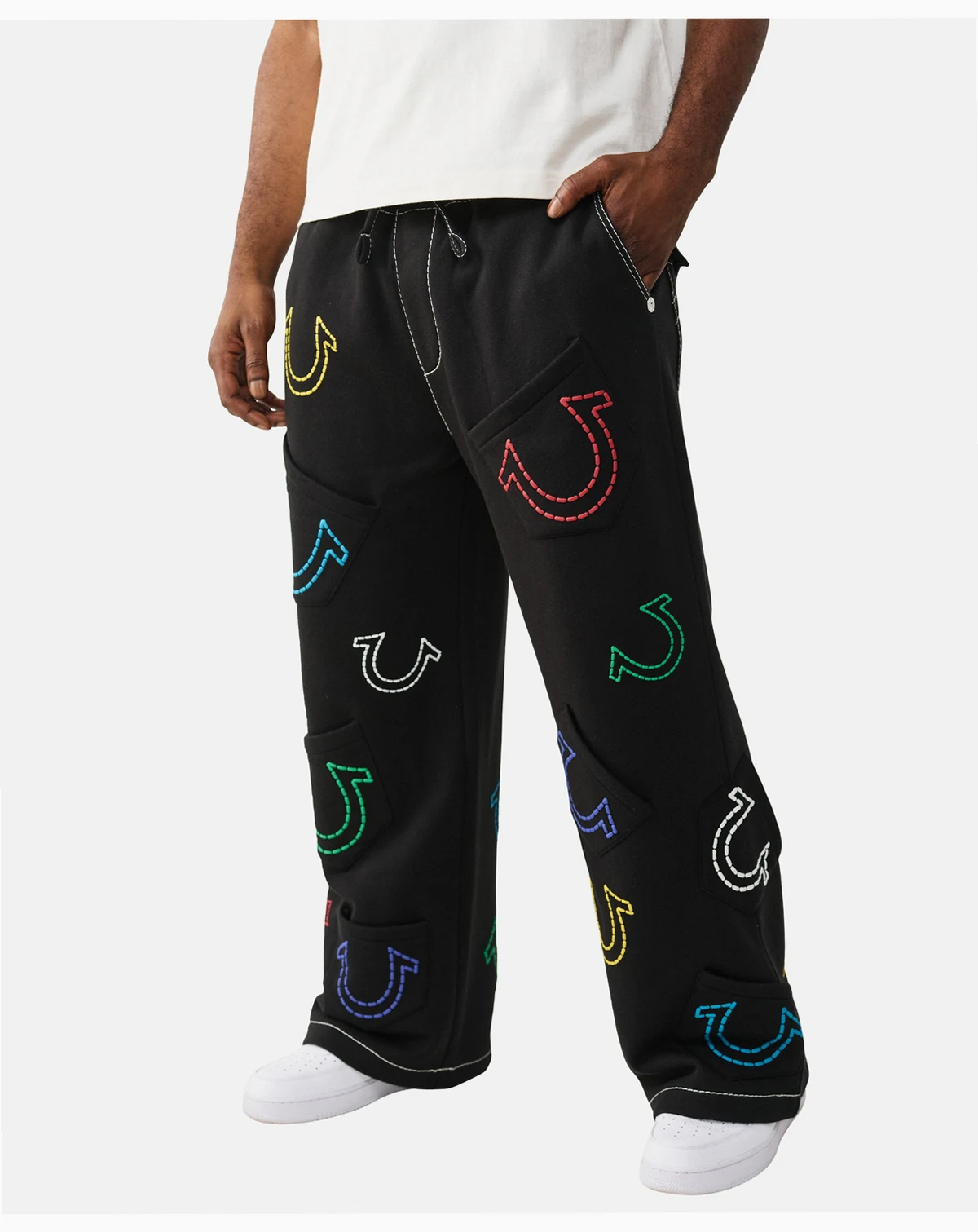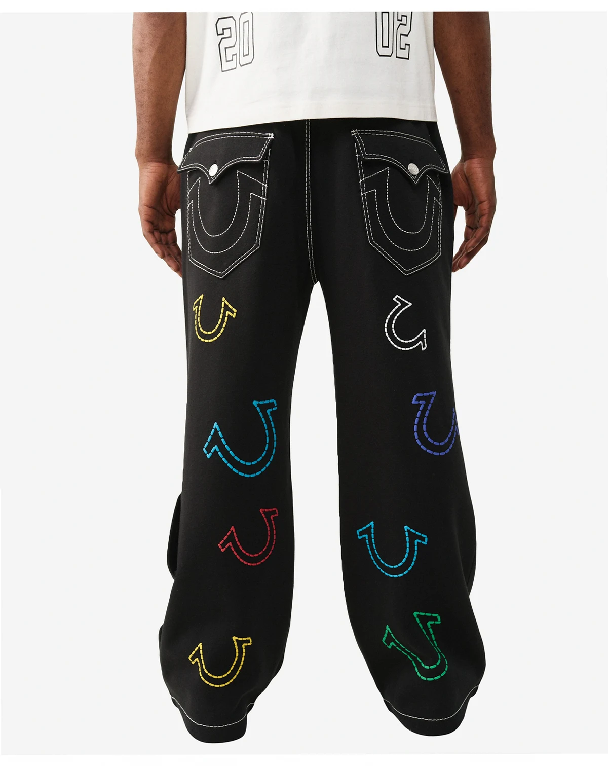 Bold comfort defines these True Religion pants featuring signature Big T stitching and allover horseshoe logos for statement appeal. A baggy fit and drawstring waistband create a relaxed feel, while slanted front pockets and back flap pockets blend style with everyday practicality.