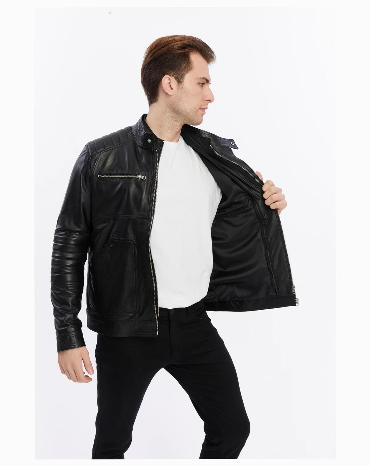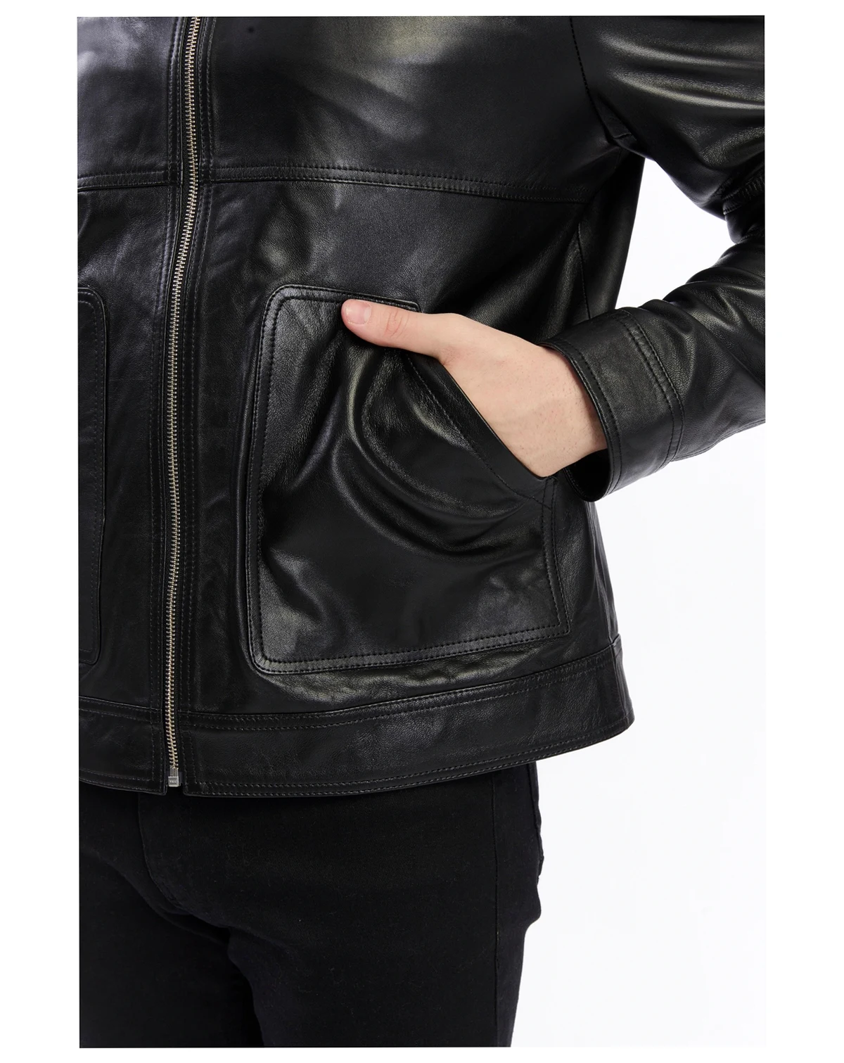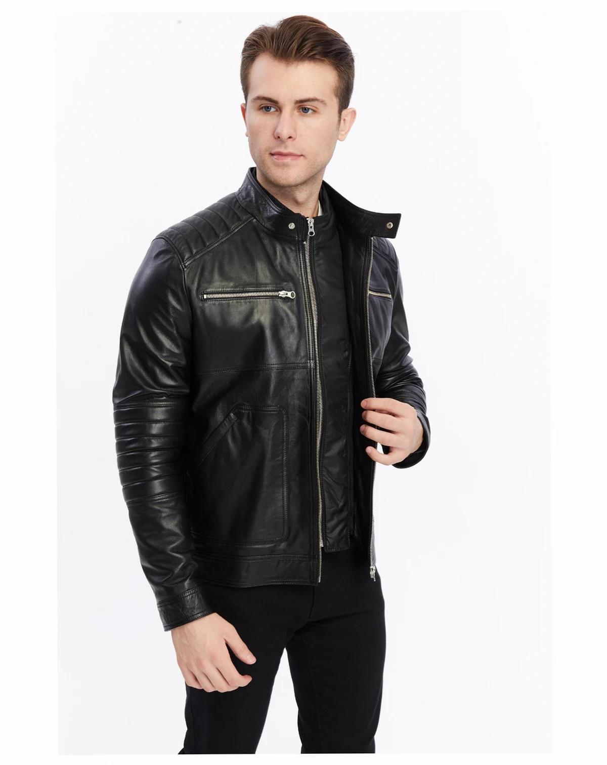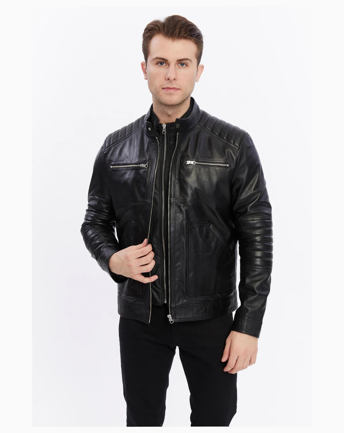 Immerse yourself in the luxury of this sleek, handcrafted leather button-up jacket. Made for the discerning modern man, this jacket offers a combination of classic design and modern practicality. The rich black leather finish delivers a bold yet refined look, ideal for elevating any casual or smart-casual outfit.