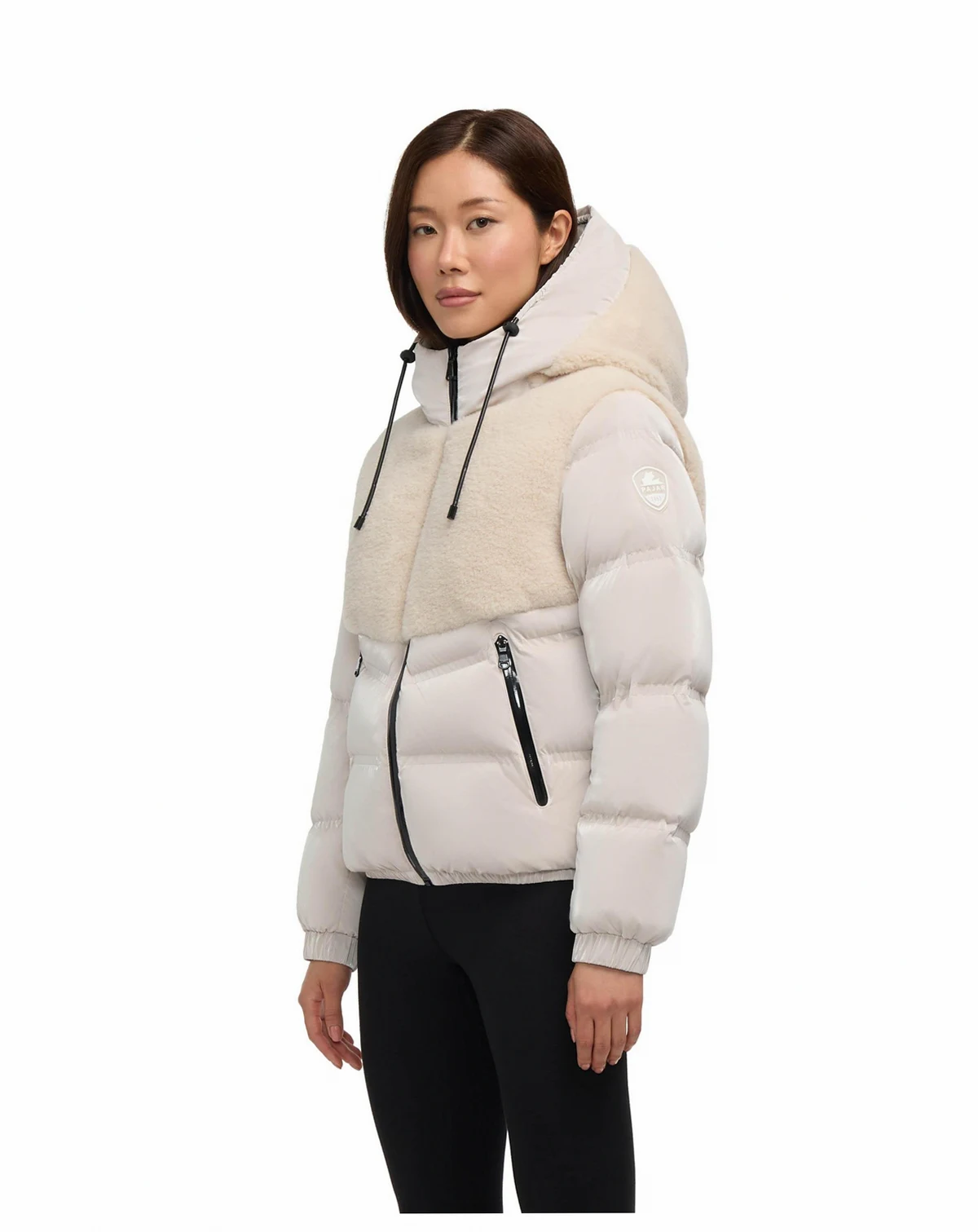 The Pajar Nephele short puffer features a glossy front zipper and elongated pockets for a sleek look. With faux shearling detailing at the hood, adjustable faux leather drawcords, and elasticized cuffs, this jacket offers both comfort and style. It's water-repellent and designed to keep you warm in temperatures as low as -20°C (-4°F).