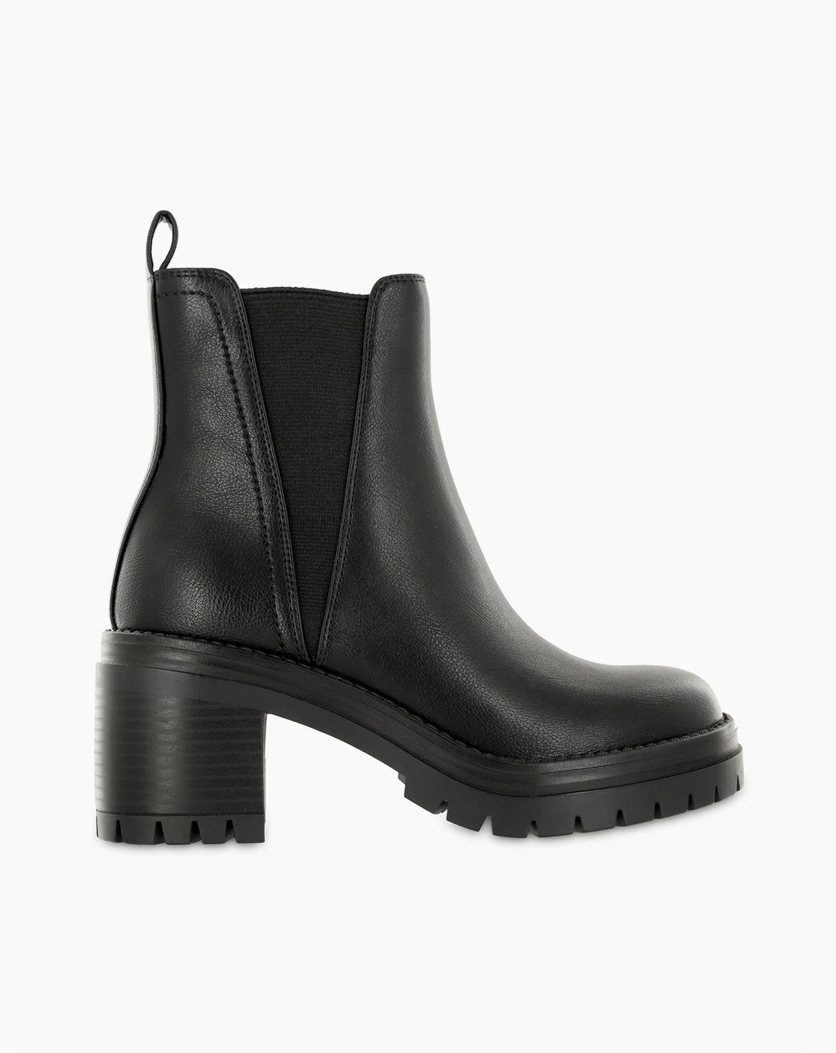 Slip into the new season with the Adea slip on stacked boot. Made from faux leather, this slip on boot features a rounded toe and elasticated panels on either side. Finished on a stacked 3" heel with a lug bottom sole, it's great for everyday wear.