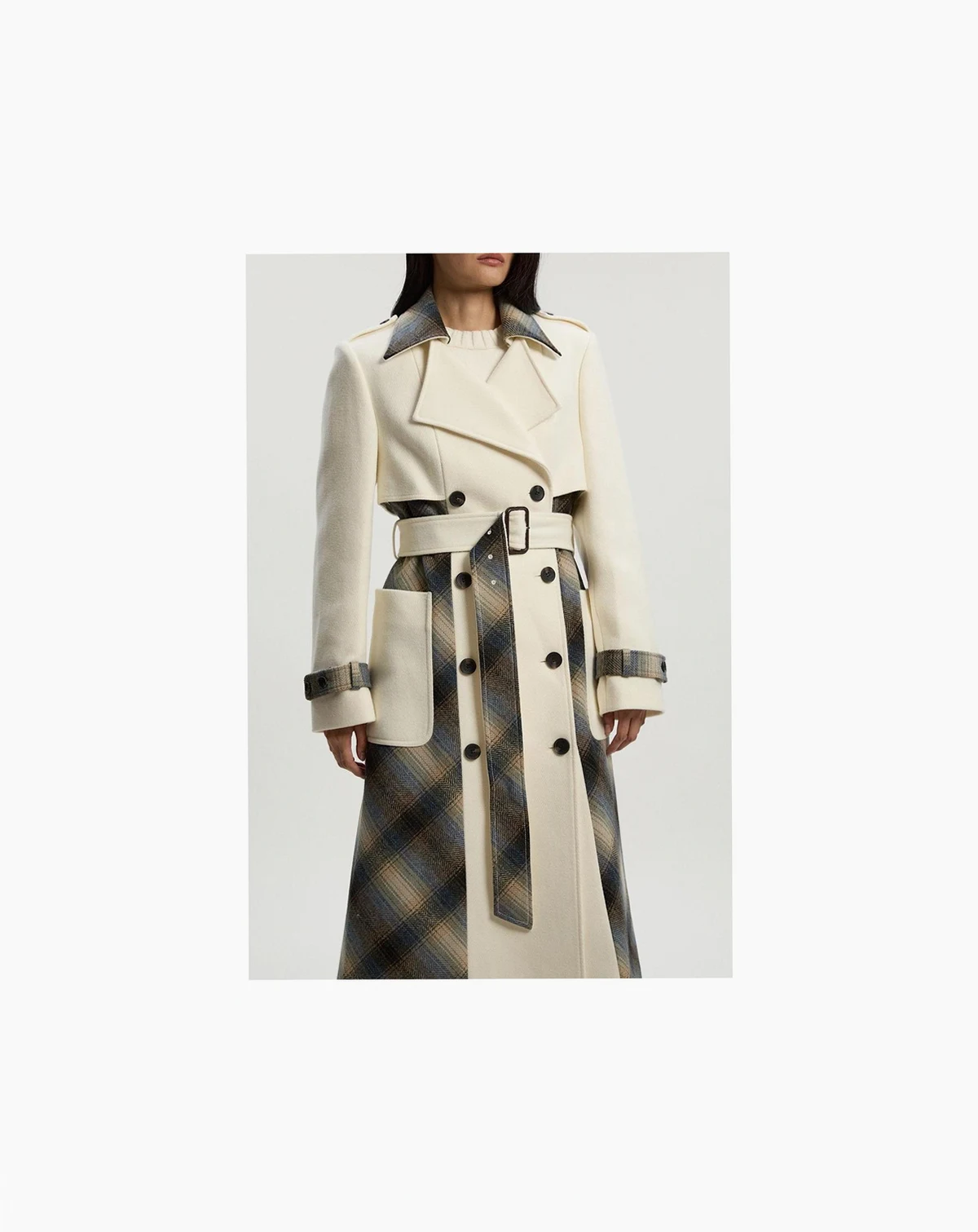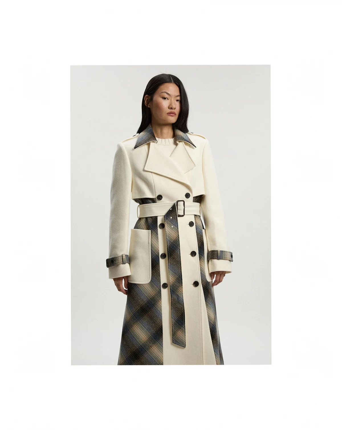 This Karen Millen wool check trench coat embodies refined daywear with its thoughtful design details and timeless appeal. The contrasting check pattern on the collar, cuffs and interior adds visual interest to this sophisticated outerwear piece. Style with wide-leg trousers and a cosy knit jumper for effortless weekend sophistication, or layer over straight-leg denim and Chelsea boots for casual family gatherings.