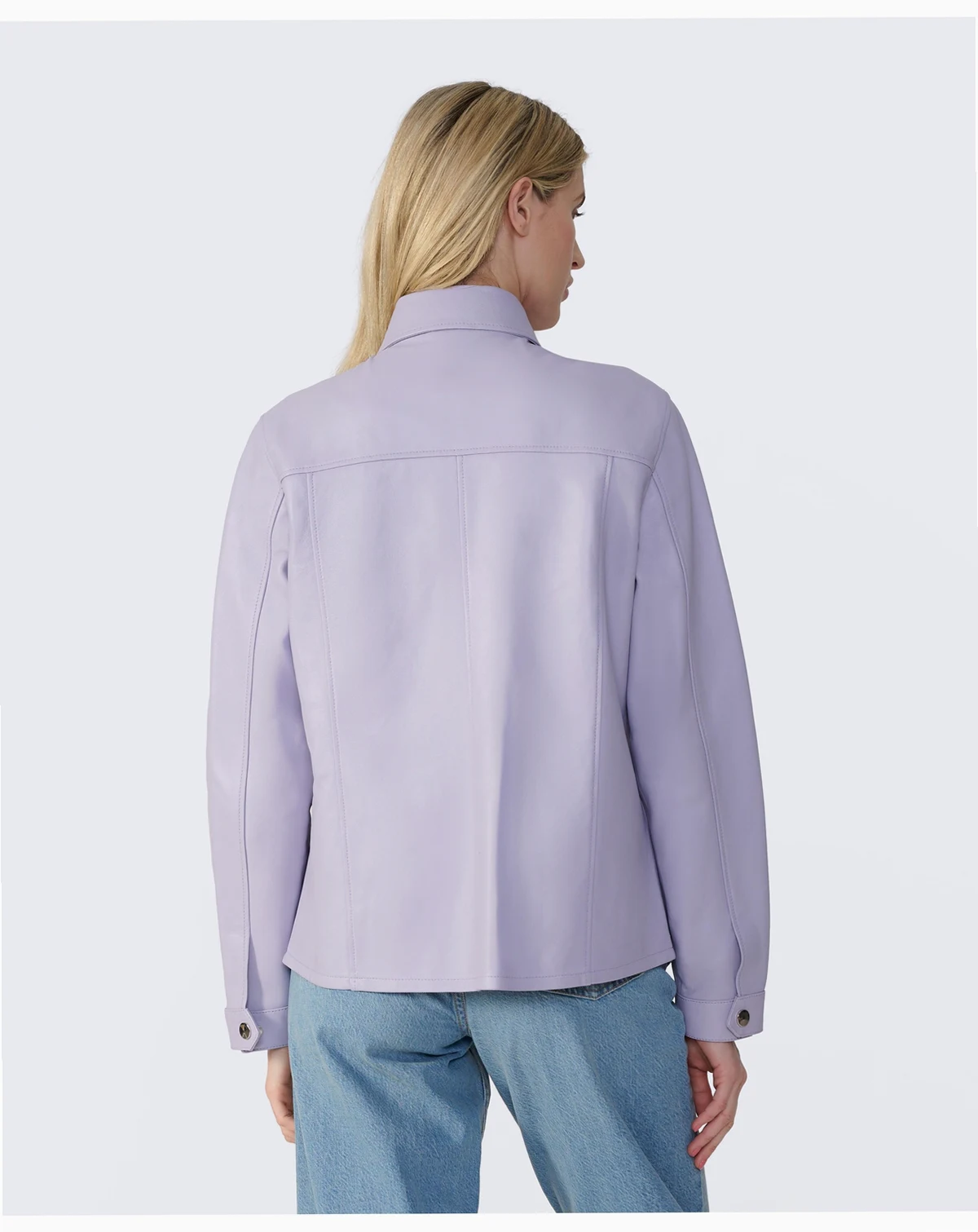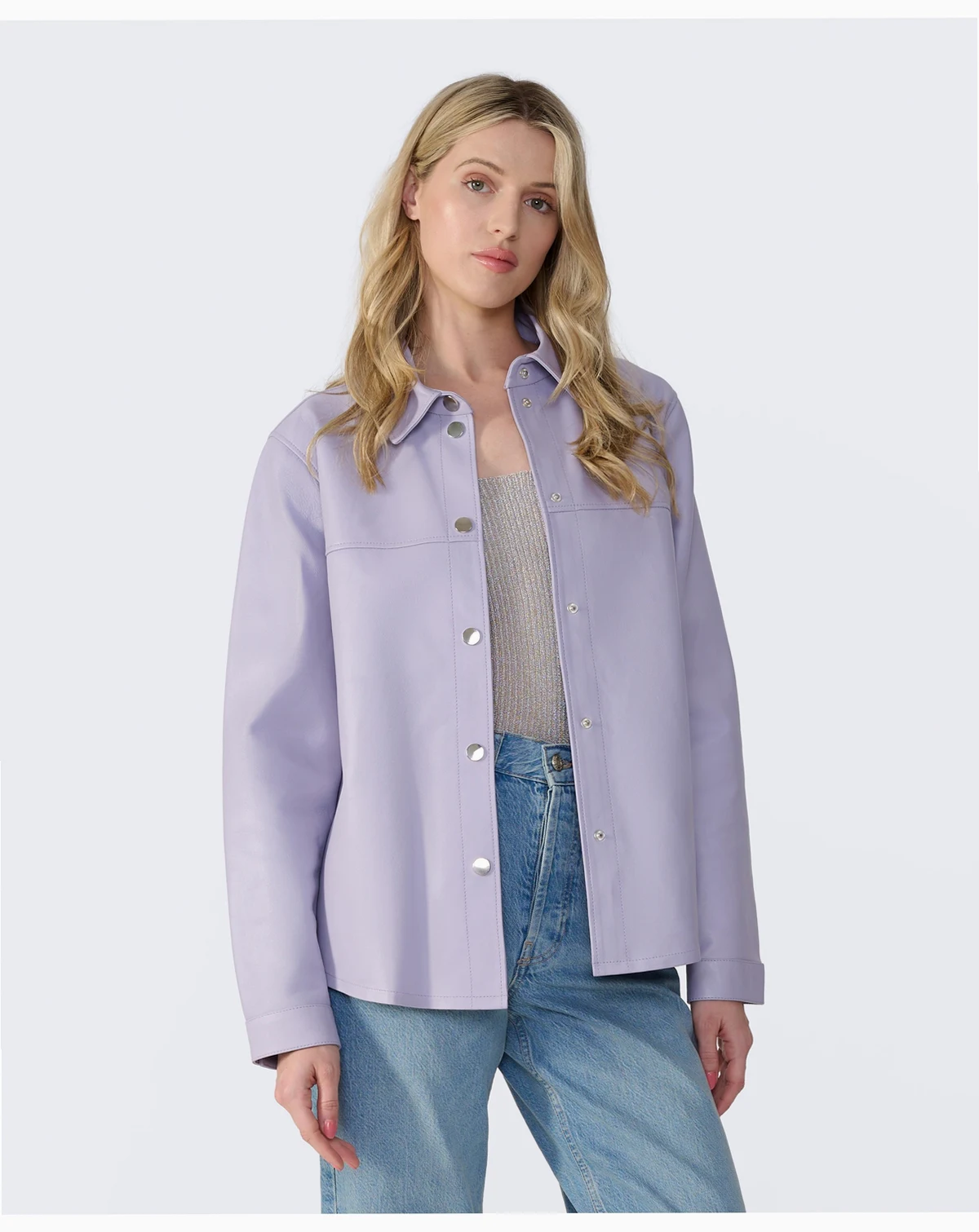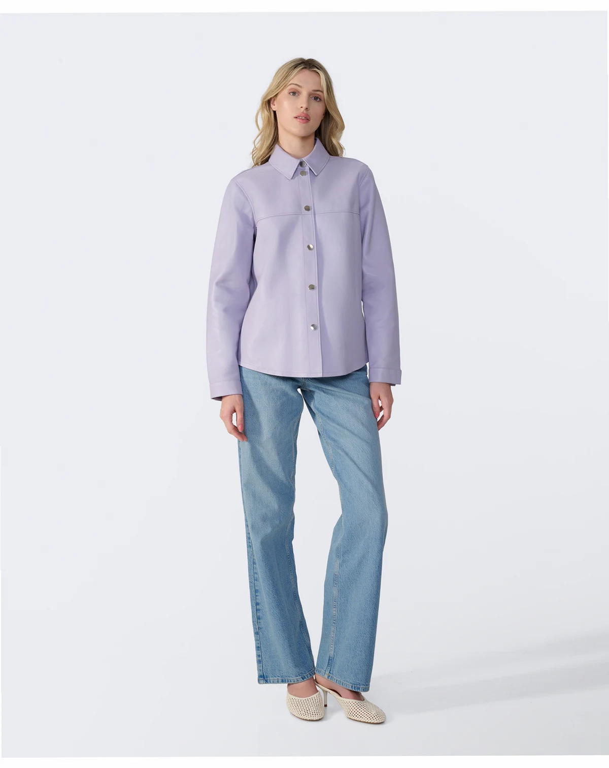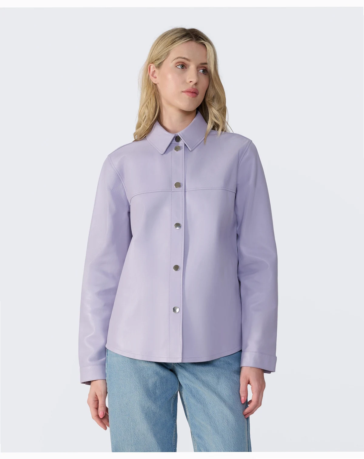 Model Height: 5 11” | Bust: 32” | Waist: 24” | Wearing Size: S Step into spring with a soft splash of color. This lilac button-down shirt jacket is crafted from genuine premium British leather, offering a dreamy balance of polish and playfulness.
