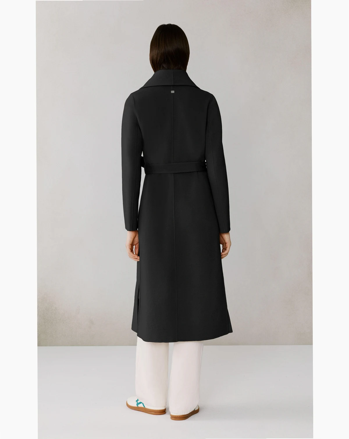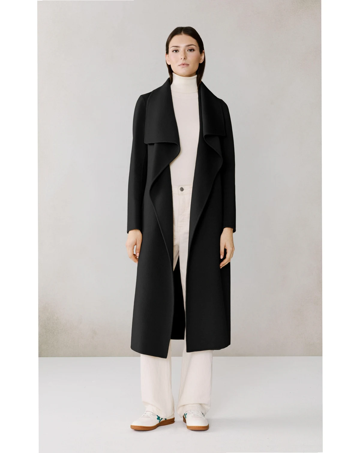 The BRITTA-U by SOIA and KYO is a fluid wrap coat with refined details. Side slits and a cascade collar soften the longline silhouette, while the belt cinches the waist. Made from double-face wool and finished with hand-sewn seams for a clean look.