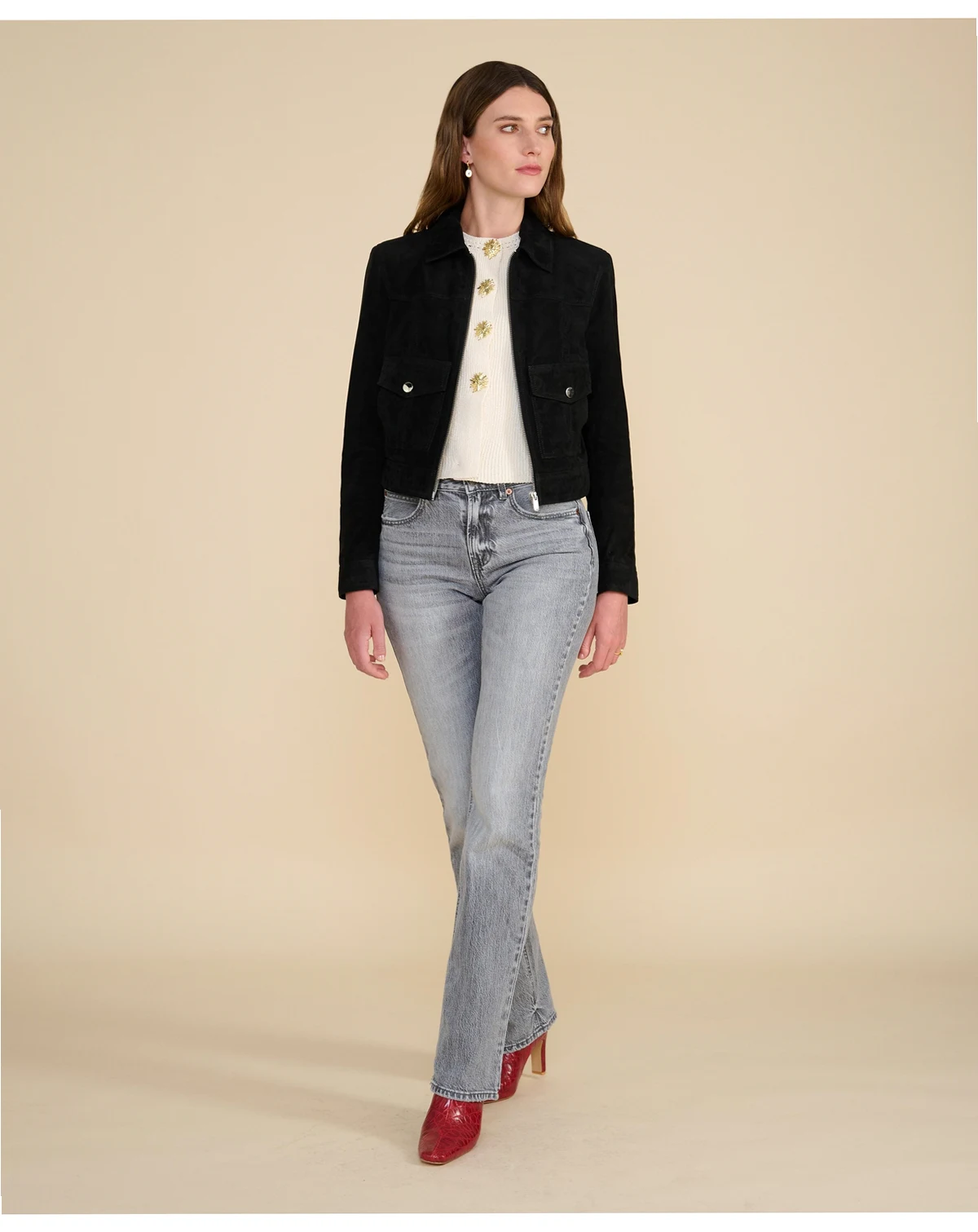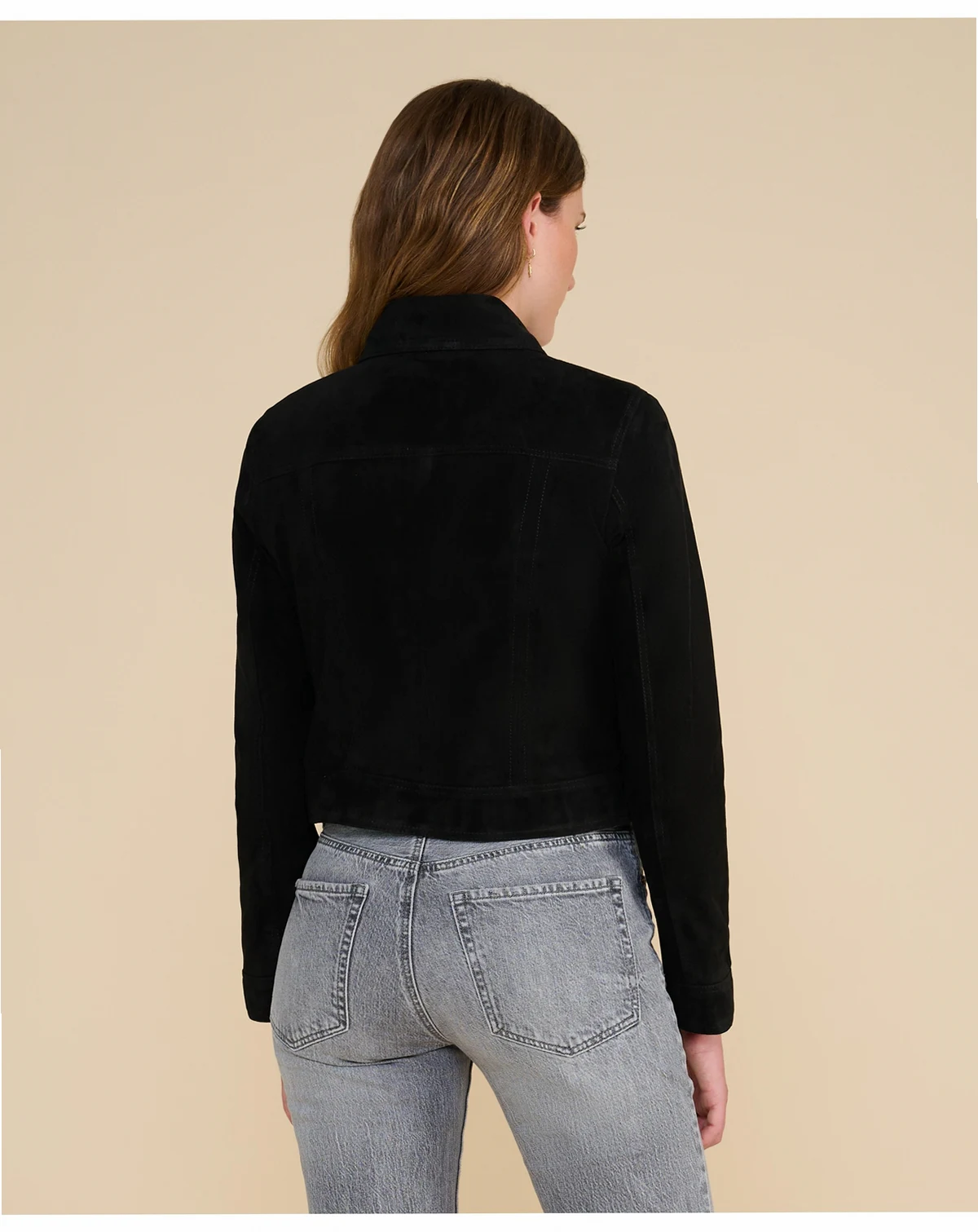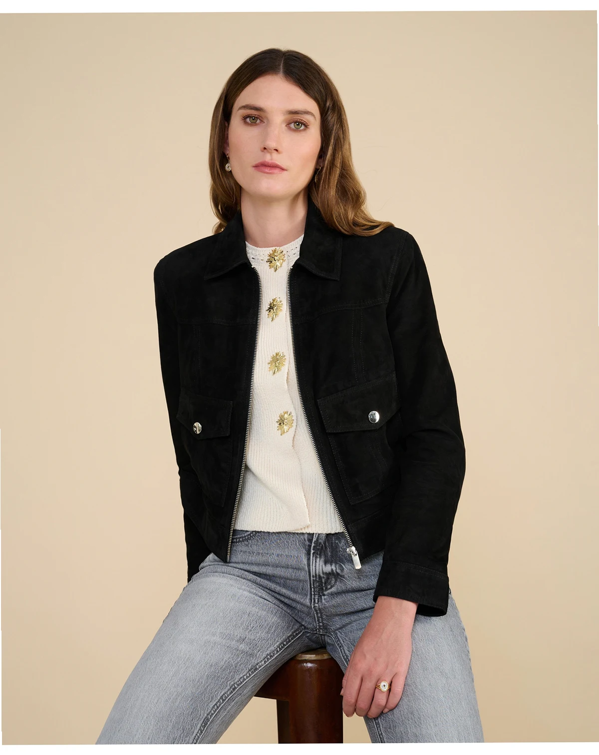 Step into spring with elevated style. Our hand-crafted cropped black suede jacket, blends timeless elegance with modern edge. Featuring front pockets, refined cuff detailing and a soft, supple texture, it's the perfect layering piece.
