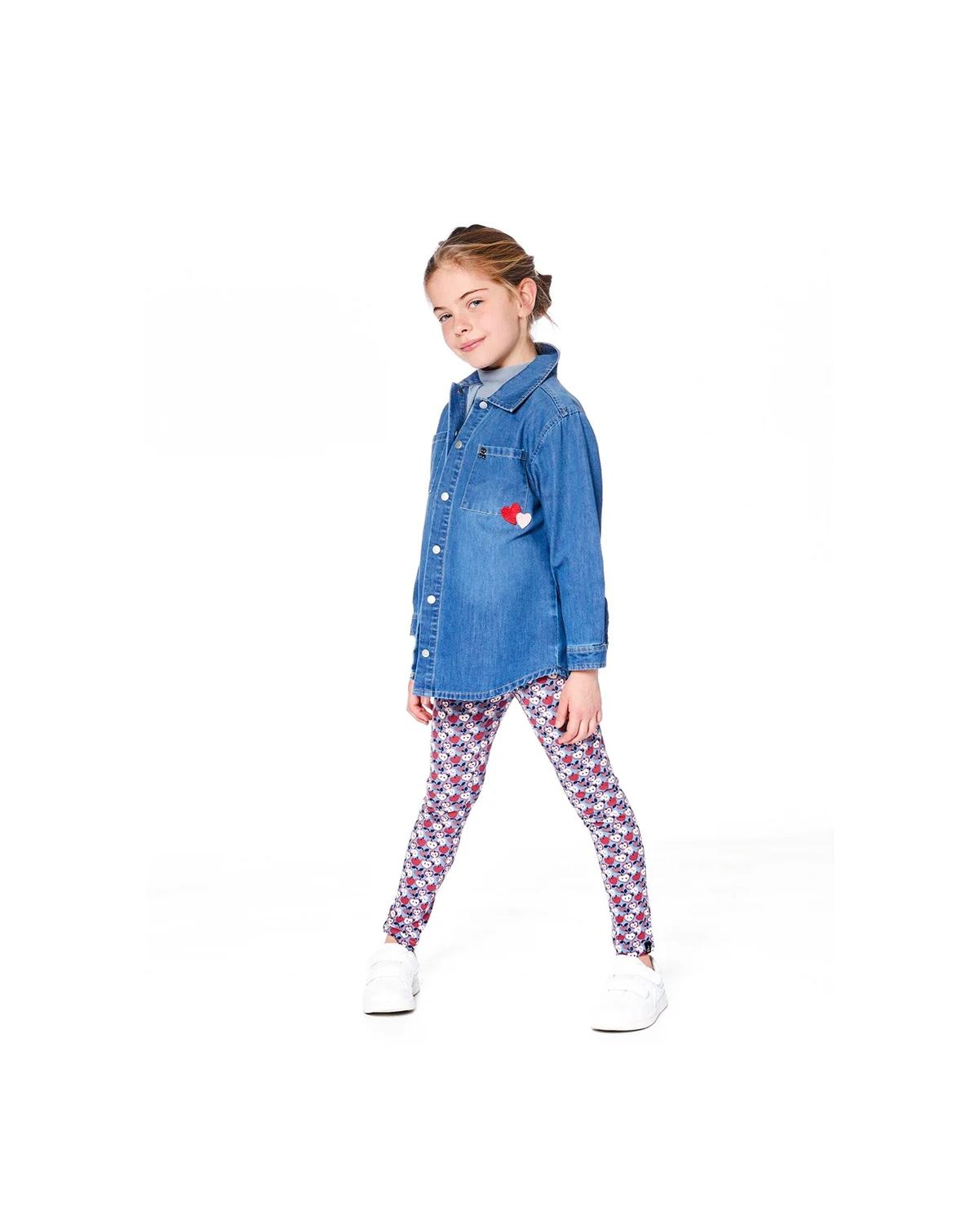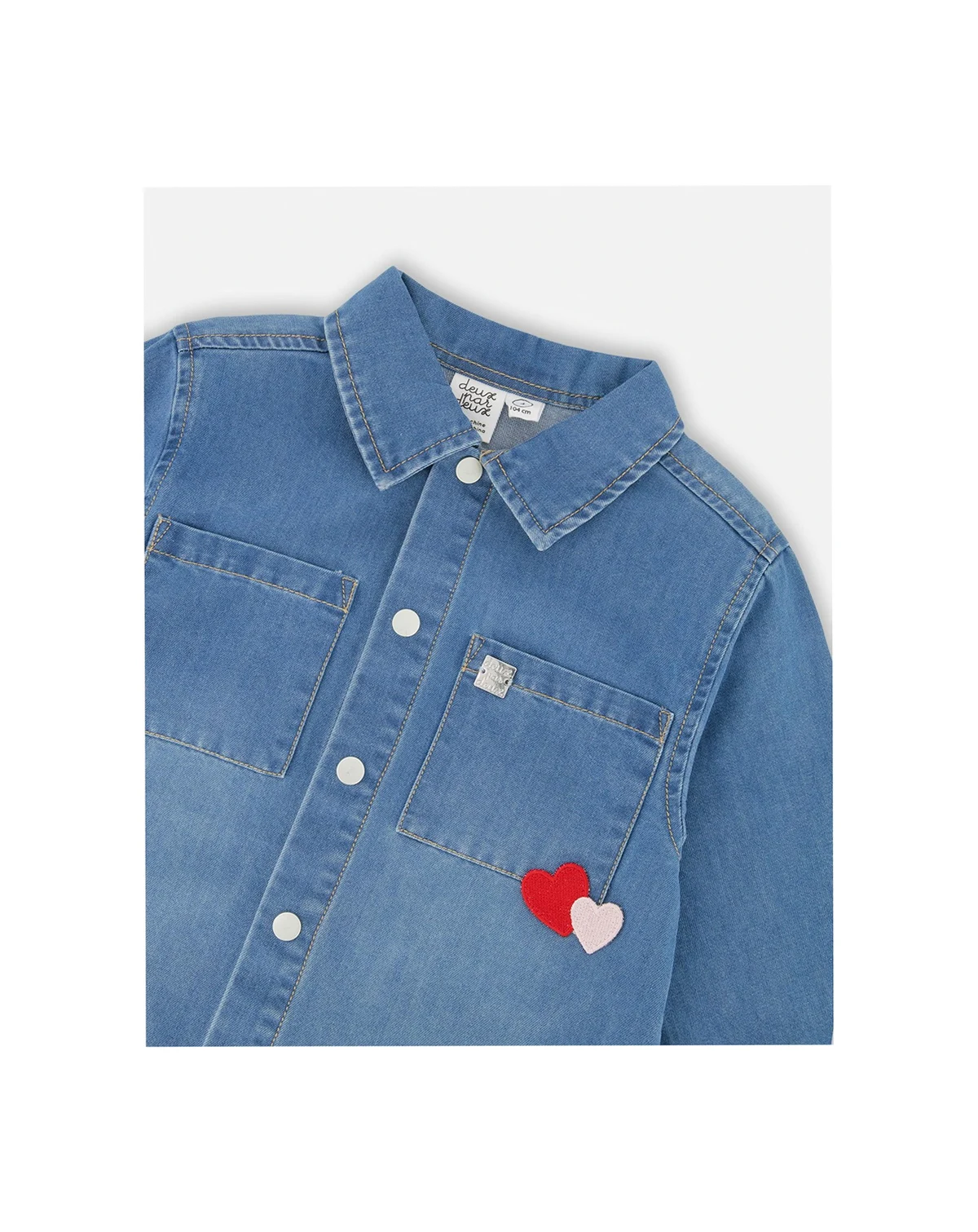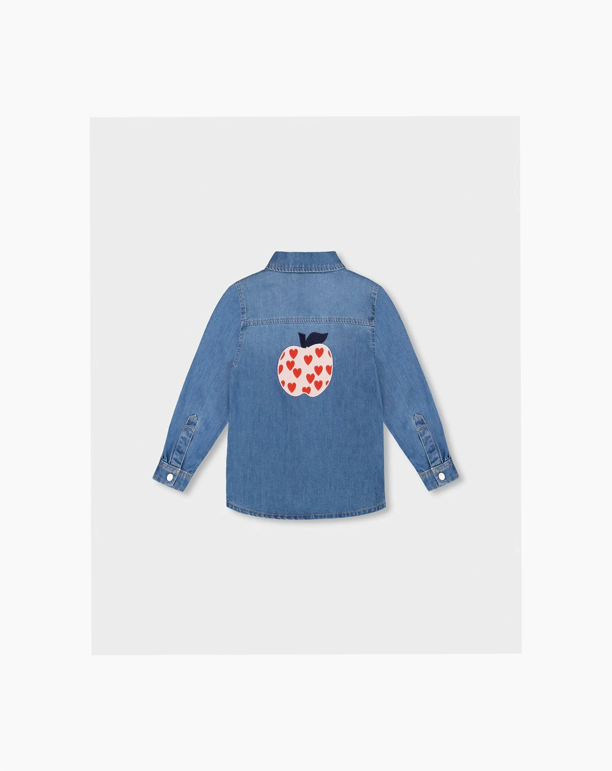 Cool and versatile, the Denim Shirt Light Blue With Patch Pockets And Apple Patch brings playful charm to a wardrobe essential for her. Crafted in soft cotton-blend denim, this long-sleeve shirt features a classic collar, curved hem, and dual front patch pockets—including one with sweet layered heart embroidery. A large apple-shaped embroidery on the back, filled with tiny red hearts, adds a fun surprise she ll love. It pairs perfectly with pieces from our “Autumn Apple Pie” collection.