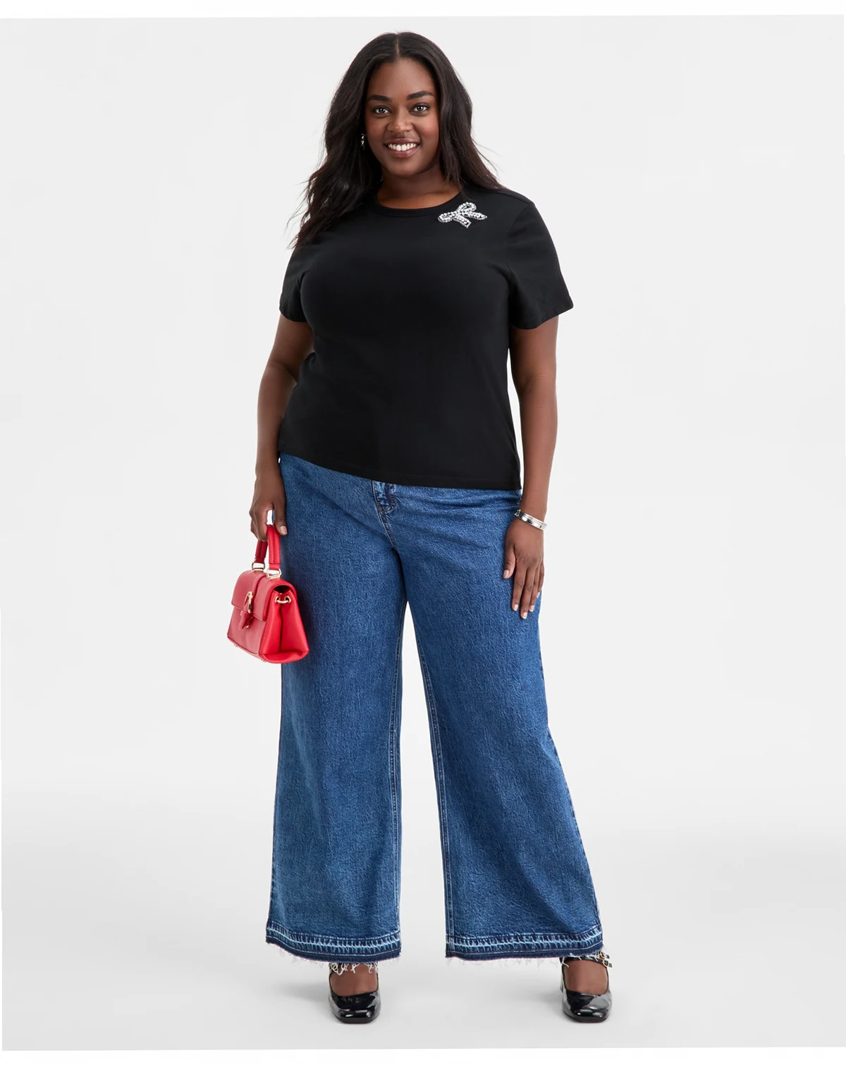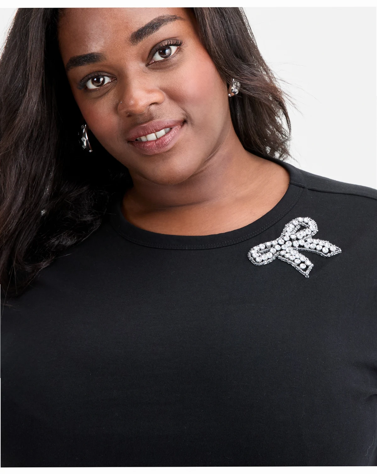 On 34th updates your T-shirt collection with this plus size design, a relaxed fit cotton piece accented with a rhinestone bow at the shoulder for a charming finish. ABOUT THE BRAND: Our brand was designed for, and with women like you. Made for your body, your style, and your truth. As your wardrobe's best friend, these mix-and-match pieces work with everything in your closet.