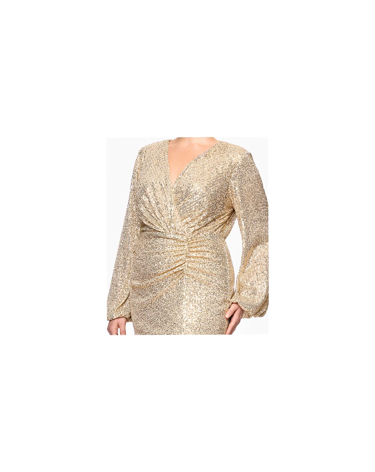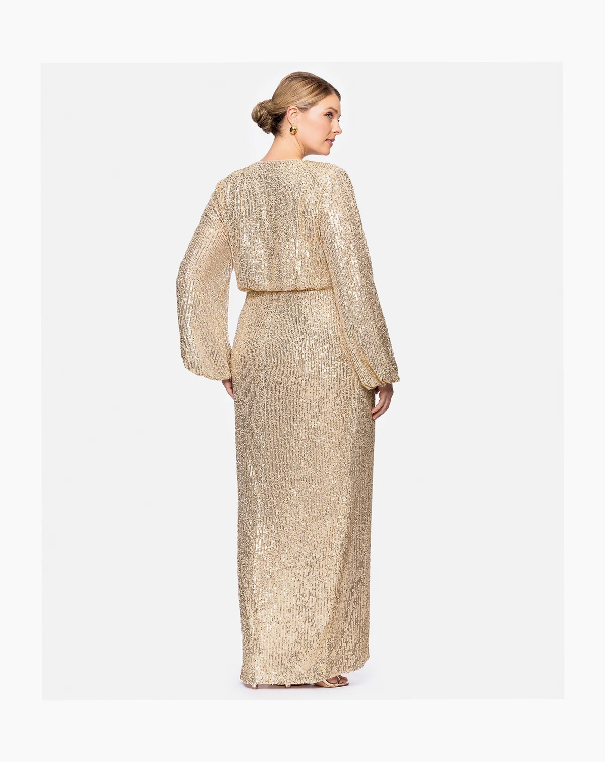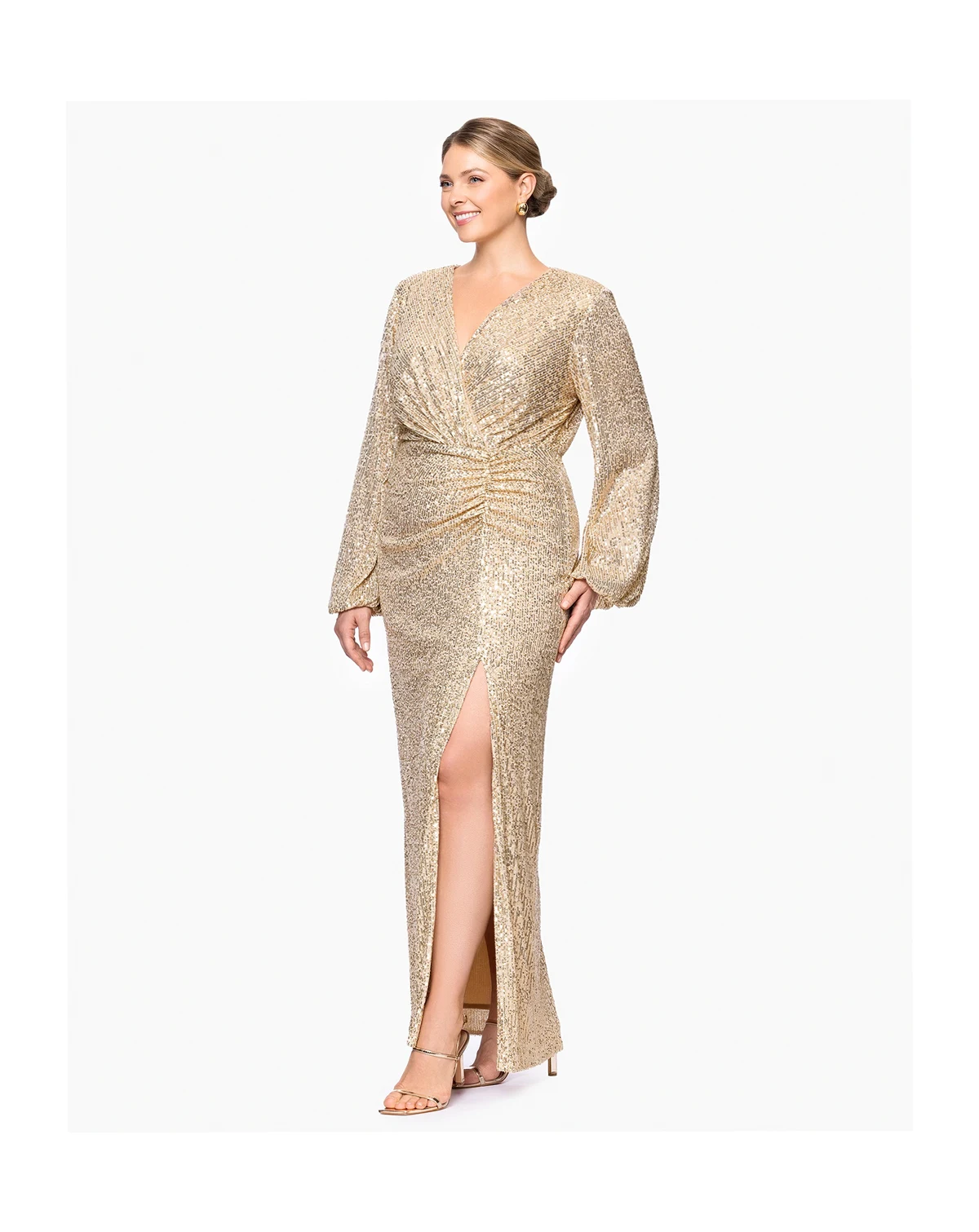 Made to be seen, this Betsy & Adam plus long sleeve sequin dress is designed in a sleek sheath silhouette and dramatic bell sleeves. Perfect for a formal event, it features a flattering V-neck and secures with a center back zipper.