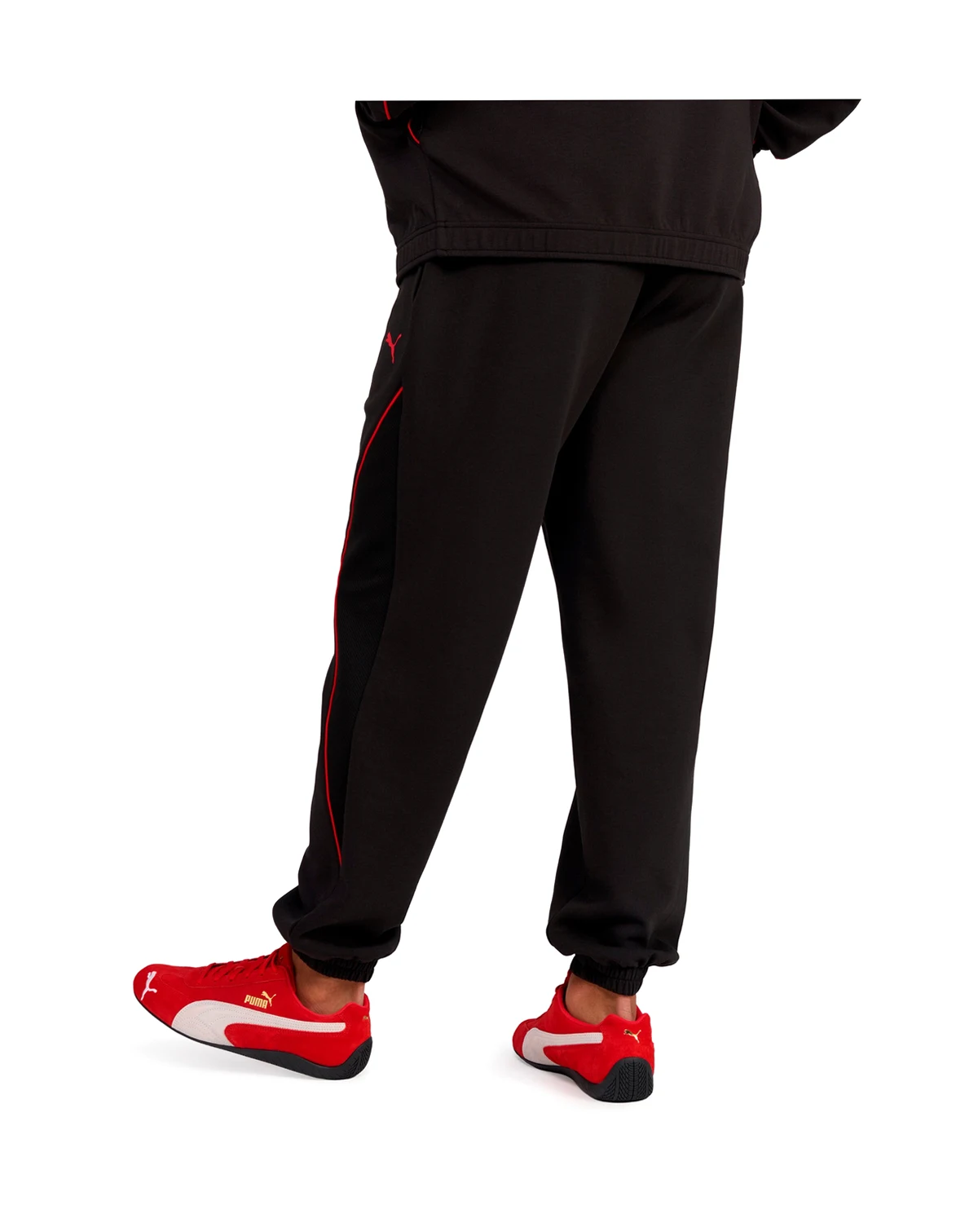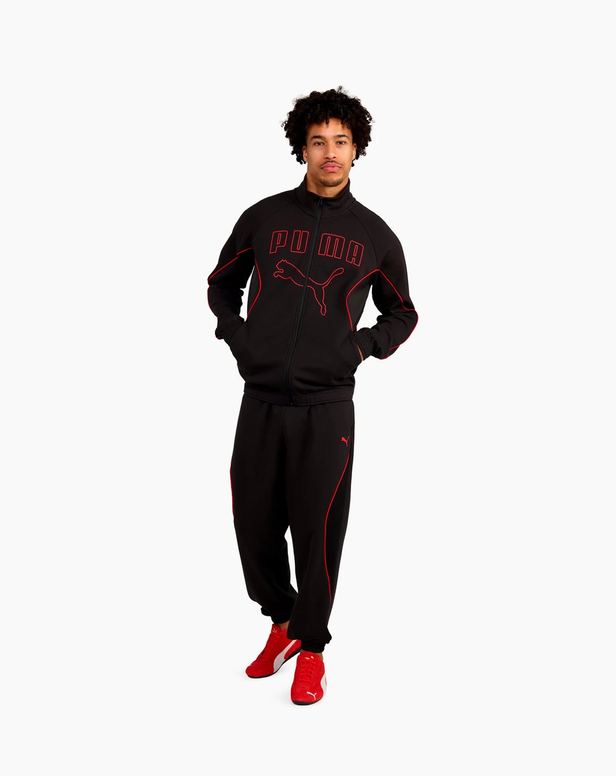 Modern athletic styling defines these Puma sport double-knit track pants, which feature a drawstring waistband for adjustable support. A regular silhouette enhances flexibility, and elasticated cuffs create streamlined shaping.