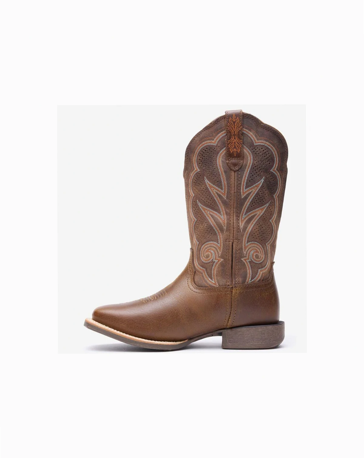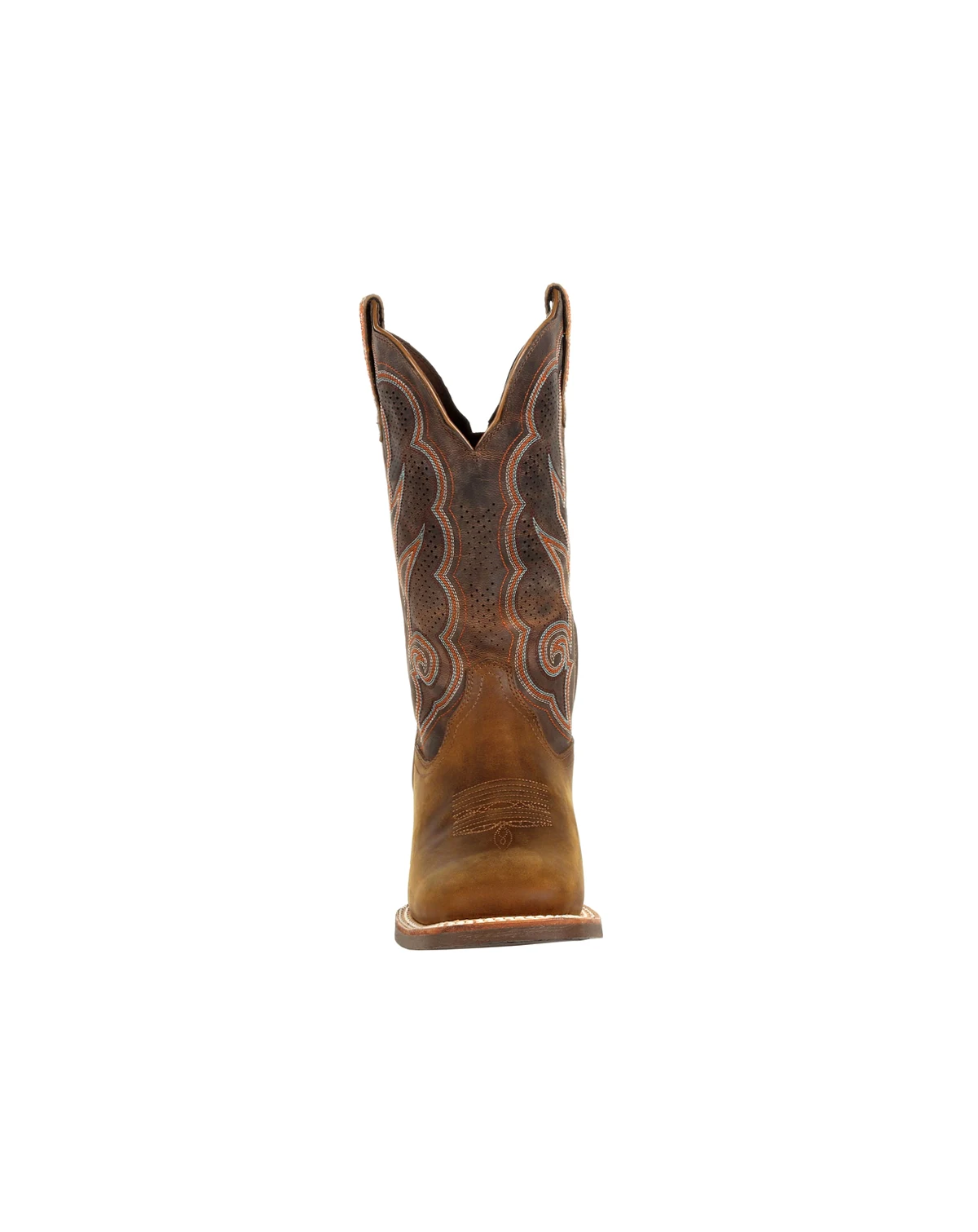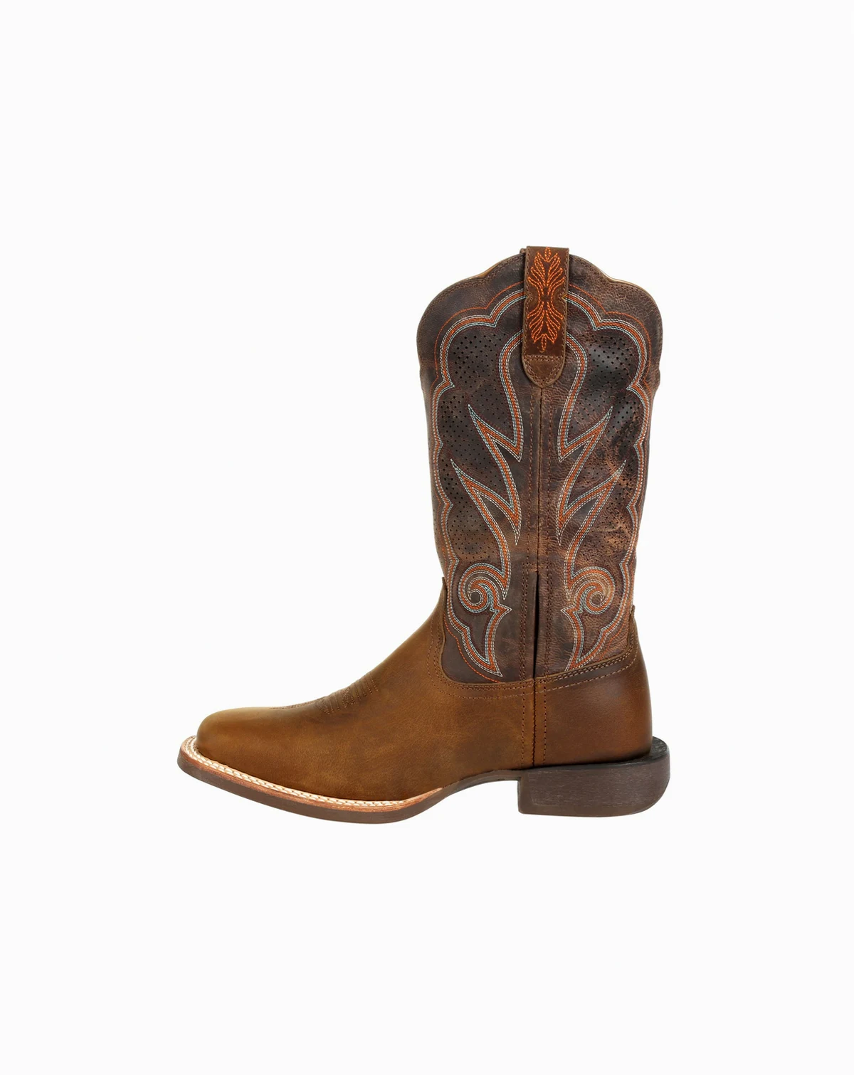 Step into comfort and performance with the Durango Lady Rebel Pro 12 Western Ventilated Boot in the color Distressed Cognac. Made with full-grain leather, this style features the Durango X-Treme A.C. ventilated shaft with air mesh lining, the Durango X-Pand System for a universal fit, and the Easy Fit System for calf expansion. It features a 7-layer comfort system: a Triple X-Treme Comfort Footbed with memory foam, an EVA cushion layer that molds to your foot, ¾ welt construction with a genuine leather welt and double row cotton stitch, a two-layer innersole with a full-length flexible bottom and rigid ¾ heel tuck, the Dually Shank System with two fiberglass shanks for medial and lateral stability, an ABS heel base for lightweight durability, and a slip, oil and abrasion-resistant rubber outsole.