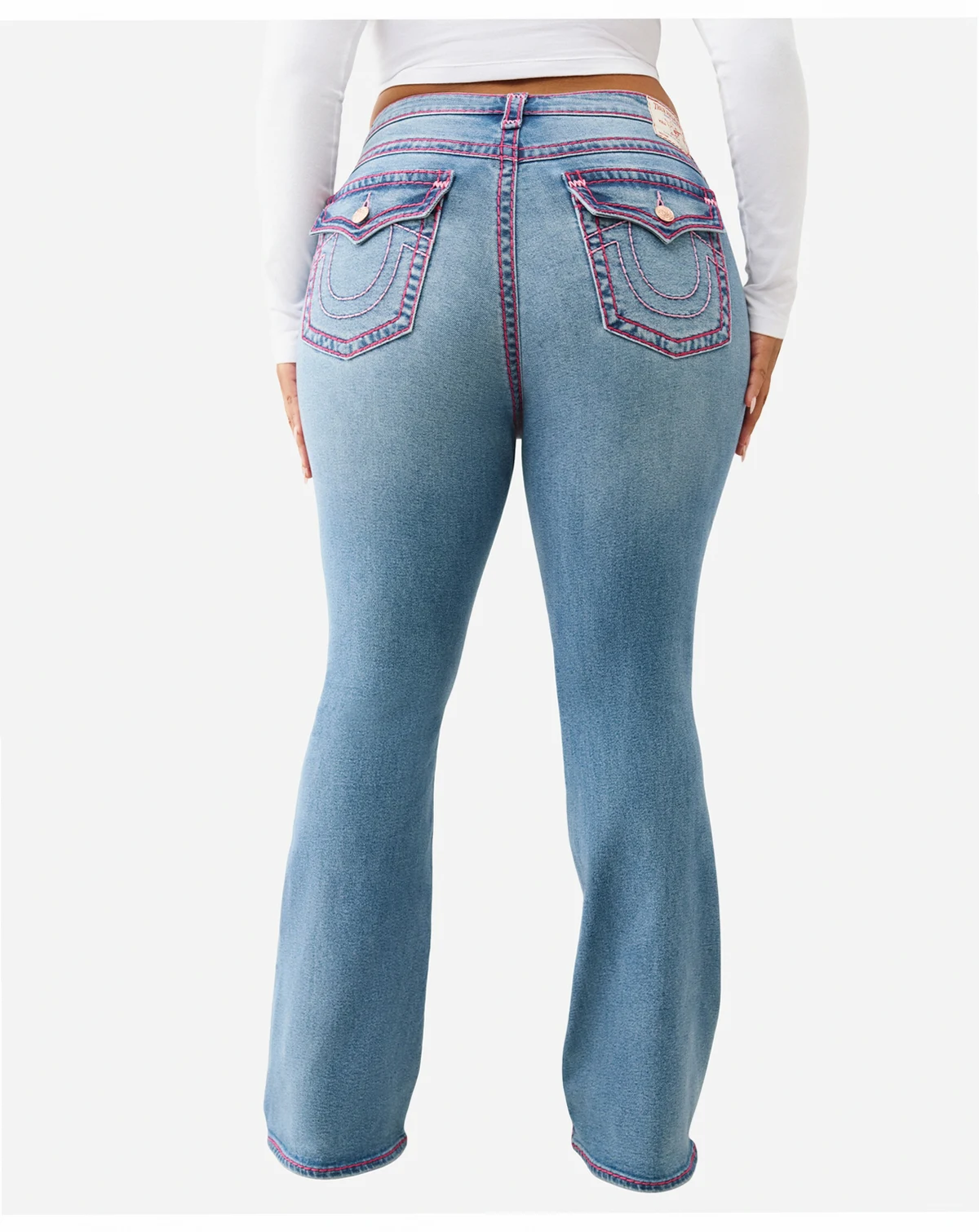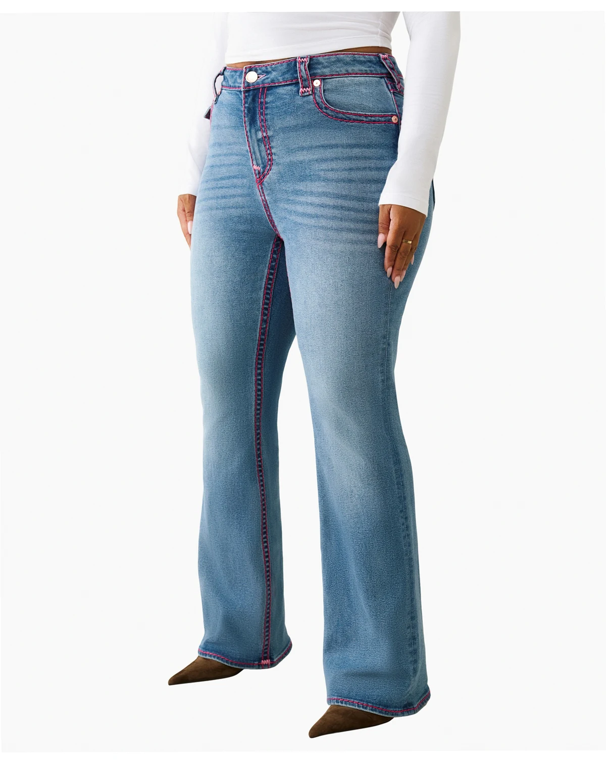 The Plus Becca Mid Rise Super T Bootcut Jean delivers timeless and effortlessly flattering vibes. Featuring a leg-lengthening fit, this pair features whiskering, contrast Super T stitching, and is finished with horseshoe detailing on the back flap pockets.