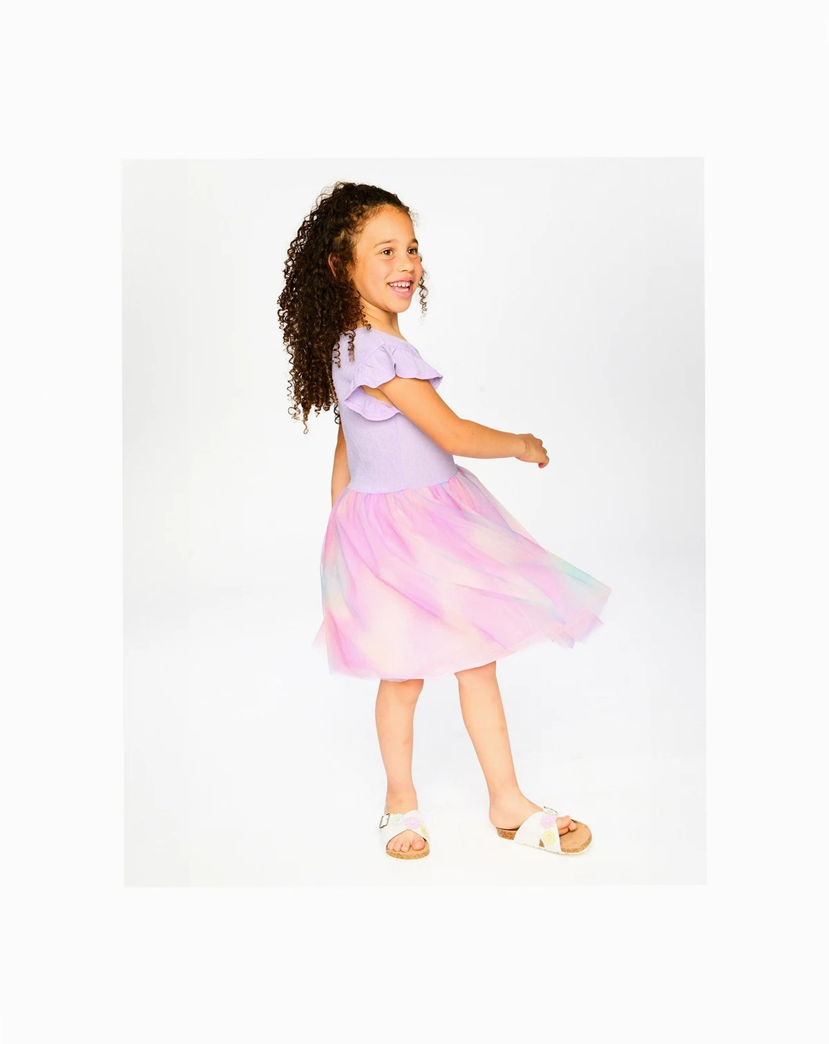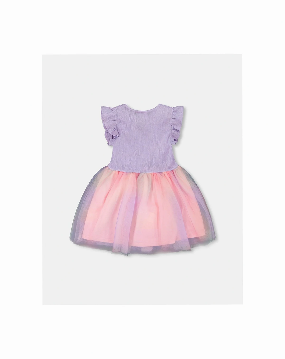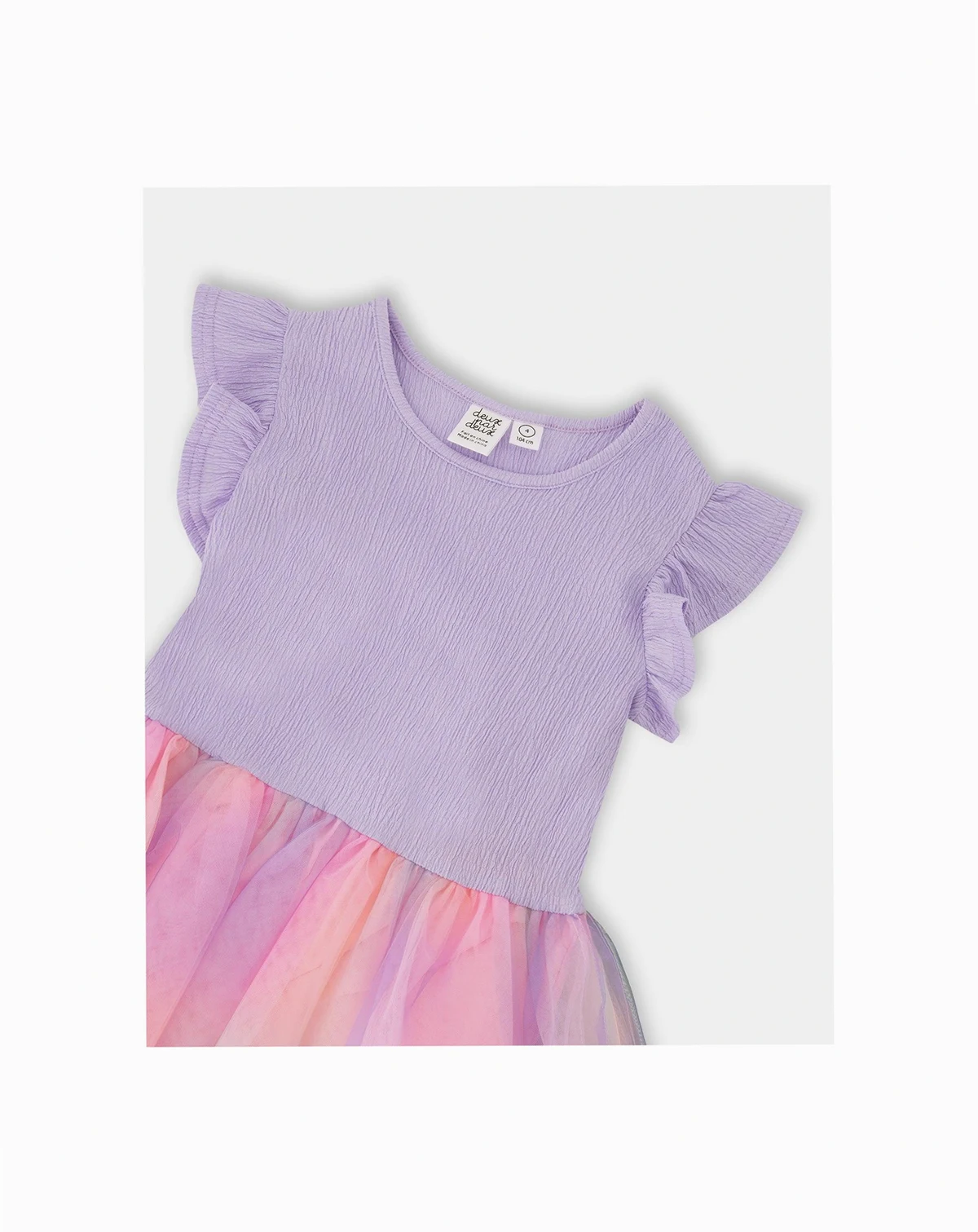This bi-material dress in lilac blends structure and lightness with a playful twist. The dress features a bodice with a straight, textured cut and flutter sleeves, while the skirt stands out in airy mesh, flaring gracefully with a rainbow gradient finish. The contrast between the solid top and the flowing mesh skirt makes this dress truly enchanting for special celebrations.