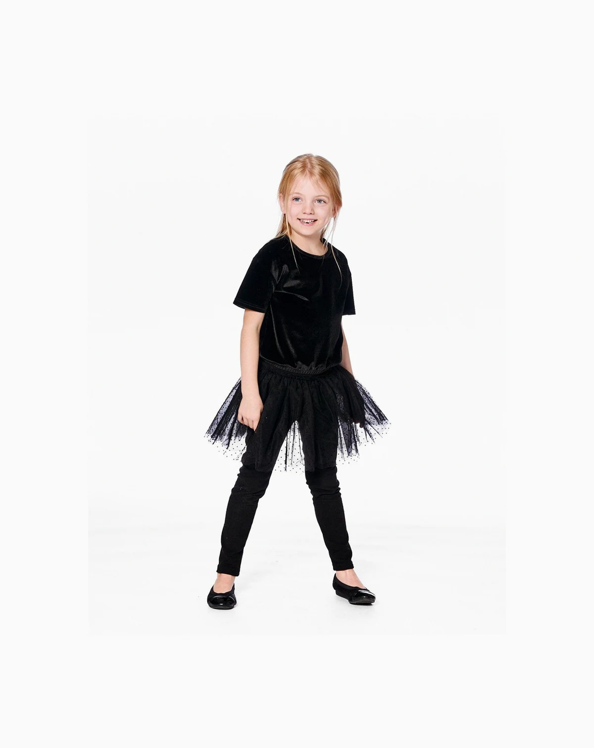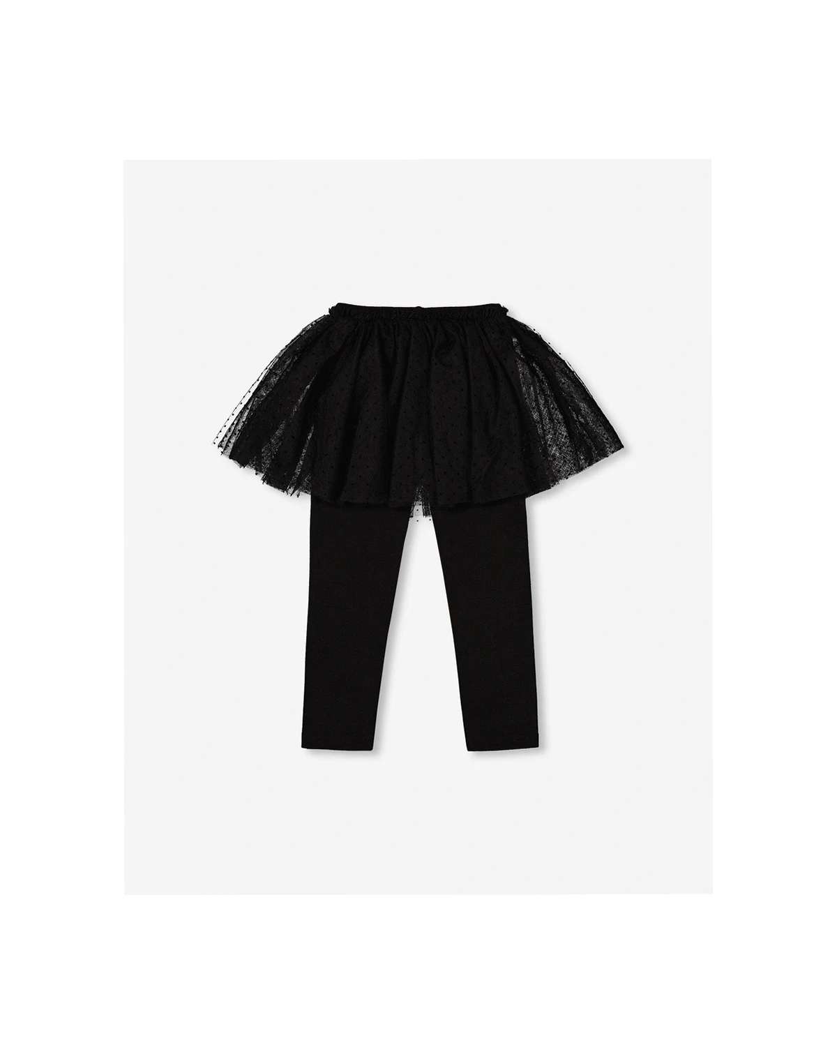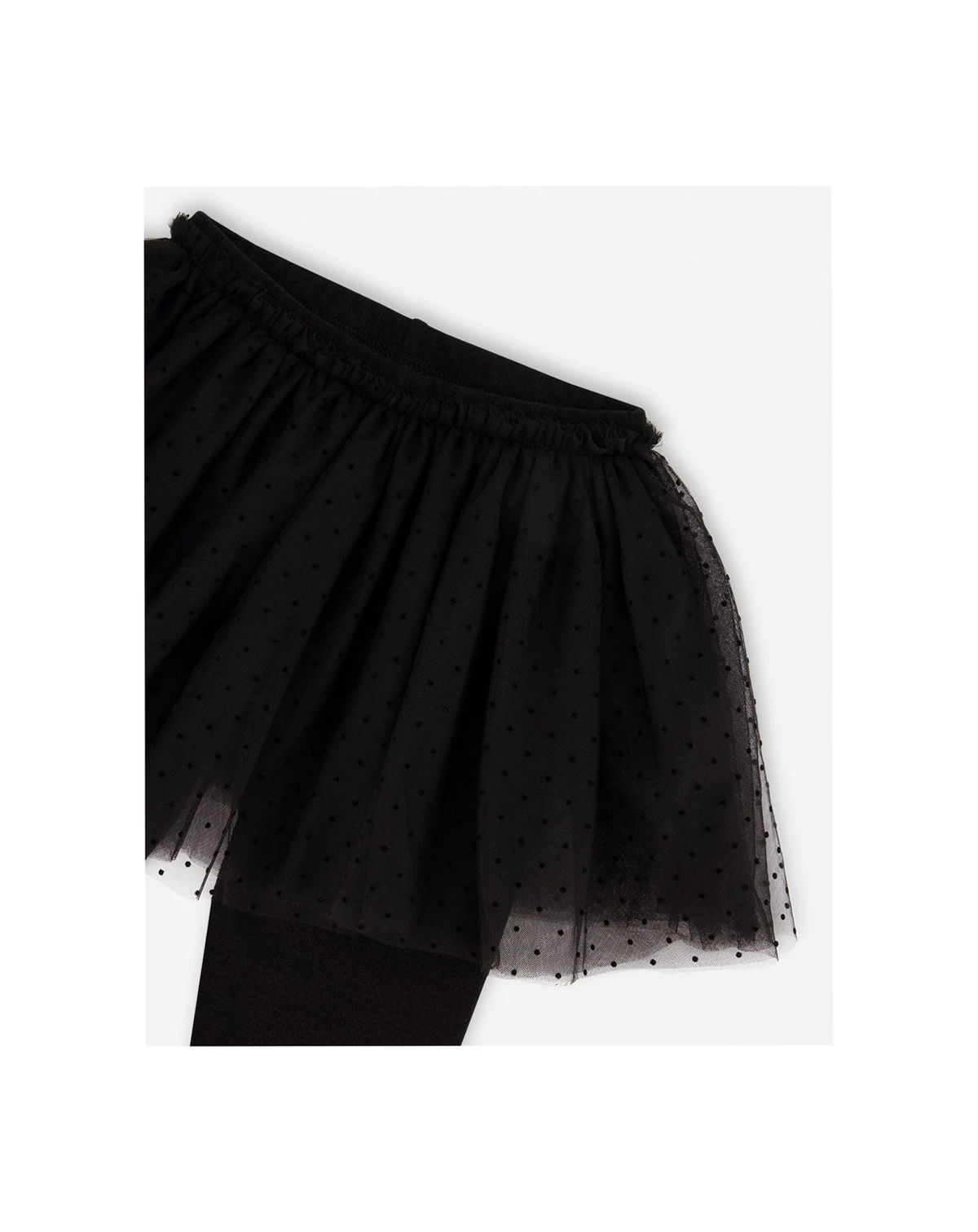 A tulle skirt overlay adds texture and whimsy to these oh-so-essential bottoms. A must-have for the girly girl who loves the comfortable feel of leggings, this adorable one-piece design features a stretch elastic waistband, a vertical ribbed texture, and a flared tulle skirt with an allover dot pattern.