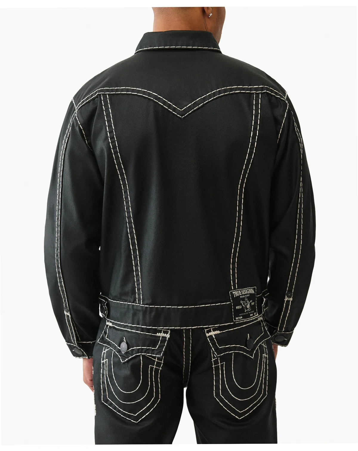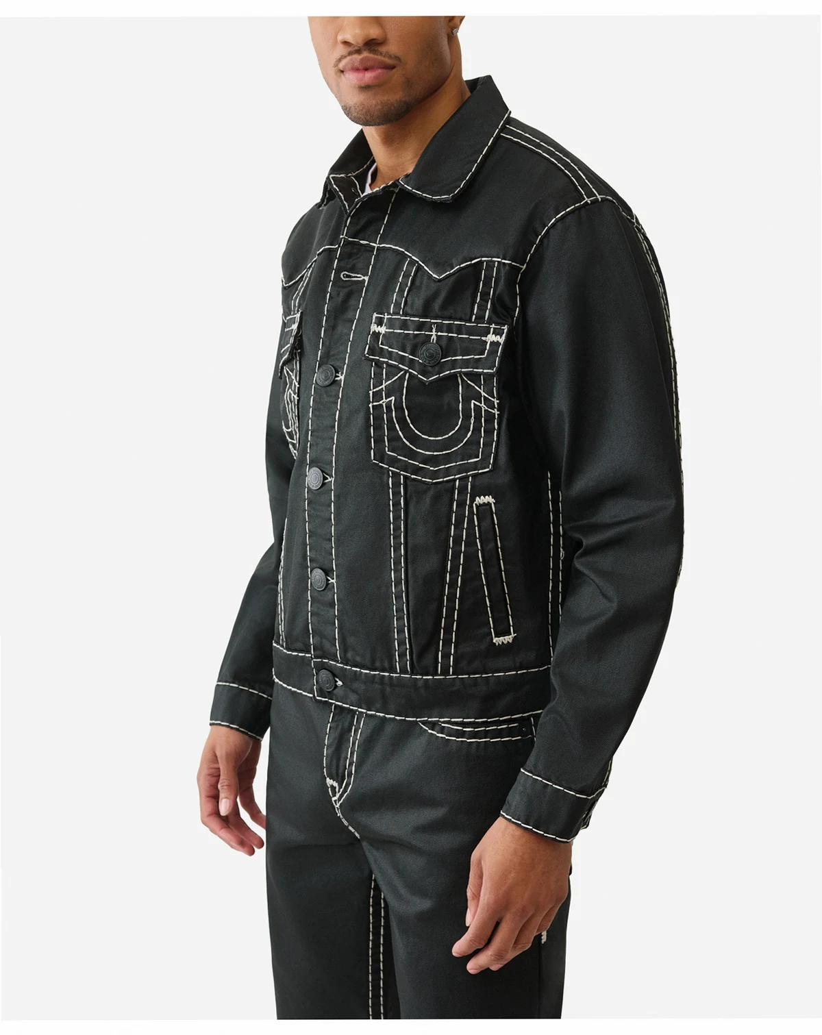 Crafted in a black wash, this True Religion jacket features a button-up front and western-style yokes for a rugged look. Our iconic Super-T stitching completes the oversize design.