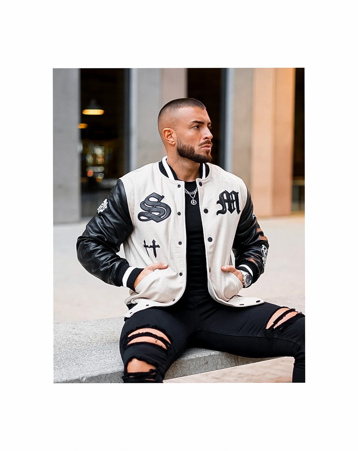 You'll want to take a closer look at this varsity Jacket. A variety of mixed media graphics on a melton wool body and PU leather sleeves make this jacket a premium piece to own.