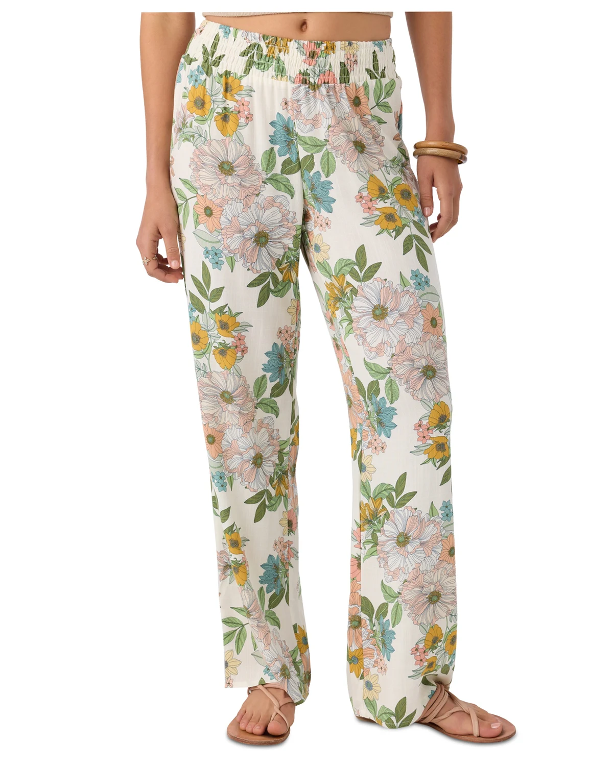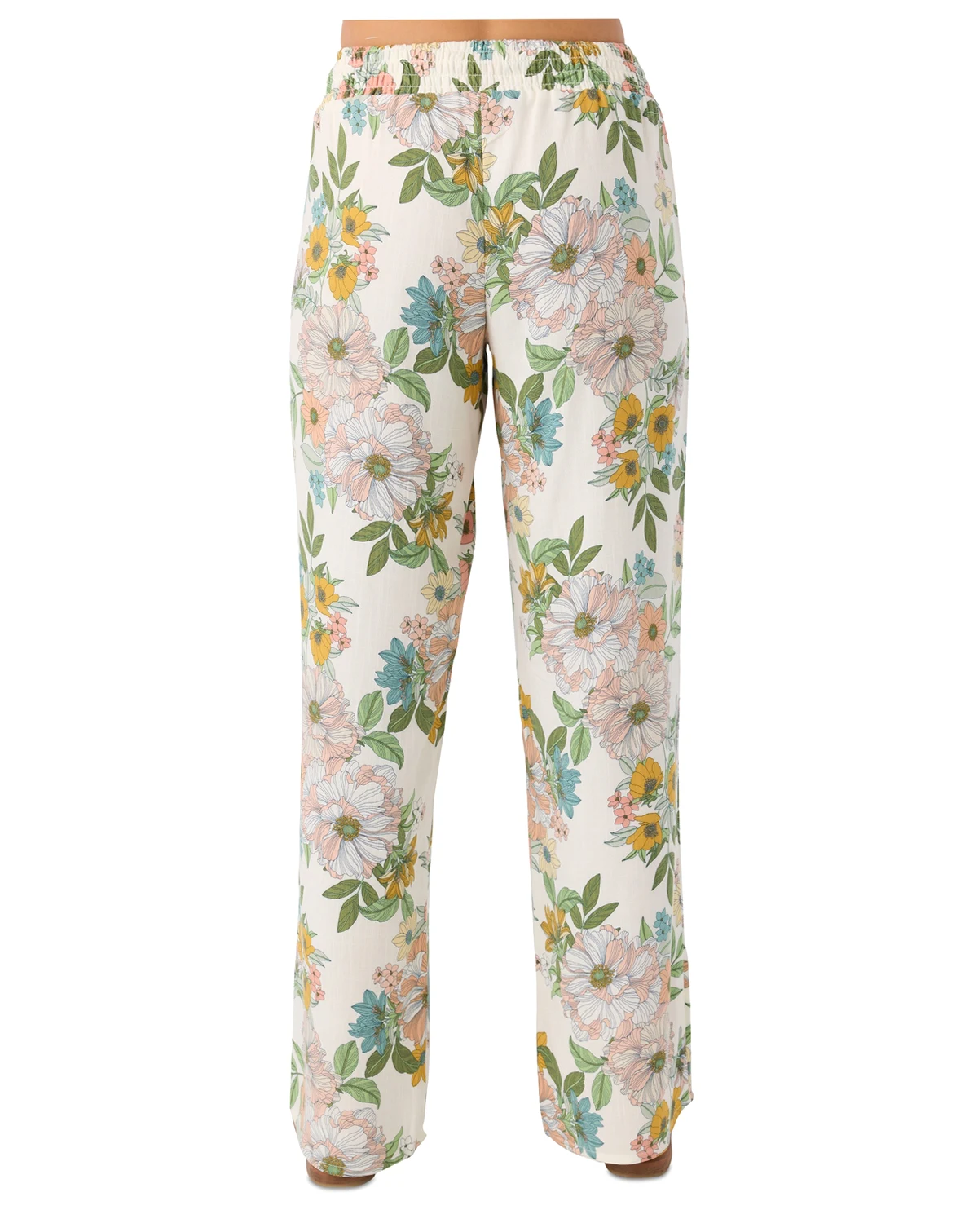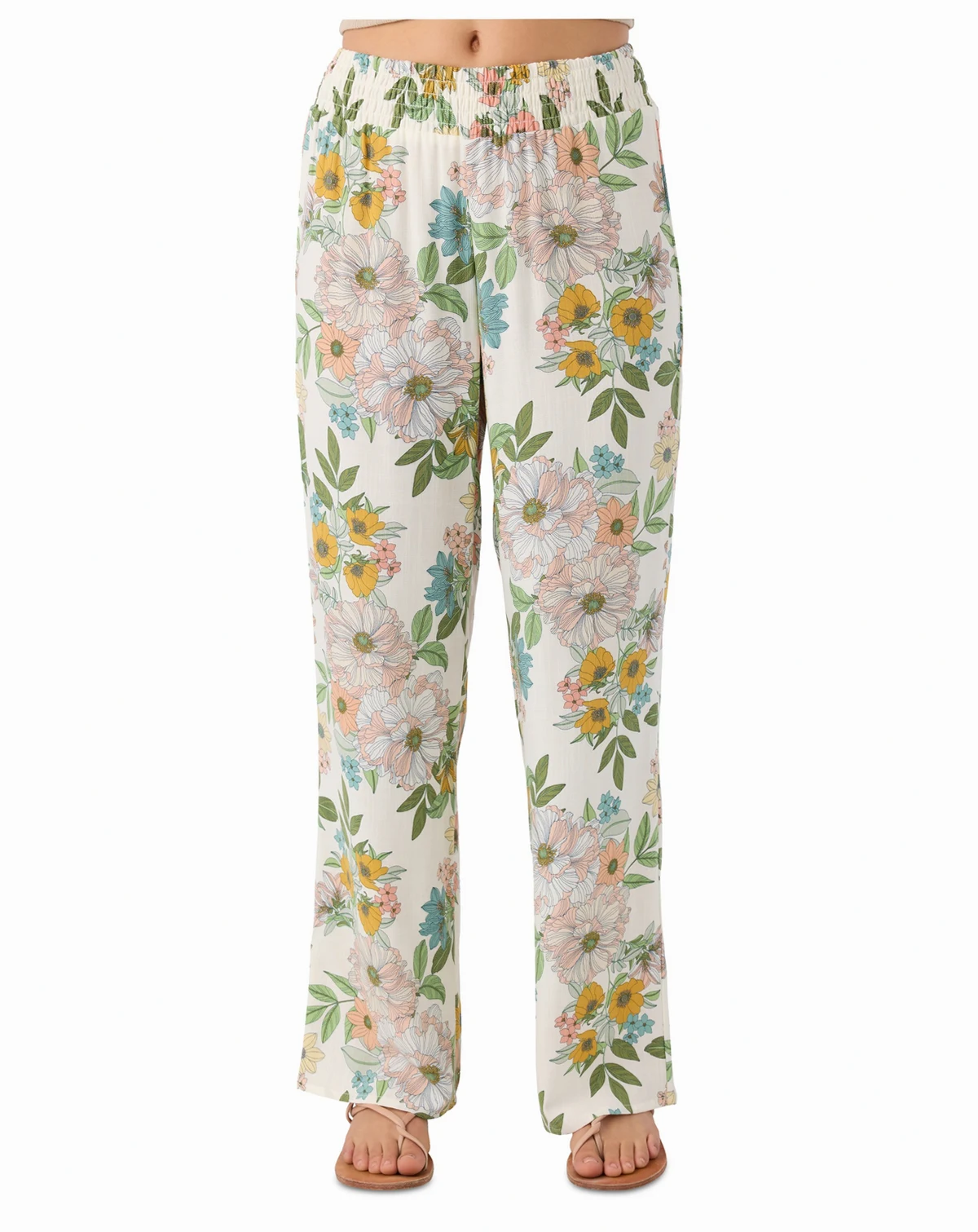 Cute and comfy, these woven pull-on pants from O'Neill have a smocked elastic waistband, flowy fit, and allover print.