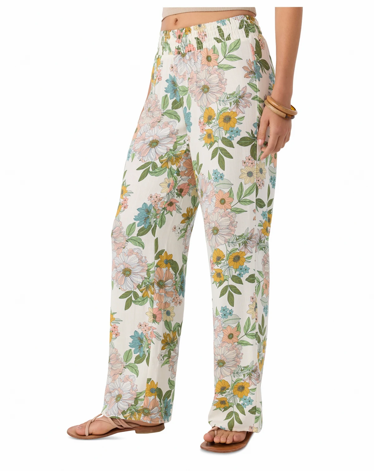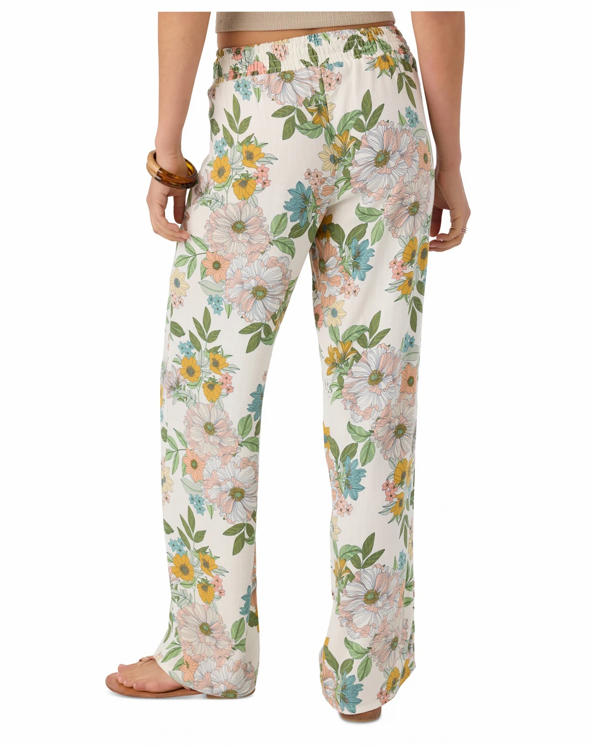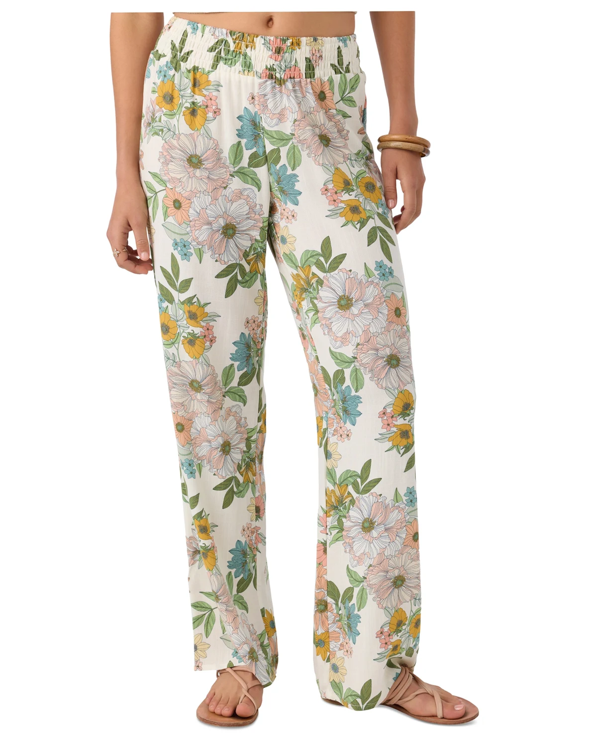 Cute and comfy, these woven pull-on pants from O'Neill have a smocked elastic waistband, flowy fit, and allover print.