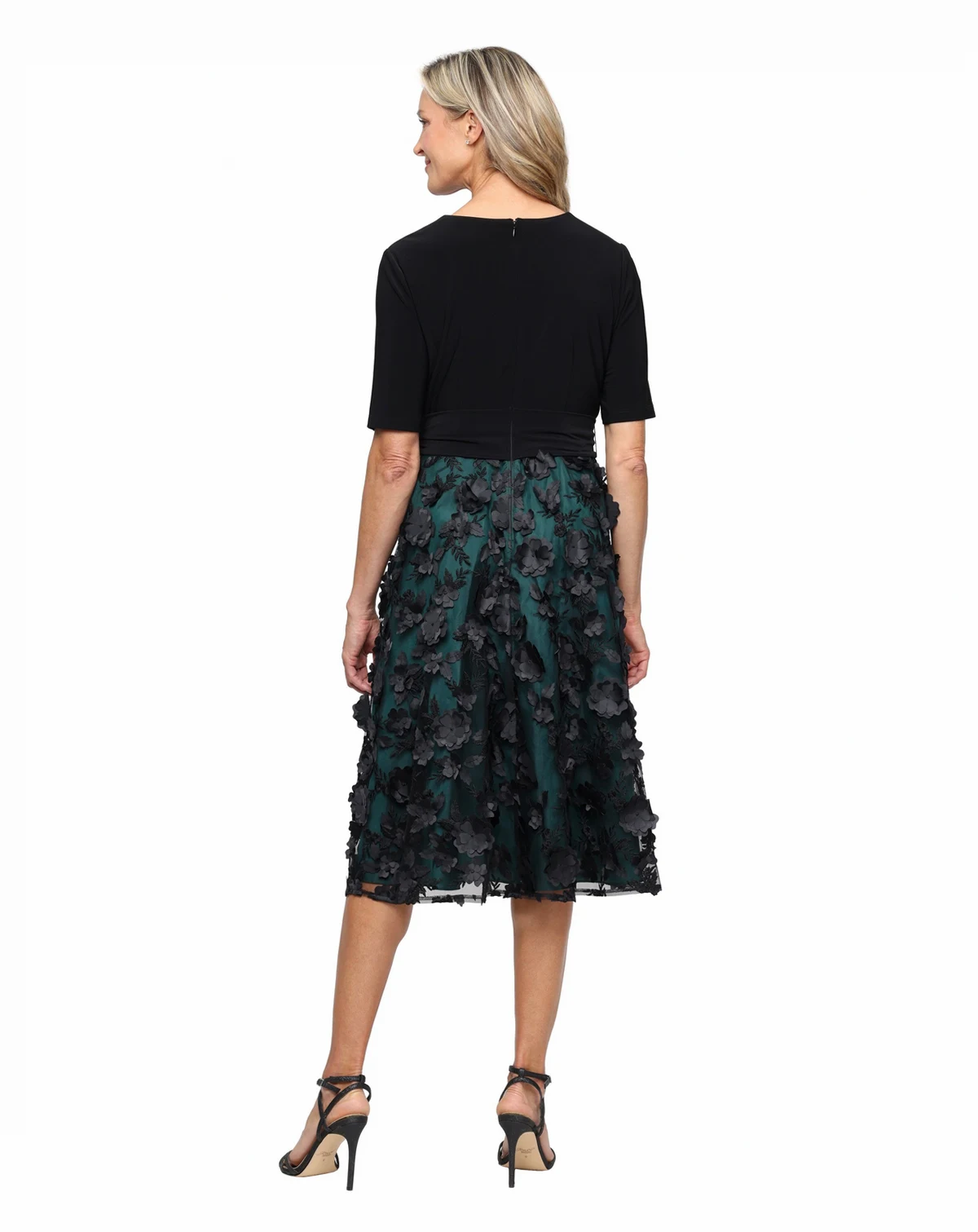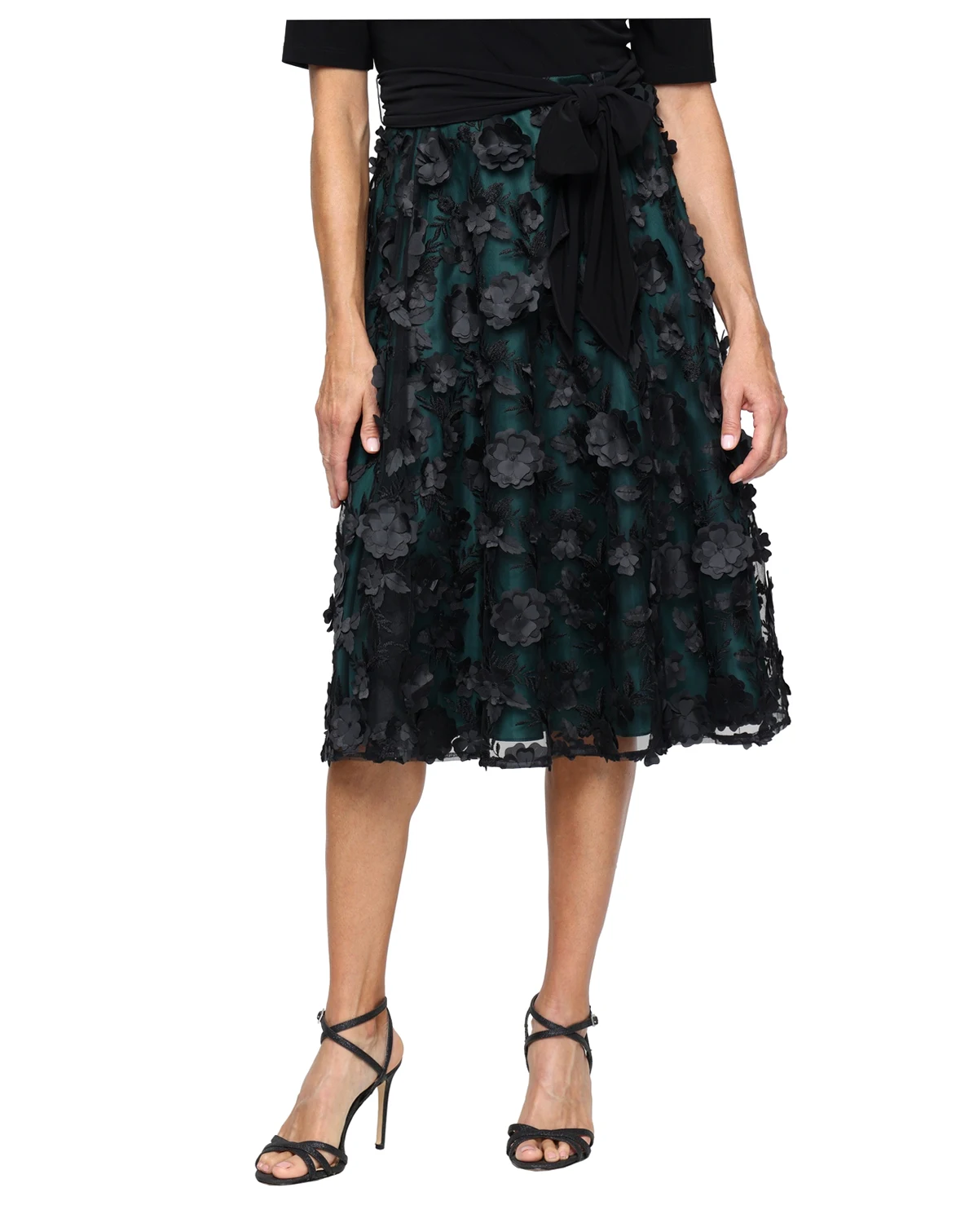 Adorned with a three-dimensional flower skirt, this Alex Evenings midi dress combines a surplice jersey bodice and elbow sleeves. The tie waist defines the A-line silhouette for a graceful formal look.