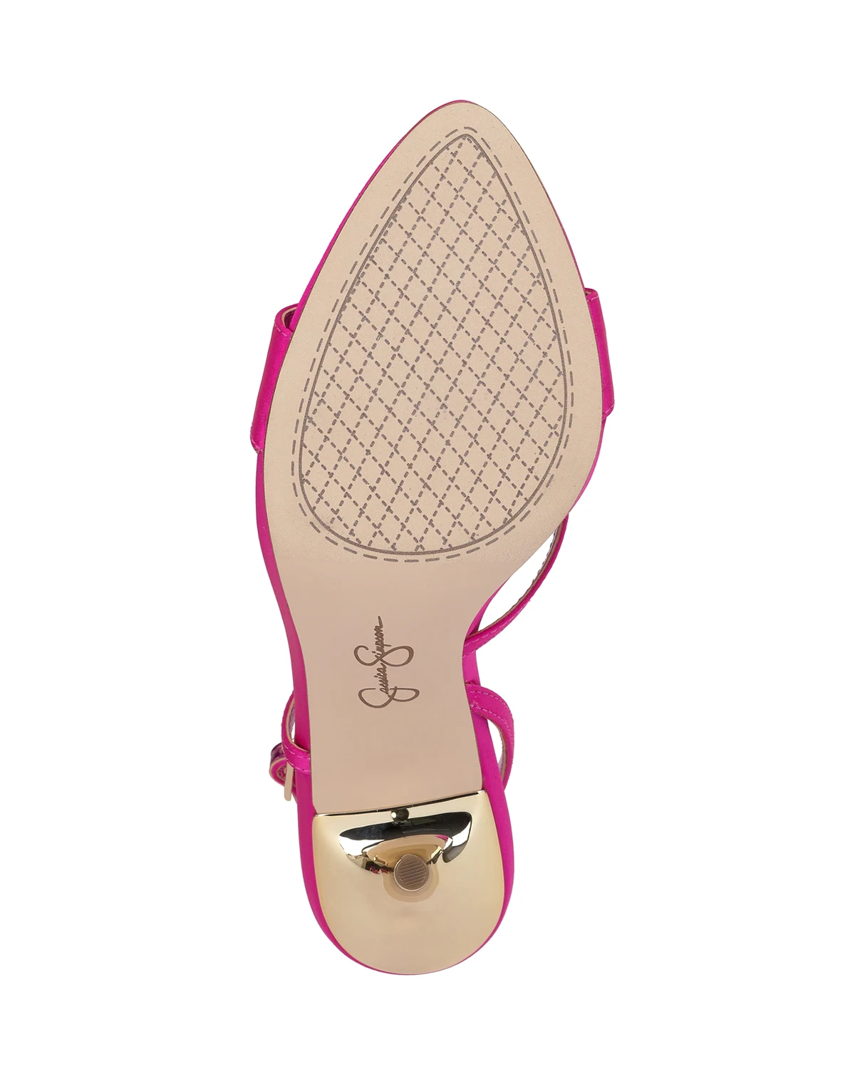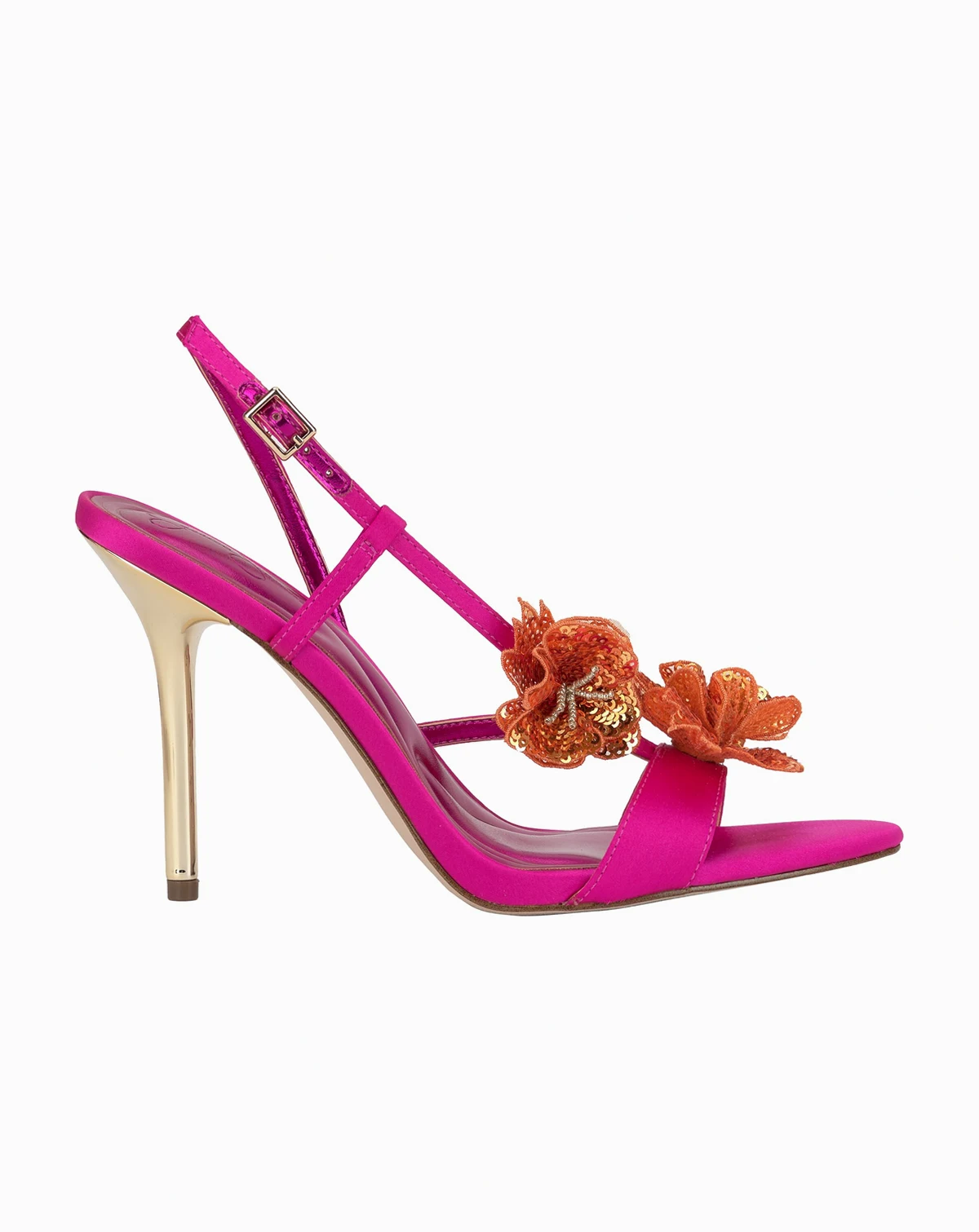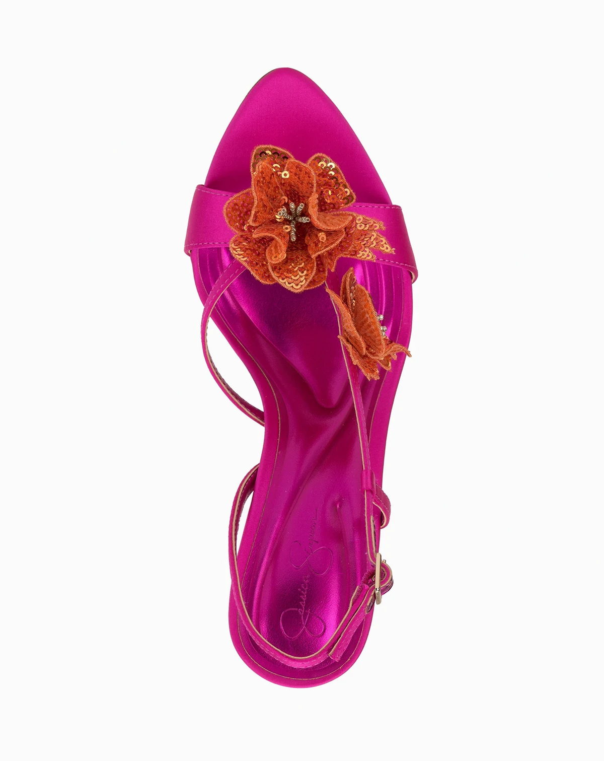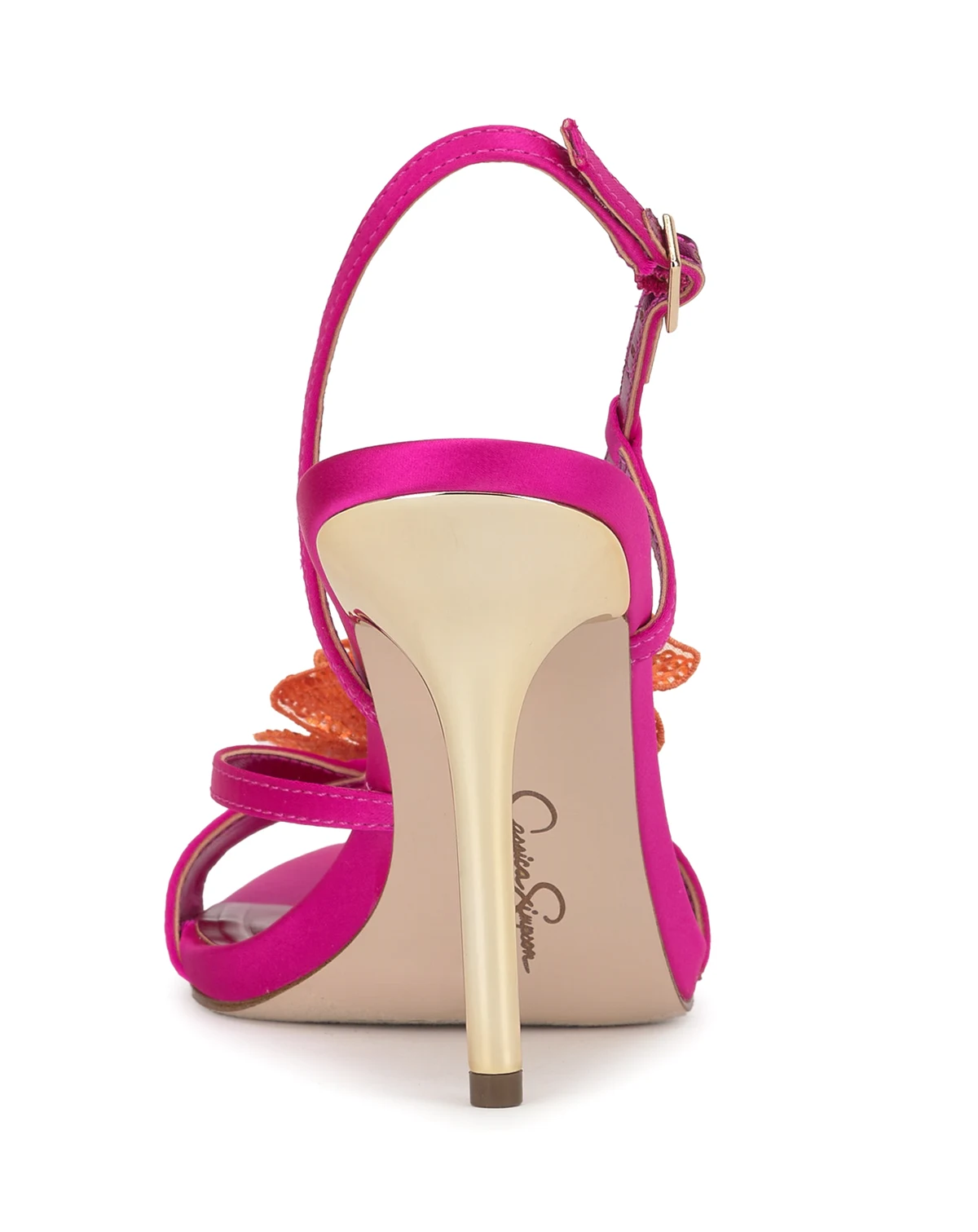 Adorned with sequin flowers and a slender stiletto heel, these Jessica Simpson sandals feature an adjustable buckle strap. The pointy toe design provides a glamorous look for special occasions.