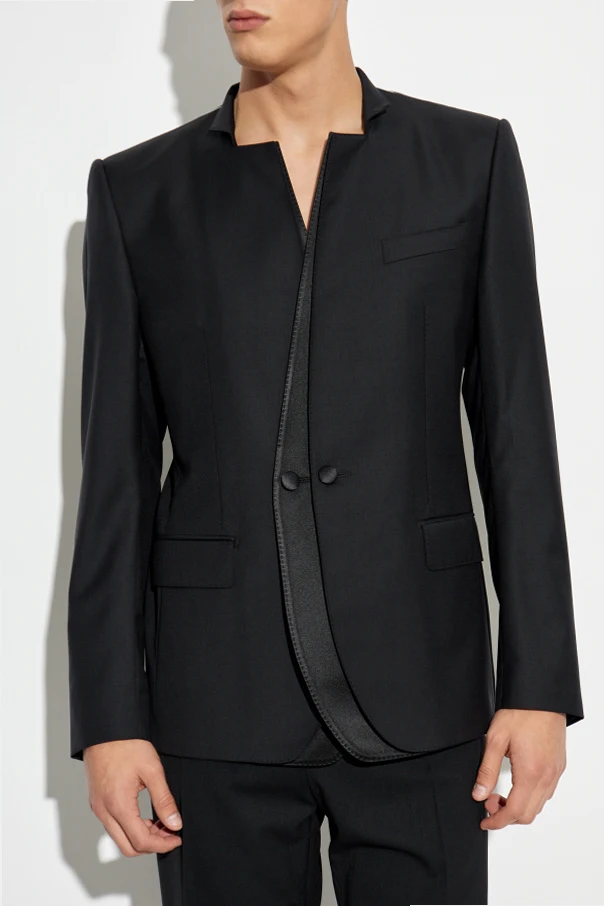 The blazer features an elegant, classic cut with straight lines, accentuated by a high stand-up collar in lieu of a traditional lapel, imparting a contemporary edge. The unique two-button closure is set on a narrow, ornamental panel, adding a touch of avant-garde charm.
