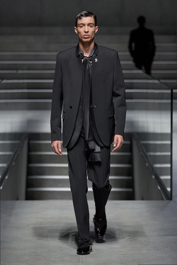 The back of the blazer maintains a clean, minimalist style with a straight line, devoid of additional seams or vents, emphasizing the streamlined silhouette. Perfectly tailored, this blazer fits the body impeccably, as showcased in our model's ensemble paired with black trousers and a white shawl-collared shirt, ideal for formal occasions.