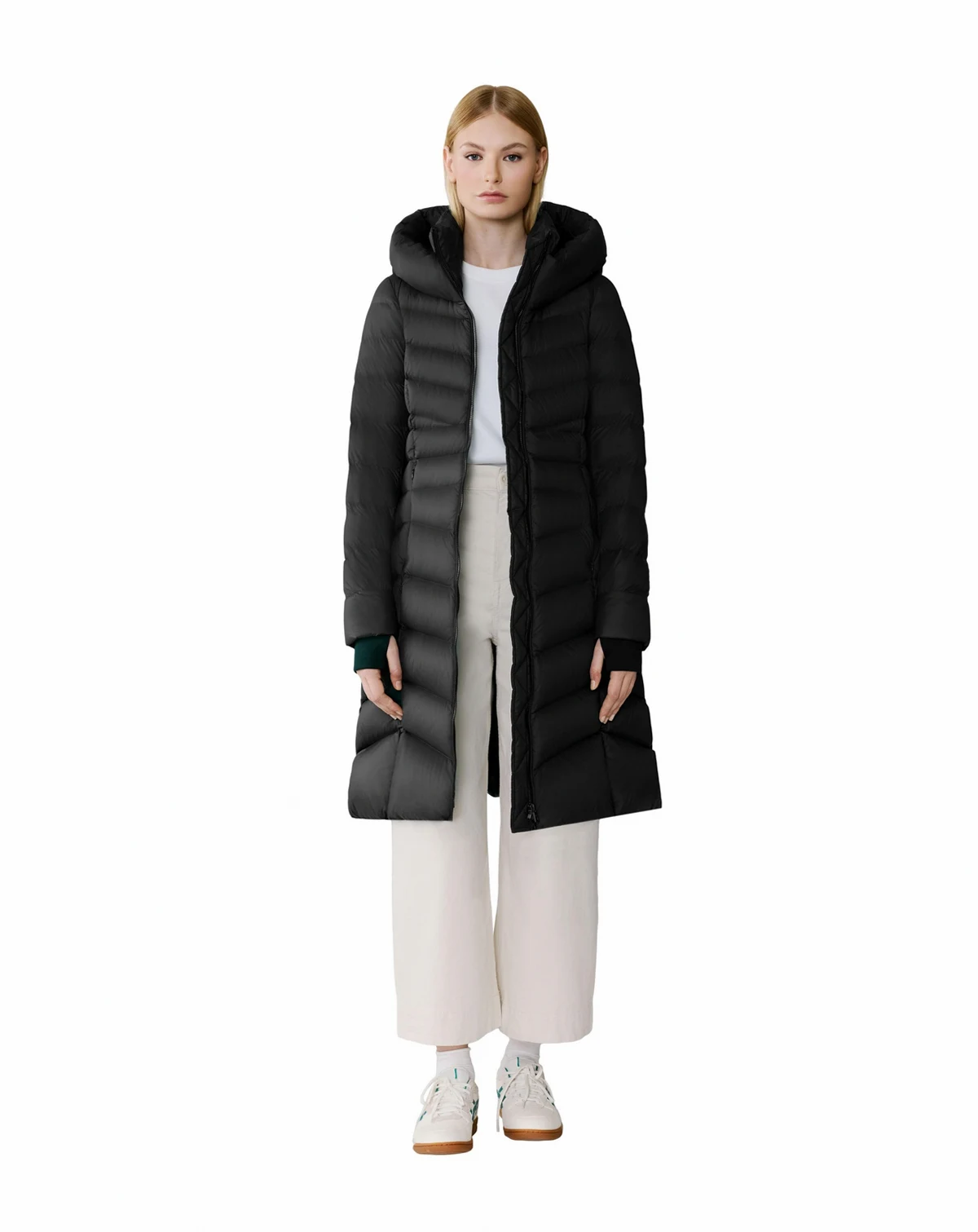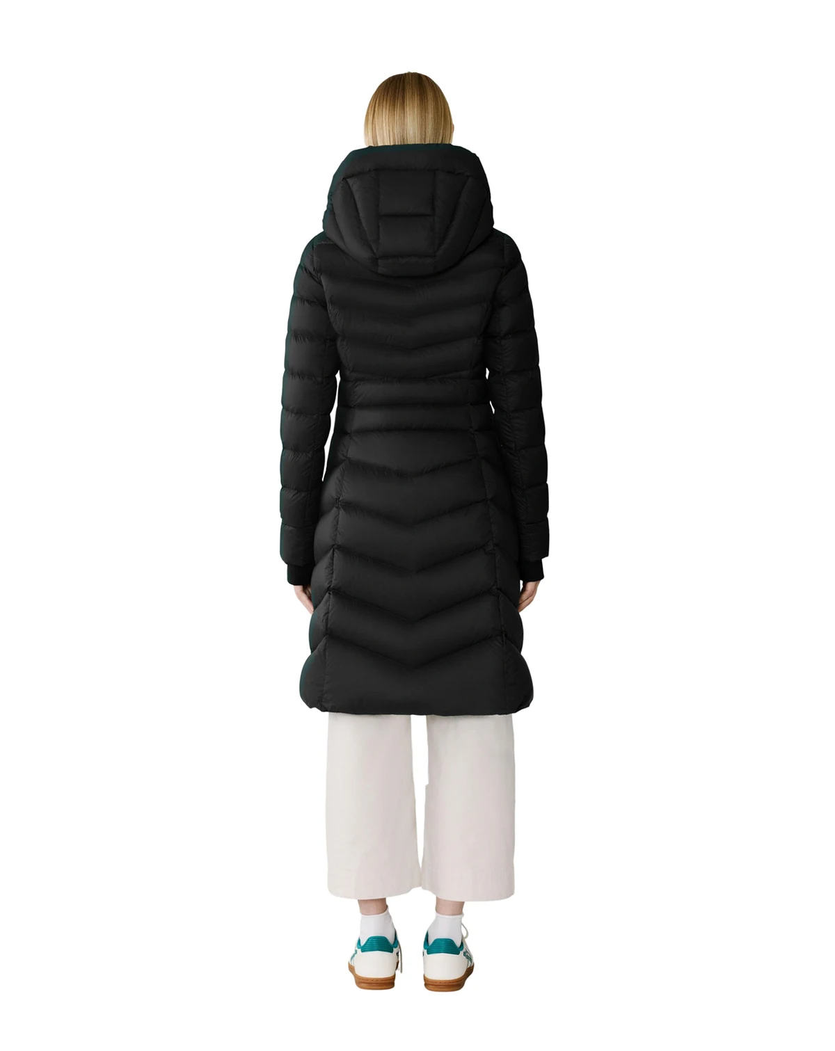 The LITA-U by SOIA & KYO combines fit & flare silhouette with variated chevron quilting and a hood. Made from 100% nylon, this coat offers water repellency, down-proof fabric, and RDS-certified down filling, rated for -15°C warmth.