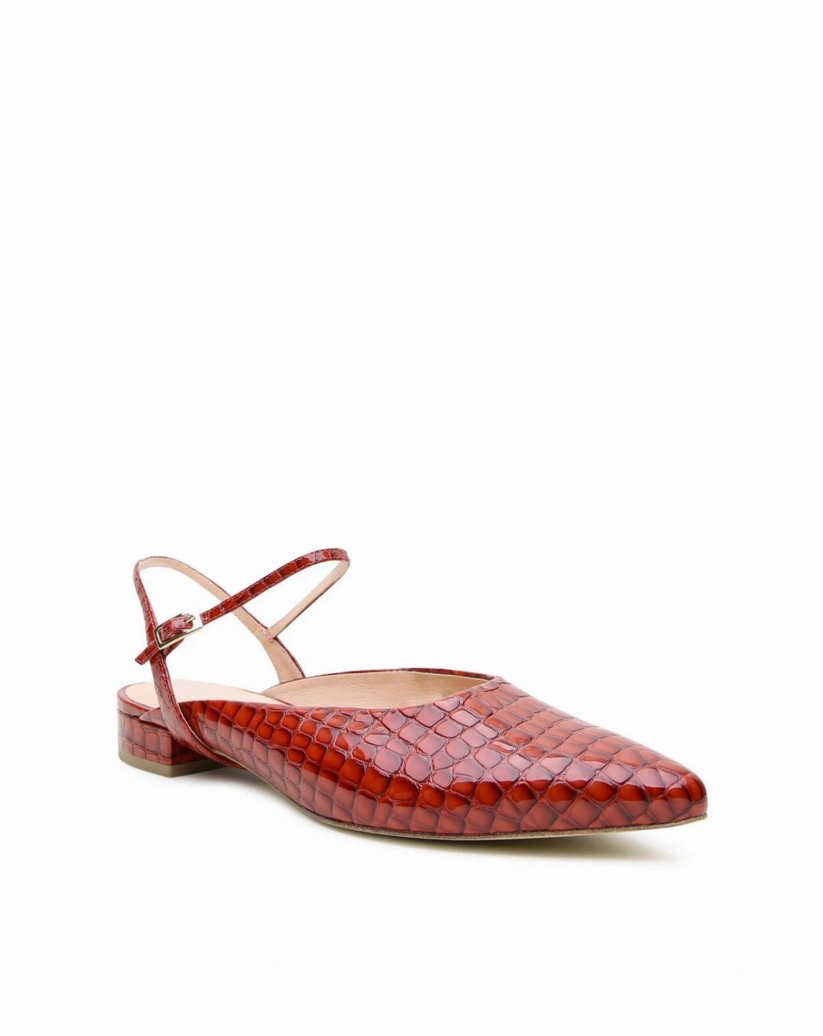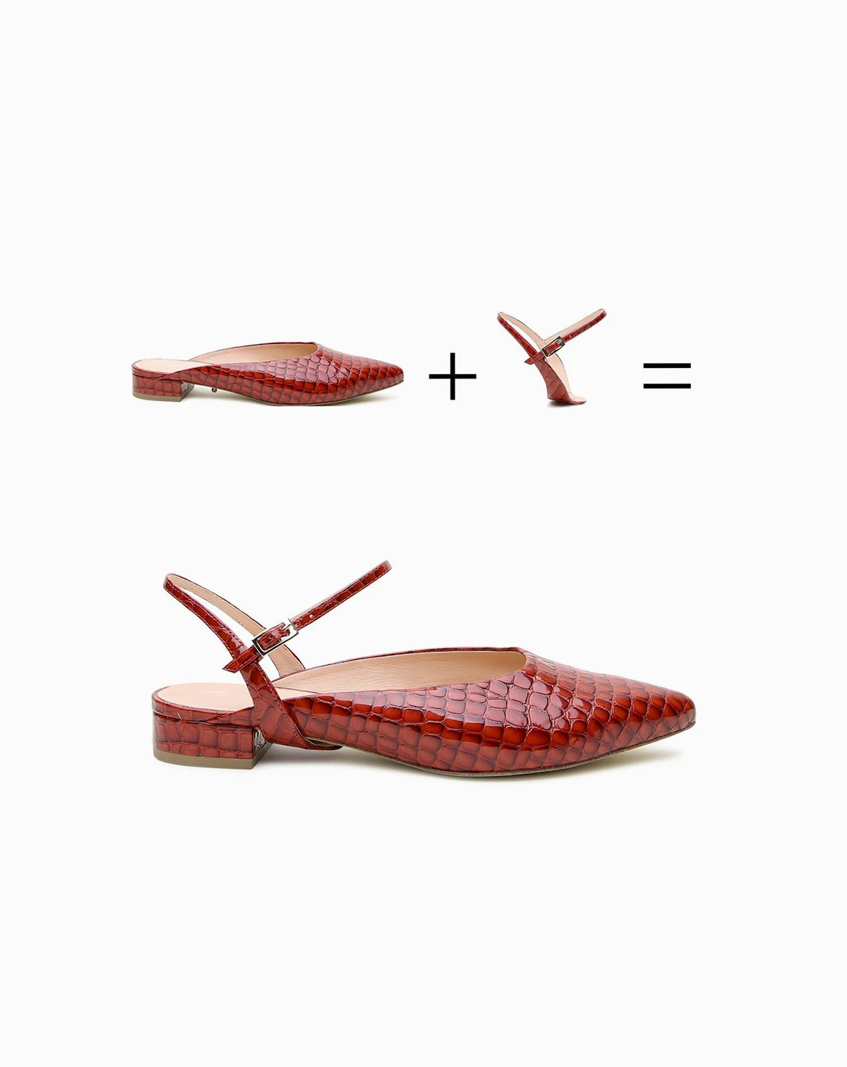 Slip on these 2-in-1 pointed patent leather slides when you're on the go or wear it all day with the matching Amal strap. The embossed print has a sheen to emulate crocodile without using exotic leather. The design features leather that may feel snug at first but softens and molds to your foot over time. If you re between sizes, we recommend sizing up for the best fit To make them ultra comfortable, the toe point is also extended so your toes are not squished. Customize this shoe by swapping the detachable strap for any other Alterre strap, sold separately.
