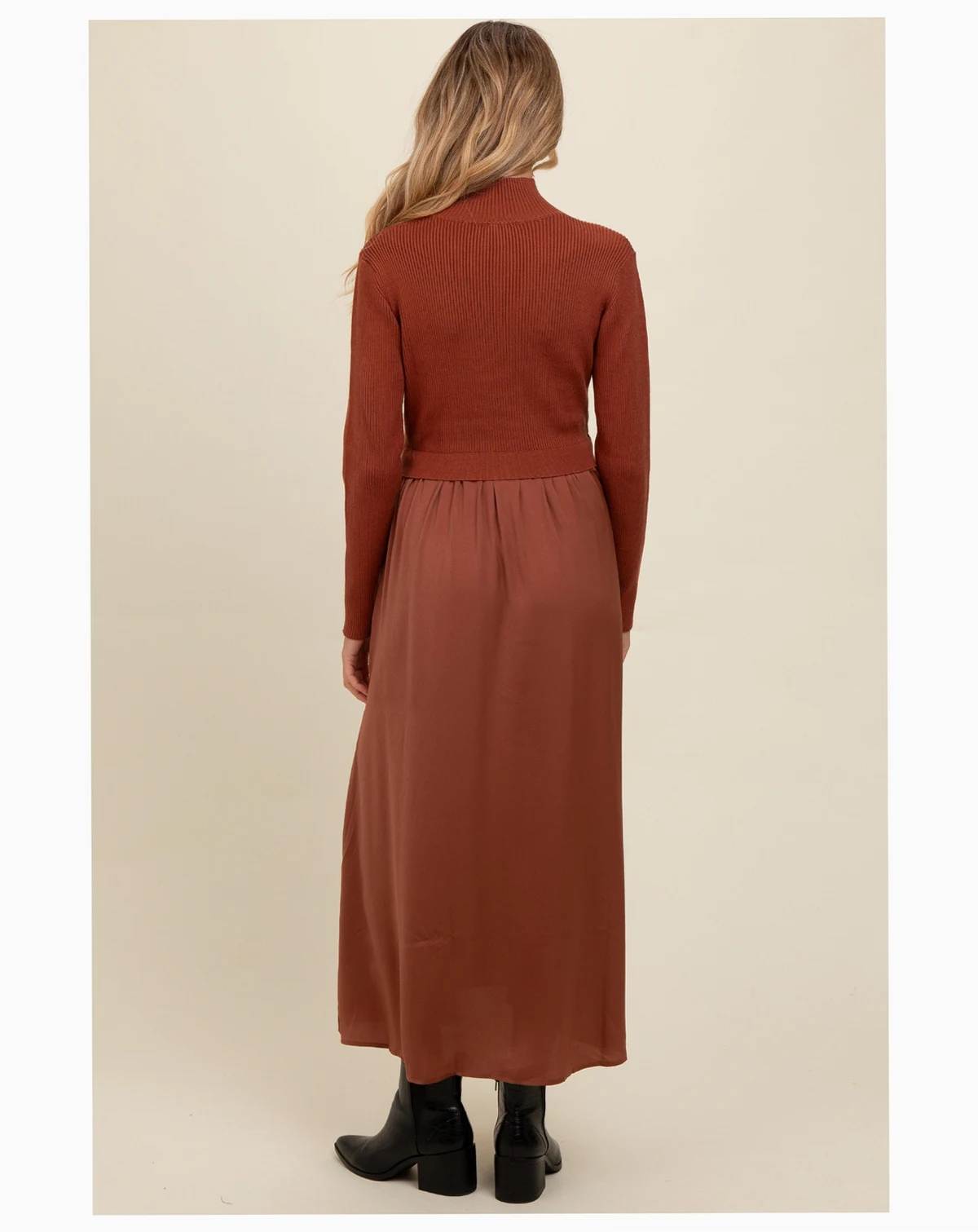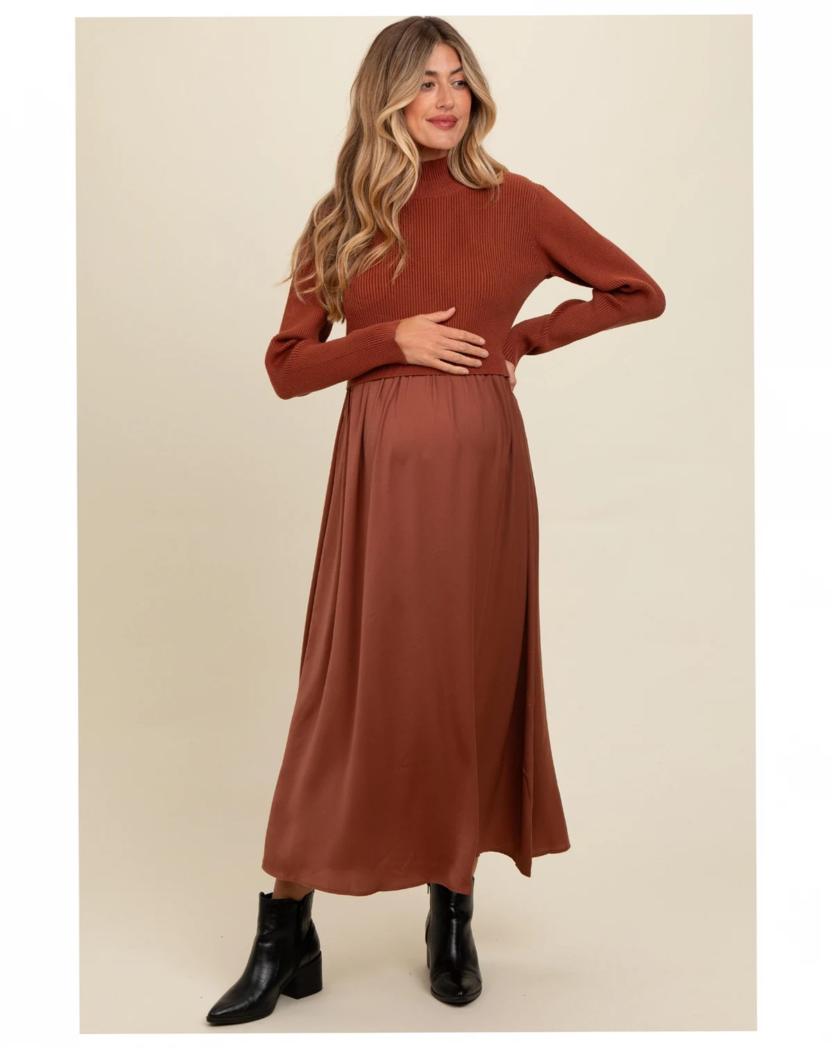 Elevate your maternity style with our Knit Contrast Top Satin Maternity Midi Dress! Designed for both comfort and elegance, this dress features a cozy knit bodice with long sleeves and a flattering scoop neckline. The smooth satin skirt in a chic midi length drapes beautifully over your bump, offering plenty of room to grow. Perfect for baby showers, brunches, or special evenings out, the unique mixed-media design makes this dress a standout choice throughout your pregnancy and beyond. Pair with your favorite boots or heels for a truly stunning look!